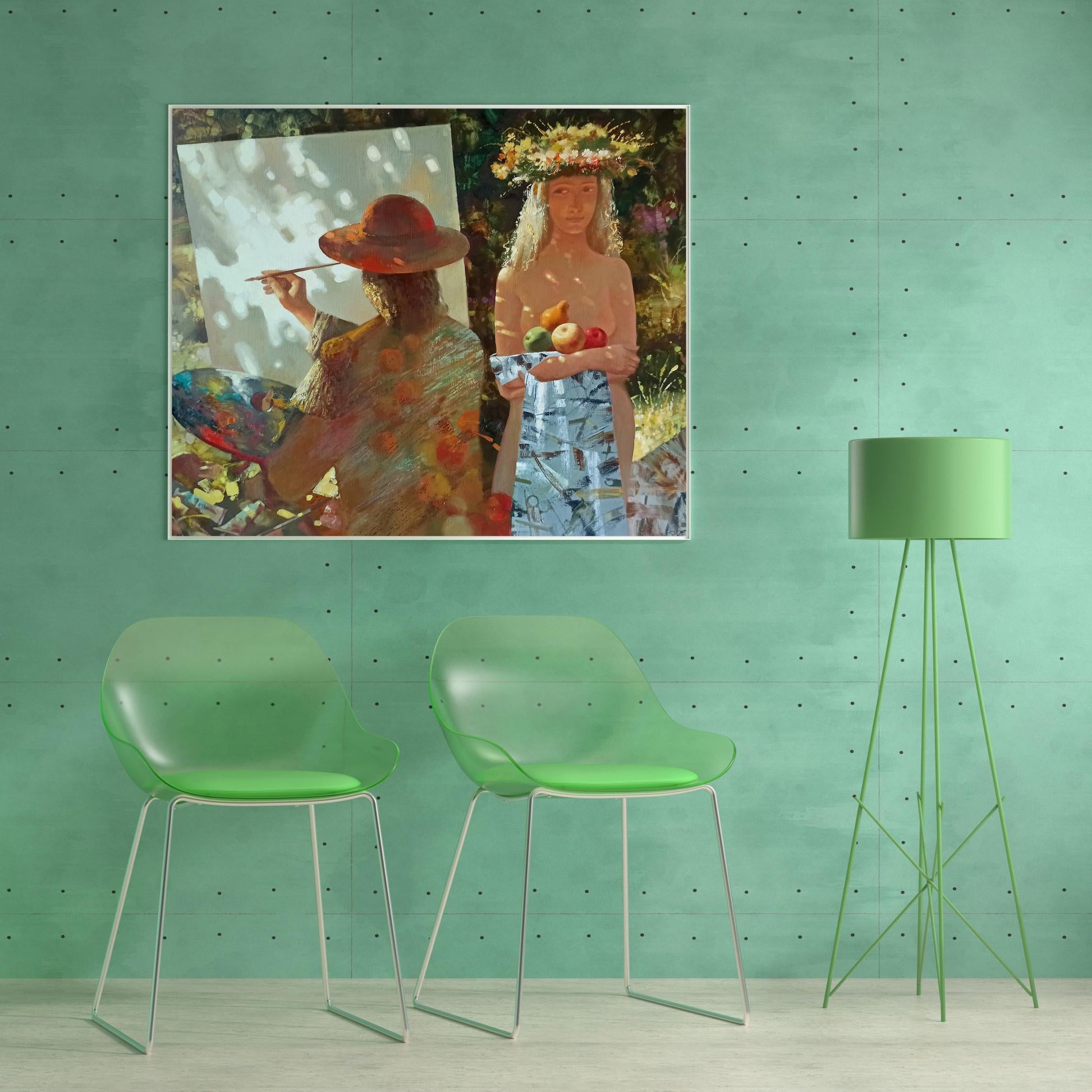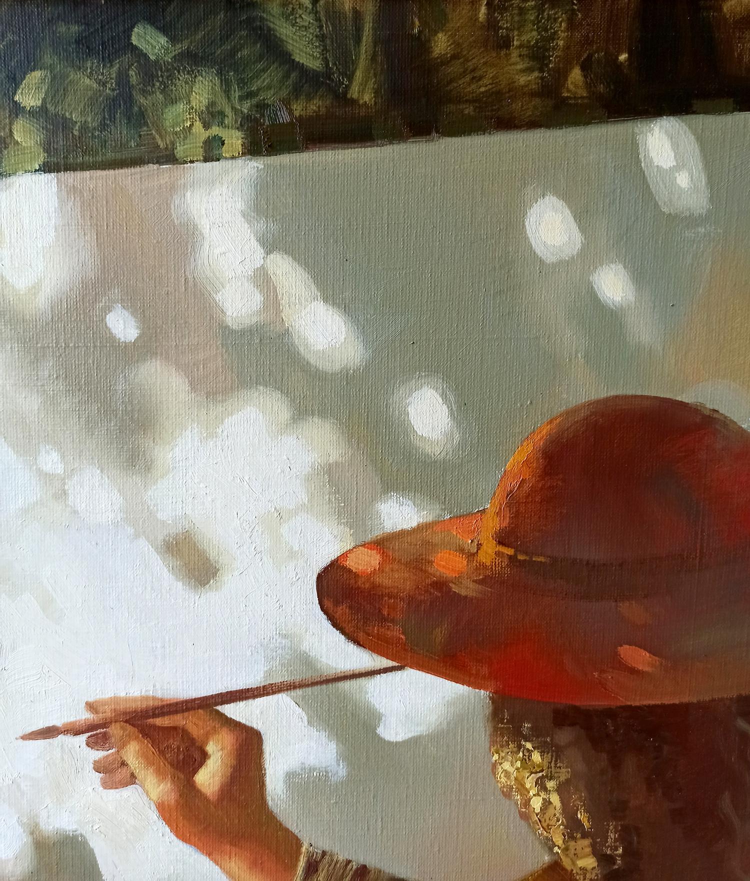 "Apple Saved" is an enchanting oil painting by Anatoly Borisovich Tarabanov that beautifully encapsulates the essence of artistic creation and the tranquil focus it demands. This masterpiece portrays a woman artist deeply engrossed in her craft, with the presence of summery apples adding a layer of warmth and fruition to the scene. It's a vivid representation of the artist and her model in a moment suspended in time, surrounded by the symbolic fruits of creativity and labor.
