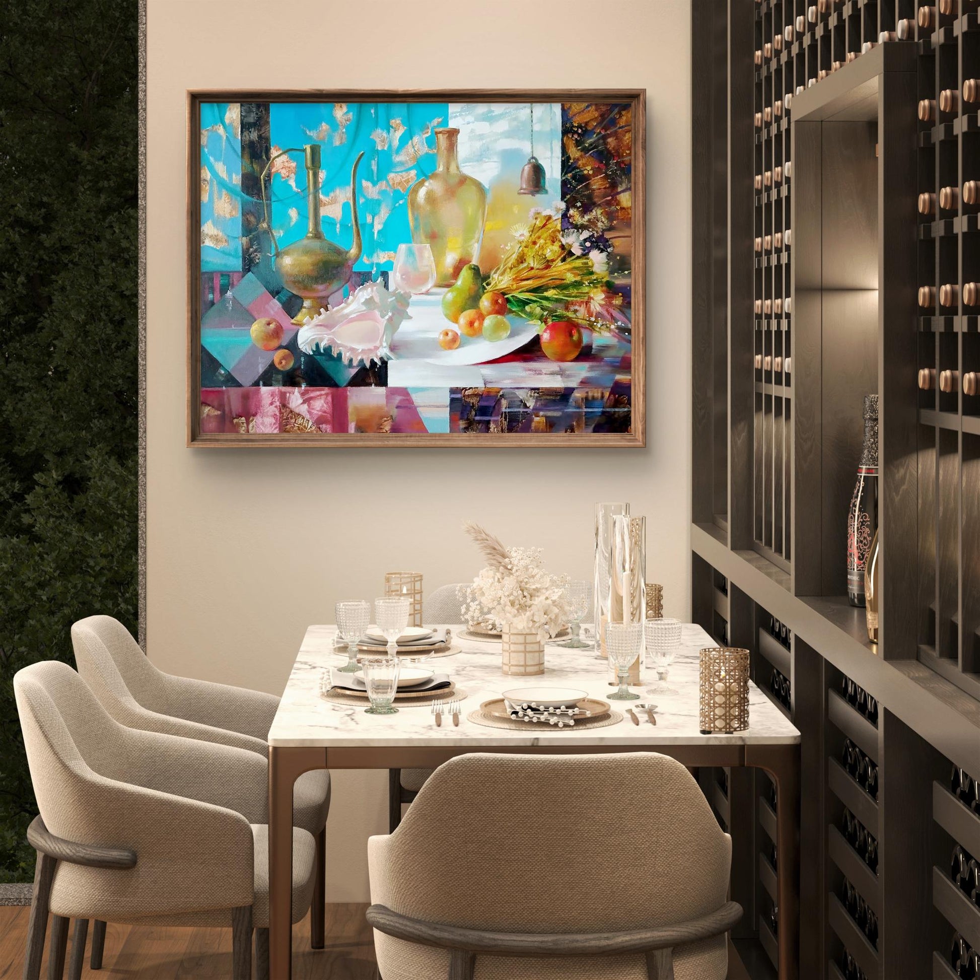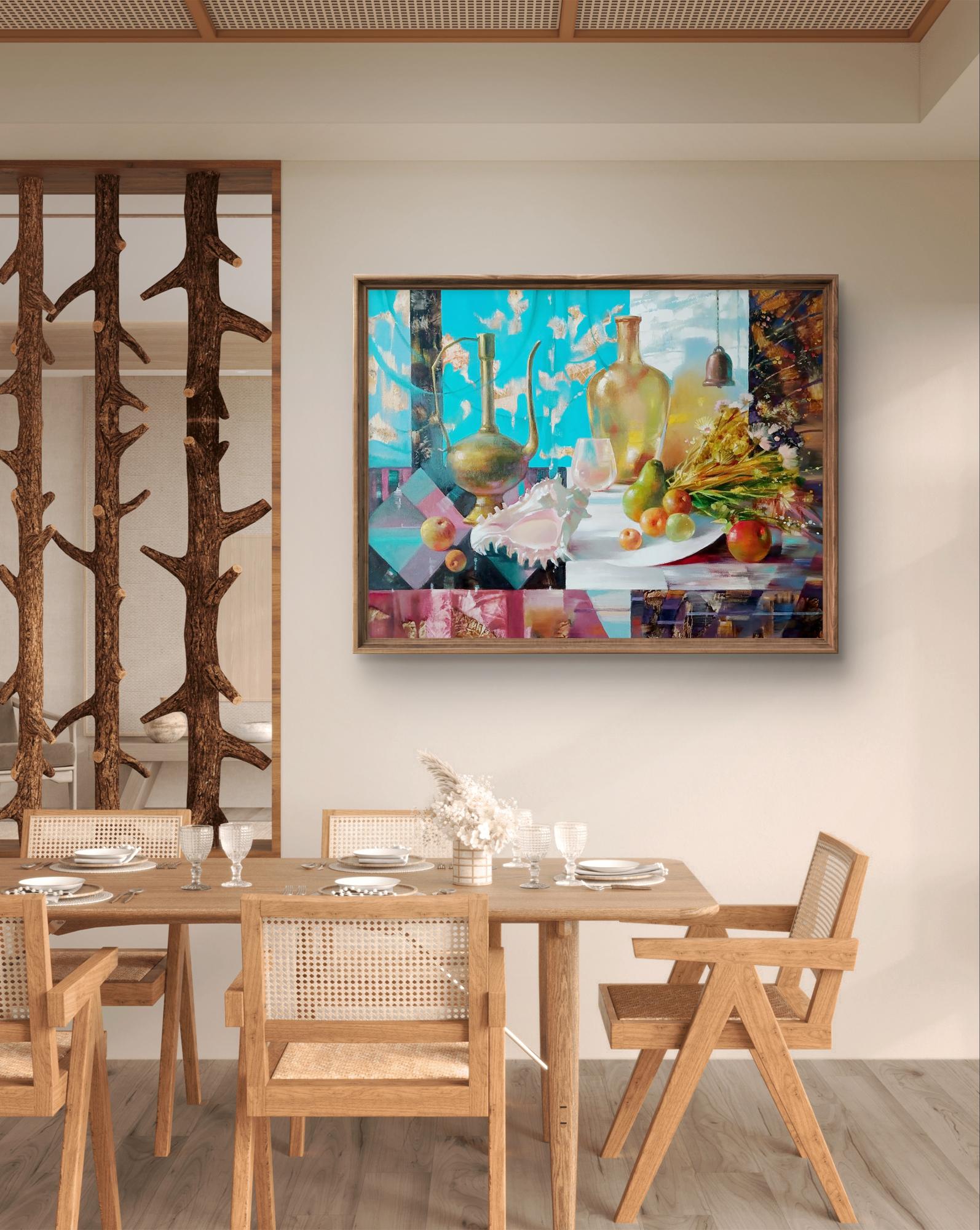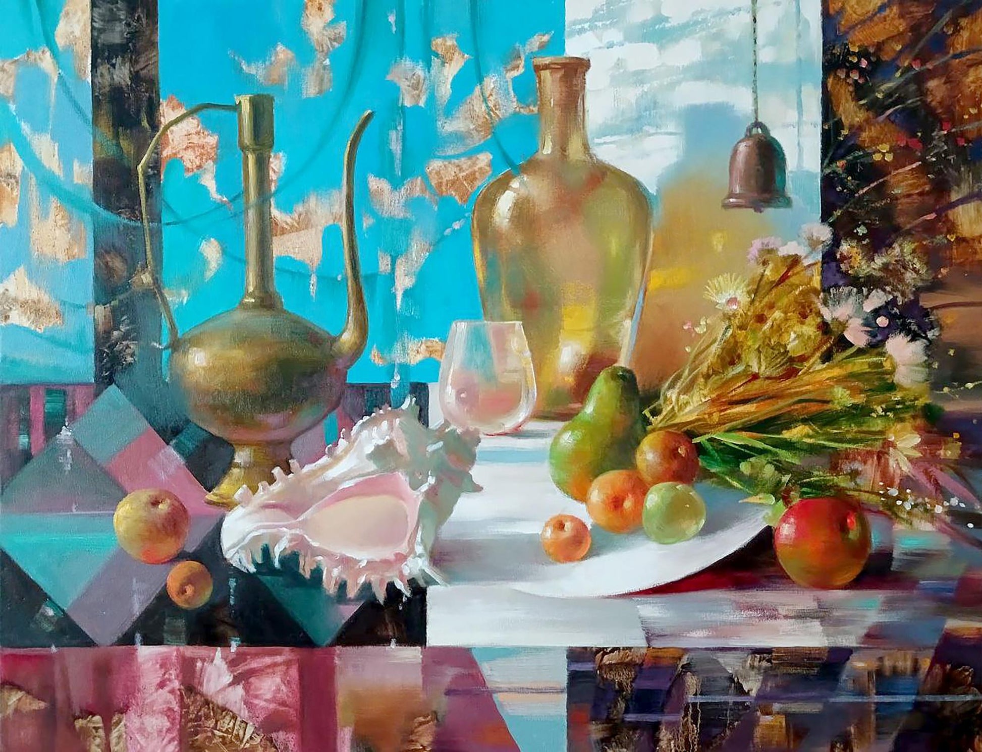 "Bright Morning" is a radiant still life painting that captures the serene and refreshing essence of a new day. The composition is a harmonious blend of various elements meticulously arranged to evoke a sense of calm and beauty. In the center of the painting, a polished brass pitcher and a translucent glass vase stand tall, their reflective surfaces capturing the light and adding a touch of elegance. Next to them, a conch shell, painted in delicate hues of pink and white, brings a coastal charm to the scene. The shell's intricate textures contrast beautifully with the smooth surfaces of the glass and metal objects. The foreground features a white plate laden with fresh fruits: a pear, apples, and oranges. The fruits are painted with vibrant, lifelike colors, showcasing their natural beauty. Beside the plate, a small bouquet of wildflowers adds a touch of rustic charm, their soft petals and green stems providing a natural counterpoint to the structured forms of the other objects. The background is a brilliant blue, reminiscent of a clear morning sky, with abstract patterns and light reflections that suggest the gentle movement of the air and the play of sunlight. The abstract elements in the background are composed of geometric shapes and patches of warm and cool tones, creating a dynamic interplay between the different components of the painting. To the right, a hanging bell subtly hints at the start of a new day, its metallic sheen catching the light. The overall composition is balanced and inviting, with each element thoughtfully placed to draw the viewer's eye around the scene. "Bright Morning" captures the essence of a tranquil morning, filled with light, freshness, and the simple beauty of everyday objects. The painting invites viewers to pause and appreciate the quiet moments of the morning, celebrating the beauty found in ordinary things when viewed through the lens of artistry and light.