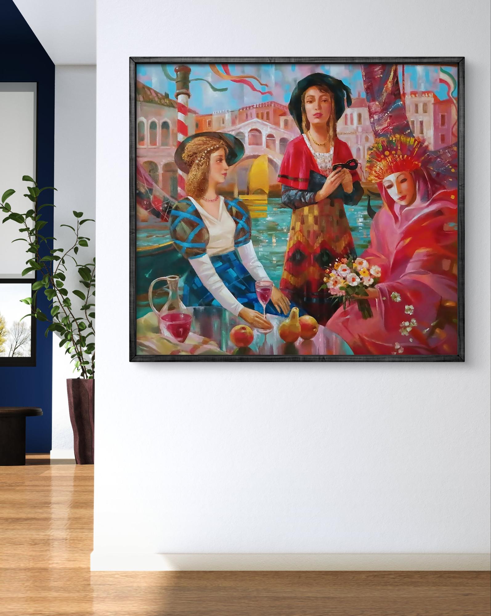 The painting titled "Carnival in Venice" captures the elegance and enchantment of the famous Venetian Carnival, where tradition, mystery, and celebration intertwine. The artist masterfully brings to life three women dressed in exquisite period costumes, set against the backdrop of Venice’s iconic canals and architecture. The scene radiates romanticism, cultural richness, and festive joy, immersing the viewer in the timeless charm of Venice. At the heart of the painting are three elegantly dressed women participating in the Carnival celebration. Each woman embodies a different mood and personality: The Lady in Blue: Sitting gracefully at the table, she wears a blue checkered dress with a wide-brimmed hat adorned with pearls. Her gentle expression conveys a sense of calmness and curiosity as she holds a glass of red wine and listens attentively to the conversation. The Woman in Red and Black: Standing in the center, she exudes confidence and mystery, holding a Venetian mask in her hands. Her bold attire and direct gaze draw the viewer’s attention, making her the central figure of the composition. The Masked Woman in Pink: Sitting to the right, she is dressed in an elaborate pink costume with a feathered headdress. Her delicate face, partly hidden behind the mask, adds an air of mystery and intrigue. She holds a bouquet of fresh flowers, symbolizing beauty and grace. In the background, the famous canals of Venice are depicted, complete with gondolas, bridges, and colorful buildings. Flowing ribbons in the sky suggest movement, festivity, and joy, while the reflections on the water add depth and vibrancy to the scene. The painting evokes a sense of celebration, romance, and mystery, characteristic of the Venetian Carnival. The rich colors and luxurious details of the costumes create a theatrical and elegant atmosphere. The scene feels like a snapshot of a magical moment in time, where people gather to celebrate life, art, and tradition. The artist uses a vibrant and harmonious color palette, with a dominance of warm reds, blues, and pinks that reflect the festive spirit of the carnival. The brushstrokes are soft and precise, capturing both the textures of fabrics and the shimmer of water. The use of light and shadow enhances the three-dimensional effect, making the figures appear lifelike and dynamic. "Carnival in Venice" is a captivating portrayal of one of the most iconic festivals in the world. Through elegant figures, rich costumes, and a picturesque backdrop, the painting transports the viewer to the romantic and mysterious streets of Venice. The artwork celebrates tradition, beauty, and the human desire for joy and expression, making it a timeless piece that embodies the spirit of the Venetian Carnival.