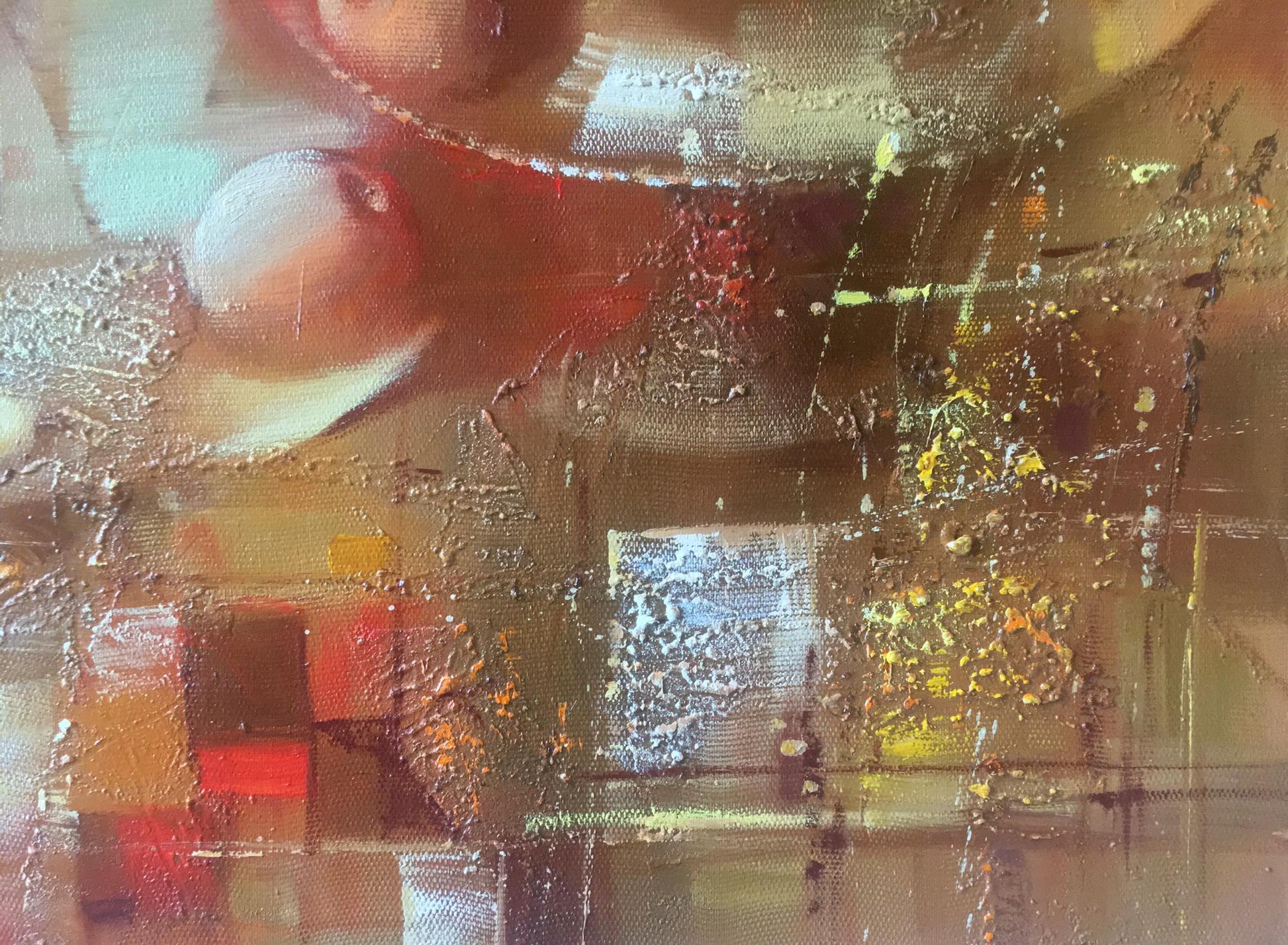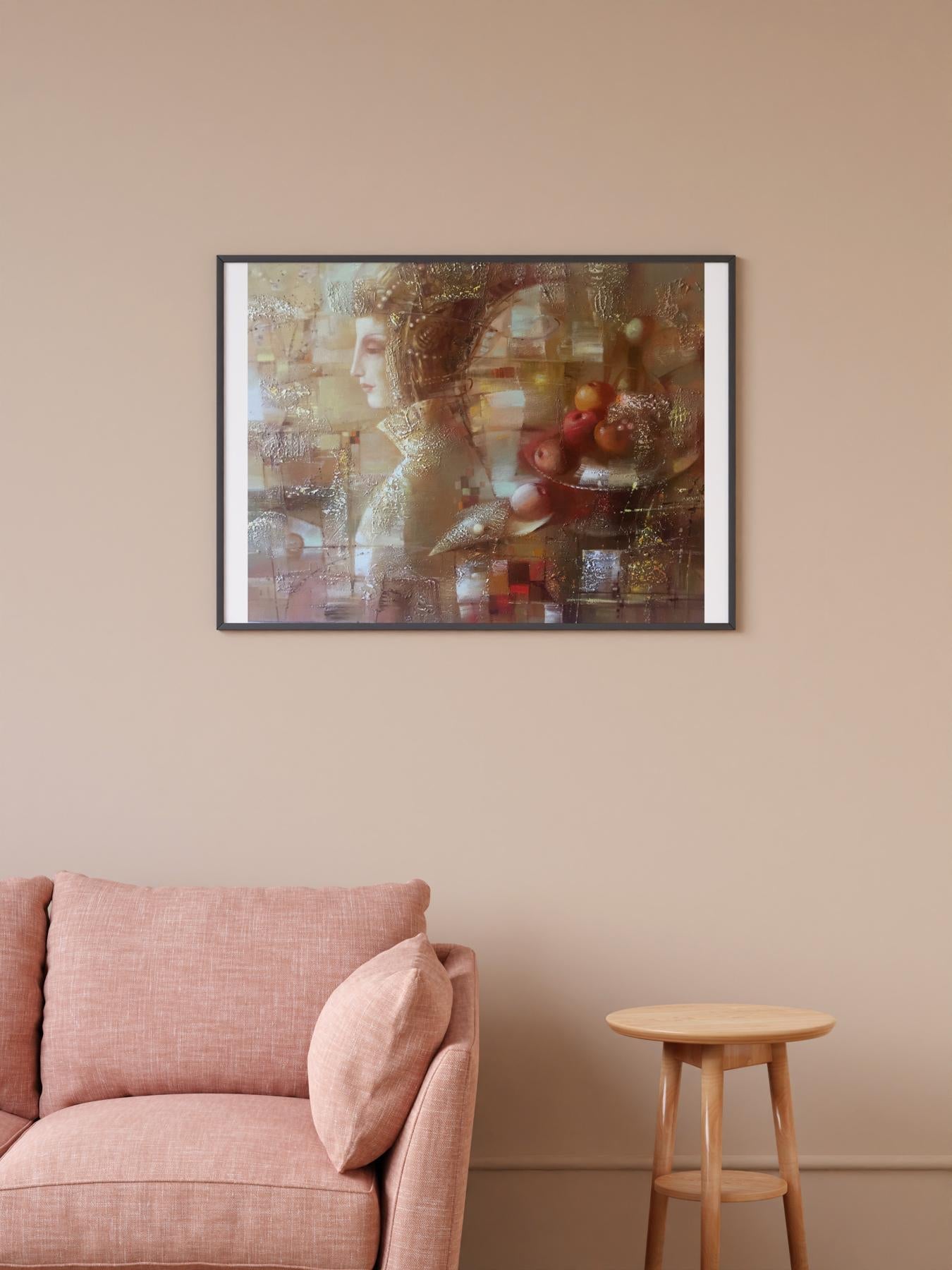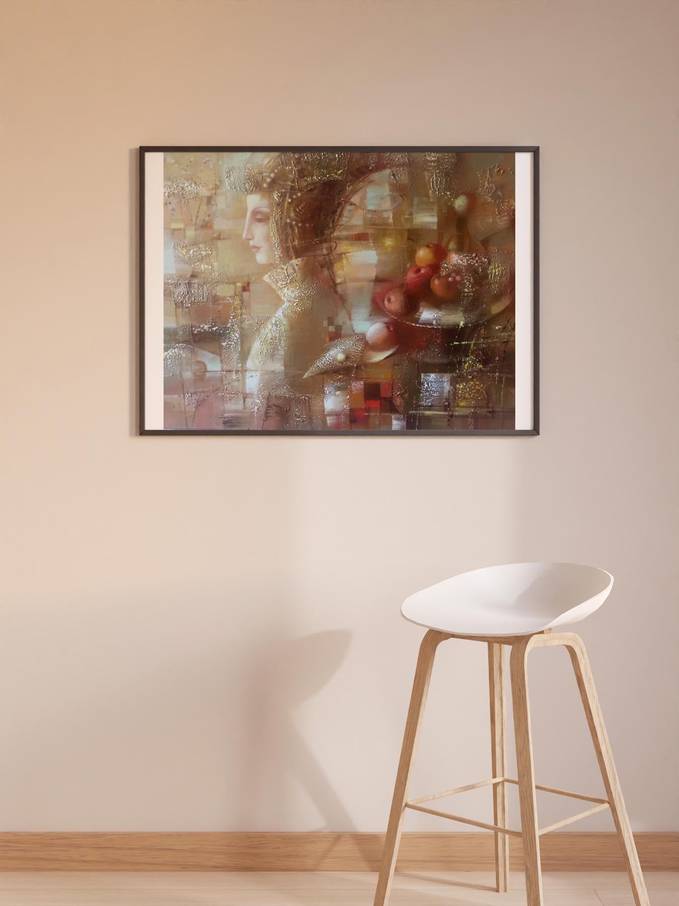 Our oil painting "Female profile" is a beautiful and creative piece that will add a touch of elegance to any home. The silhouette of a woman in the picture is both mysterious and intriguing, while the apples add a touch of color and life to the painting. The abstraction in the background makes the painting even more interesting and provides an element of mystery. The Oil painting is sure to be a conversation starter and will make a great addition to any home.