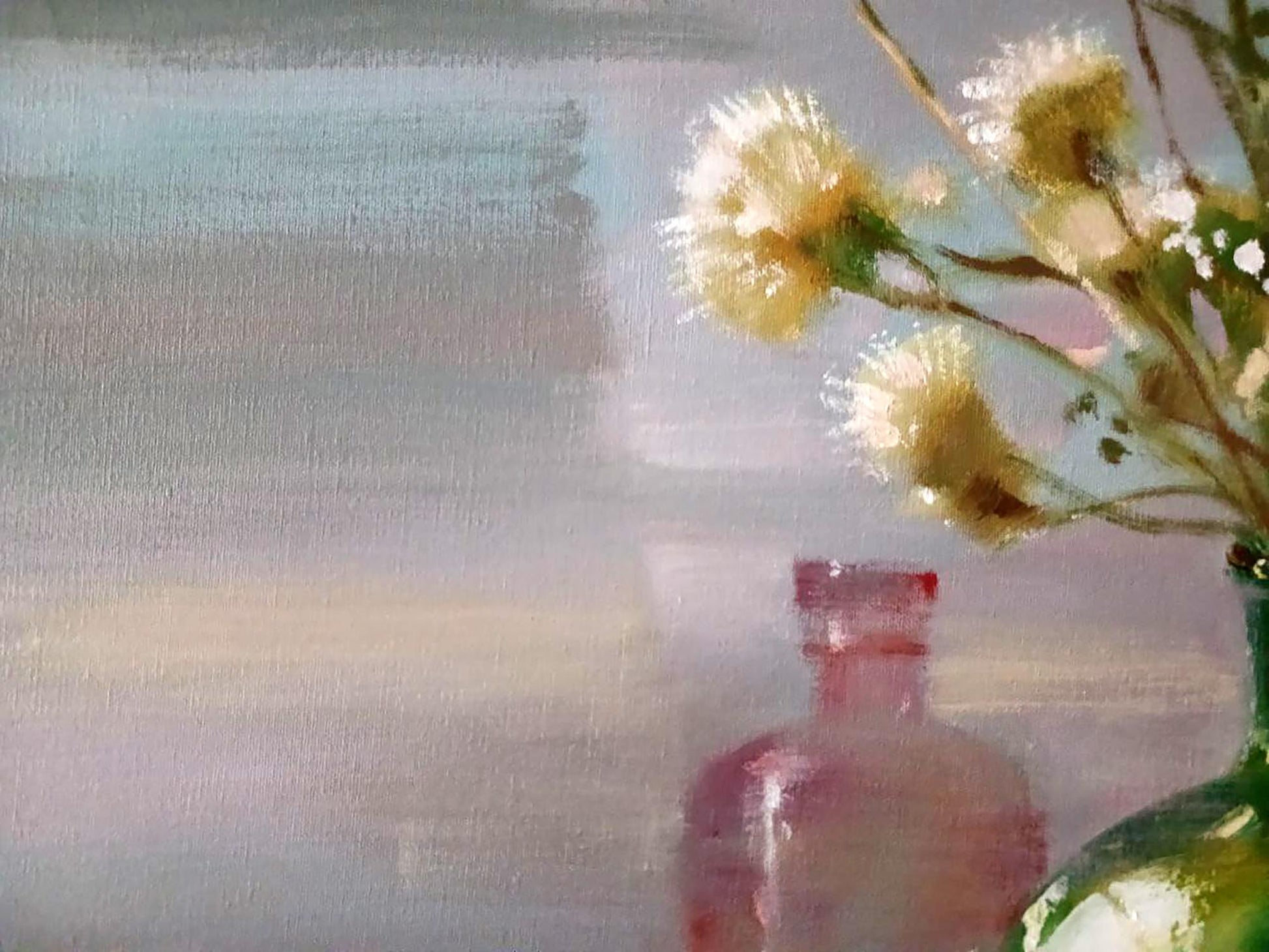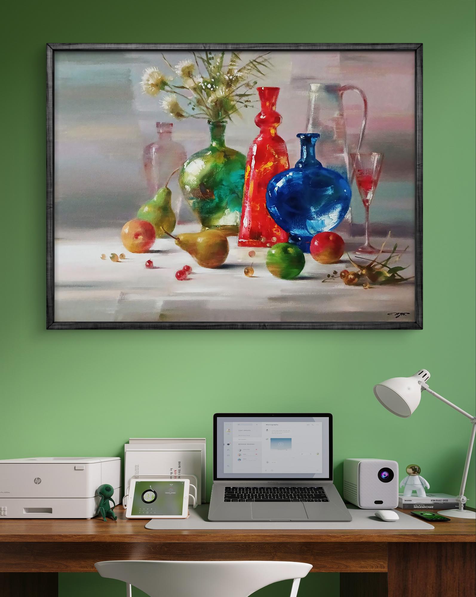The painting titled "Fruit Still Life" beautifully captures a harmonious arrangement of fruits, glass bottles, and delicate flowers on a soft, neutral background. The artwork combines elements of traditional still life with a modern color palette and expressive brushwork, creating a sense of refined elegance and contemporary charm. The centerpiece of the painting is a group of vibrantly colored glass bottles in shades of emerald green, bright red, and deep blue, each with a unique shape and texture that catches the light beautifully. Surrounding the bottles are a variety of fruits, including ripe pears, apples, and berries, carefully placed to create a balanced and inviting composition. A delicate bouquet of white flowers in a green vase adds a touch of natural softness, contrasting with the polished surface of the glass. The artist uses a soft, muted background to allow the rich, saturated colors of the glass and fruit to stand out. The green, red, and blue tones of the bottles create a vivid focal point, while the warm earthy hues of the fruits add depth and warmth to the painting. The light reflections on the glass surfaces are rendered with precision, showcasing the artist's skill in capturing transparency and light effects. The gentle blending of colors and smooth transitions between light and shadow give the painting a realistic yet artistic feel. The painting evokes a feeling of calm and refinement, inviting the viewer to appreciate the simple beauty of everyday objects. The play of light on glass and fruit suggests a sense of quiet elegance and timelessness, reminiscent of classic still life paintings with a modern twist. The scene feels both inviting and serene, making it a perfect piece for contemplative spaces. In still life paintings, fruits and glassware often symbolize abundance, prosperity, and the passage of time. The fragility of glass and the freshness of fruit serve as a reminder of life's fleeting nature and the importance of appreciating simple pleasures. The presence of flowers adds a touch of purity and natural beauty, symbolizing growth and renewal. "Fruit Still Life" is a refined and modern interpretation of the classic still life genre. The vivid colors, delicate details, and masterful handling of light and texture make this painting a captivating and elegant piece, perfect for adding a touch of sophistication to any interior space. The artwork celebrates the simple beauty of everyday objects, encouraging viewers to find joy in the ordinary.