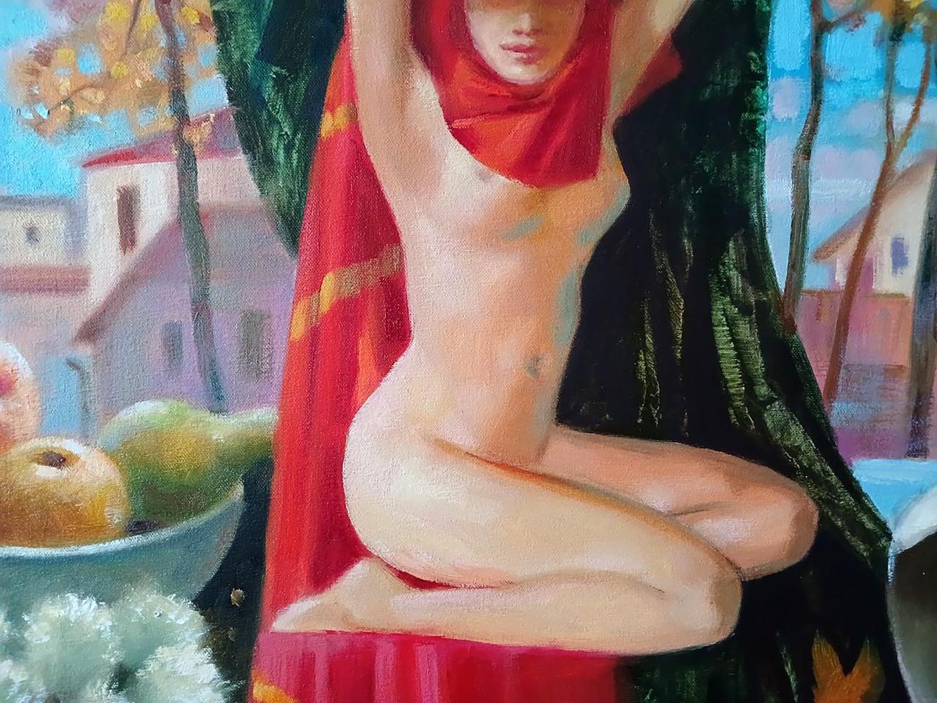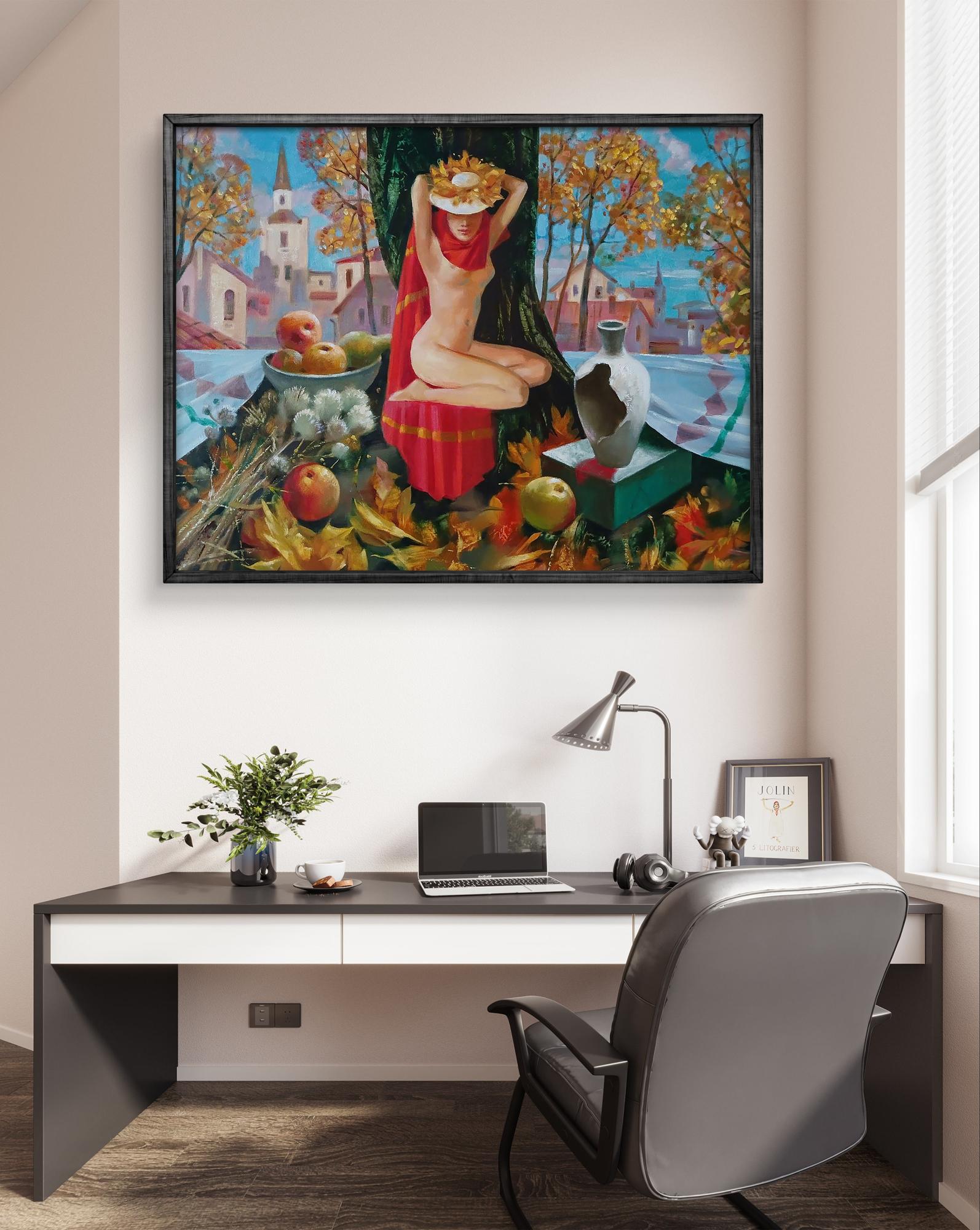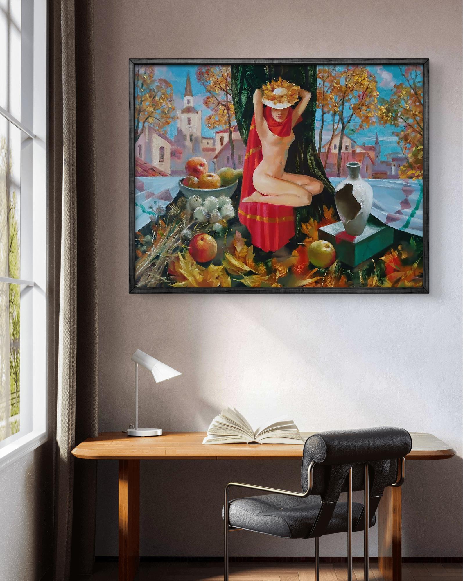 The painting titled "Golden Autumn" is a vivid and symbolic composition celebrating the abundance of nature and the beauty of the fall season. The central figure of a nude woman draped in a red scarf sits gracefully at the base of a large tree. Her posture is serene and contemplative, with a wreath of autumn leaves adorning her head, symbolizing a connection to nature and the cycle of life. The woman exudes grace and harmony, embodying the spirit of the autumn harvest. In the foreground, the artist has placed a still life arrangement featuring ripe apples, dry thistles, and golden leaves scattered across the ground. A broken ceramic vase sits on a pedestal, possibly symbolizing impermanence and transformation, which are themes often associated with autumn. The red drape covering the woman adds warmth and passion to the scene, contrasting with the cool blues of the sky and the pastel shades of the village in the background. The village scene in the background, with its church spire and cozy houses, evokes a sense of peace and community, hinting at the artist's nostalgic reflection on traditional rural life during the autumn season. The tall trees with golden leaves frame the composition beautifully, enhancing the sense of natural balance and tranquility. The painting radiates a warm, peaceful atmosphere, capturing the essence of autumn with its rich colors and natural motifs. The scene invites the viewer to reflect on the changing seasons, the beauty of nature, and the human connection to the earth's cycles. The woman's peaceful expression and the abundance of fruit and leaves create a feeling of gratitude and contentment. The color palette is dominated by warm earthy tones such as golden yellows, deep reds, and soft browns, which contrast with the cool blues and soft pinks of the background. The use of light and shadow creates depth and adds a realistic touch to the painting, while the expressive brushstrokes lend a sense of movement and life to the composition. The soft blending of colors gives the piece a dreamlike quality, making the scene feel timeless and serene. The painting is rich in symbolism. The autumn leaves and apples represent the harvest season and the fruitfulness of life, while the broken vase may symbolize the fragility of beauty and the passage of time. The nude figure represents purity and a return to nature, emphasizing a harmonious relationship with the natural world. "Golden Autumn" is a captivating celebration of nature, beauty, and the changing seasons. The painting captures the essence of fall through its warm colors, symbolic elements, and peaceful composition. It invites viewers to reflect on the cycle of life, the abundance of the harvest, and the serenity of rural life during autumn. The artwork is both a tribute to nature's beauty and a meditation on time, change, and renewal.