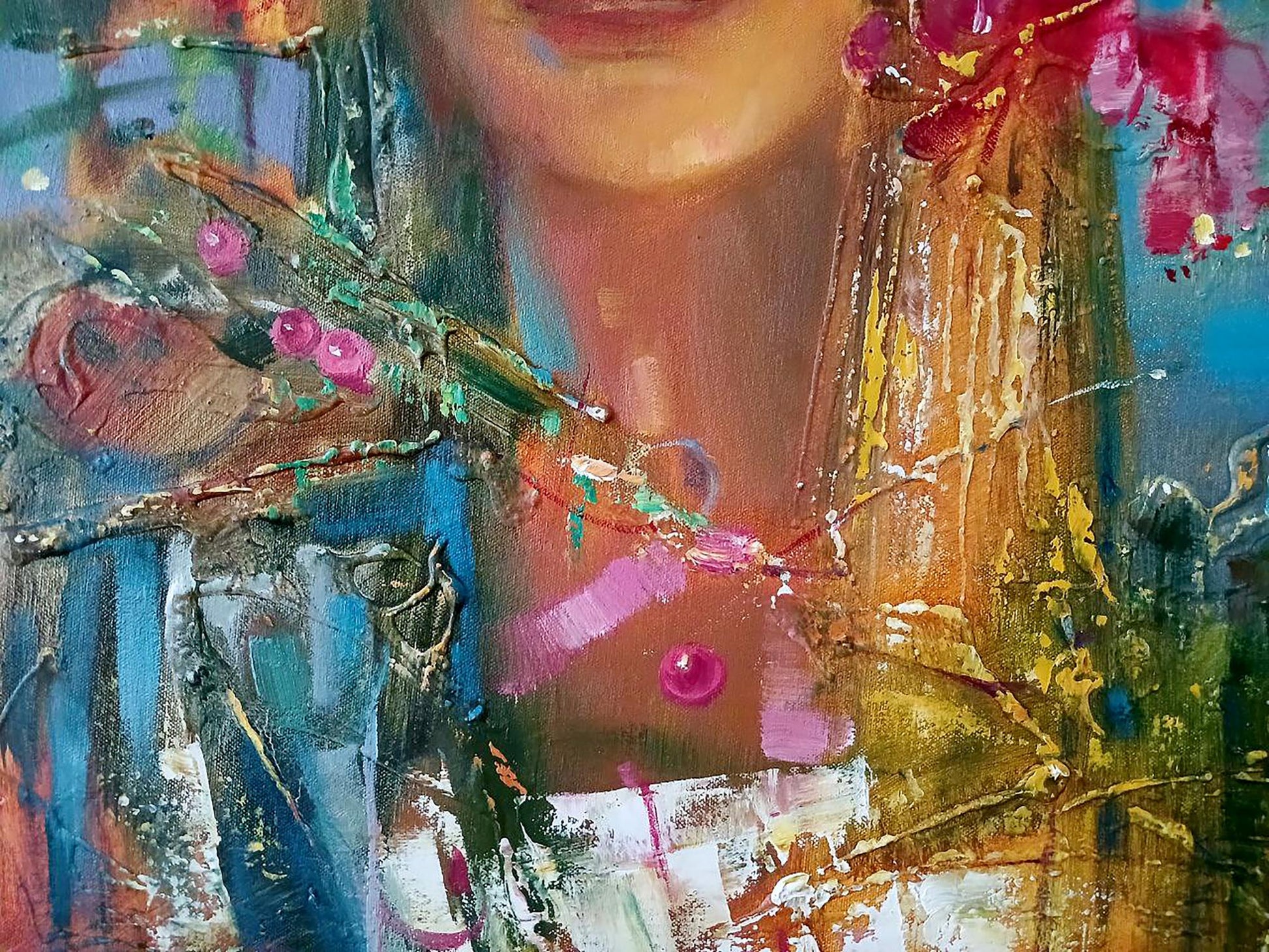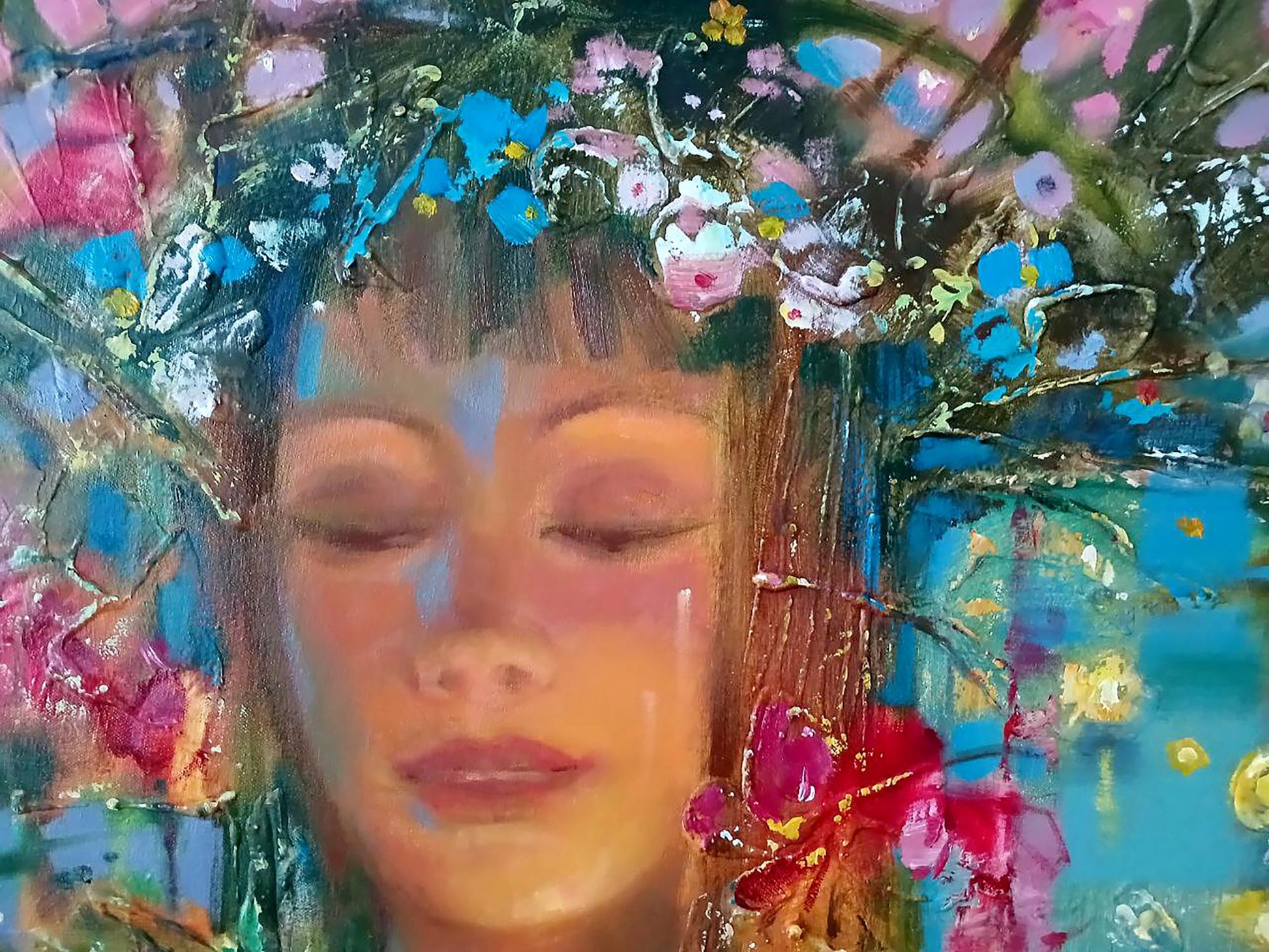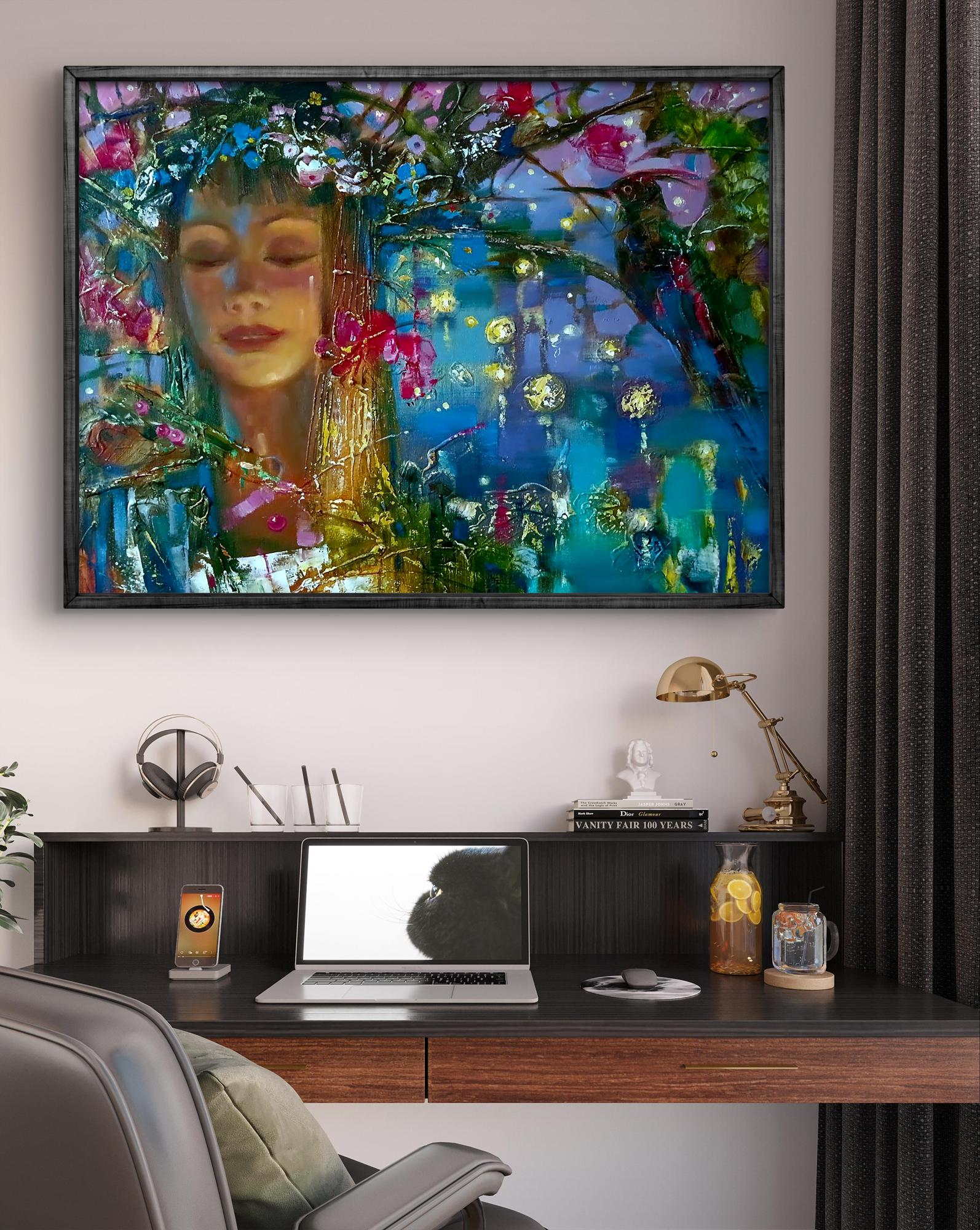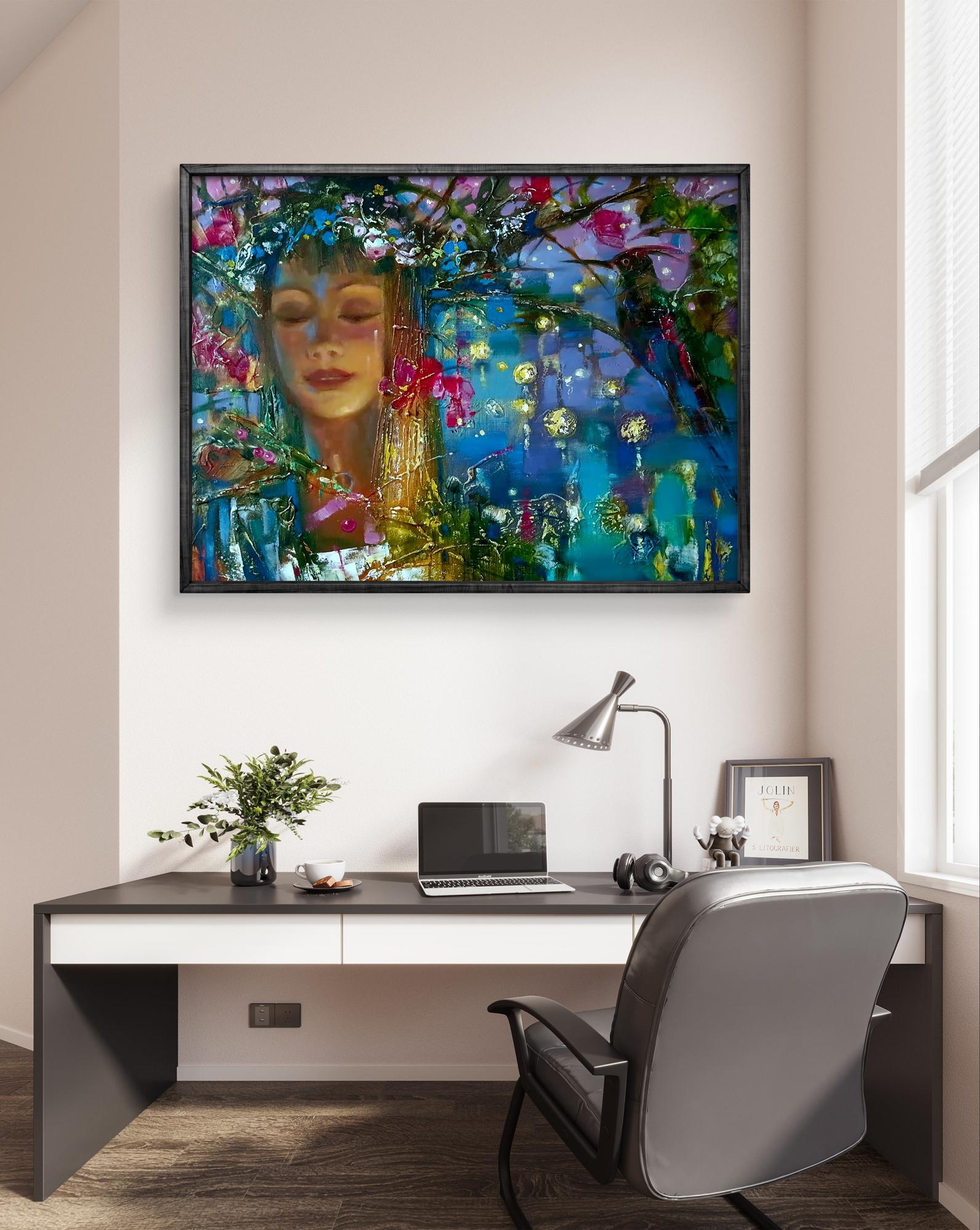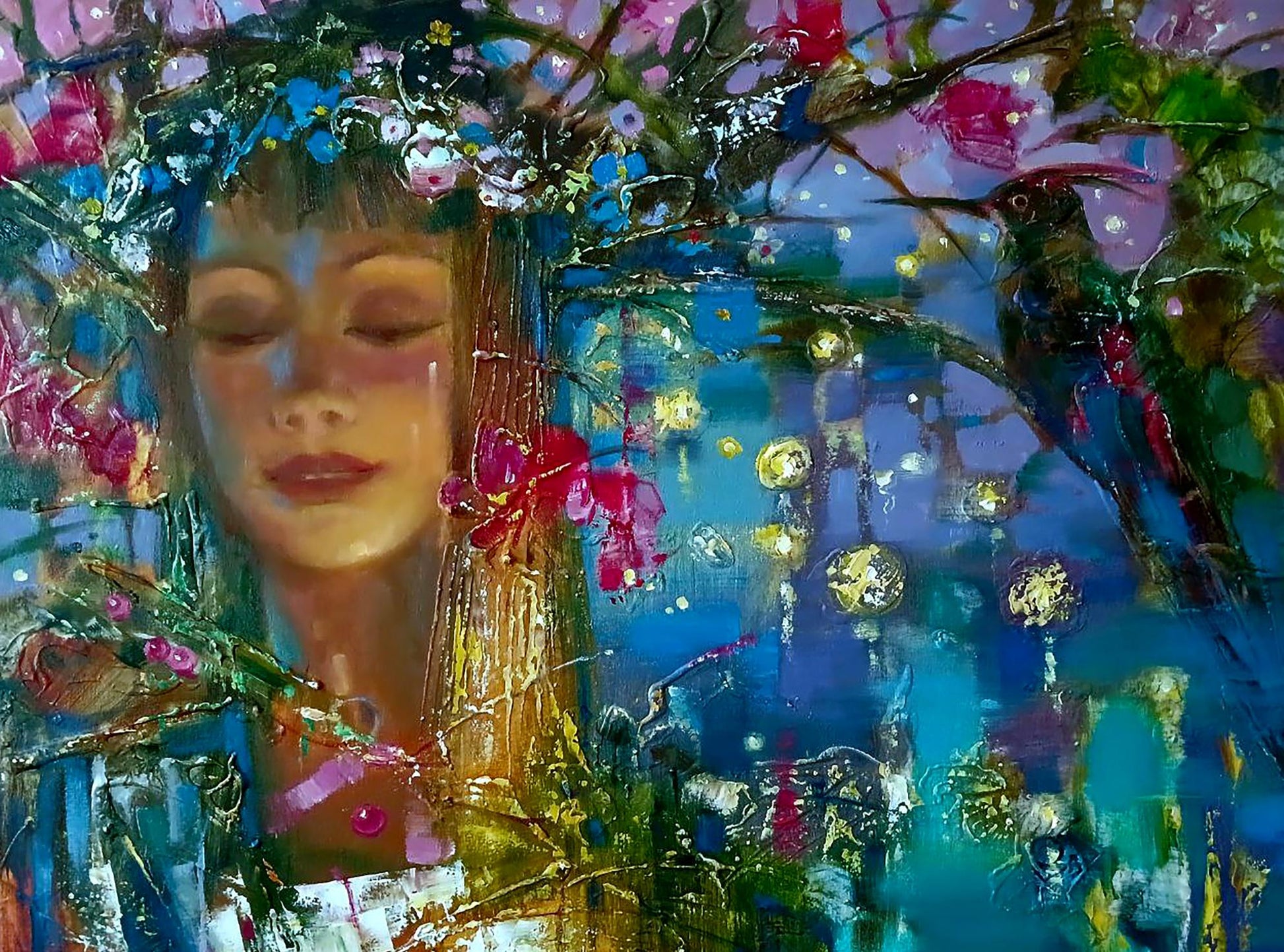 The painting titled "Kupala Night" captures the magical and mystical atmosphere of the traditional Slavic summer solstice festival known as Ivana Kupala. This celebration is deeply rooted in folklore and symbolizes the connection between nature, love, and spiritual transformation. The artwork conveys a dreamy, almost surreal mood, blending portraiture with natural and symbolic elements to evoke the feeling of a magical night under the stars. At the center of the painting is a young woman with her eyes gently closed, suggesting a state of peaceful contemplation or connection with nature and spirit. Her serene expression conveys a sense of calmness and tranquility, as if she is immersed in the magical ambiance of Kupala Night. The woman’s long hair is adorned with flowers, reflecting the traditional flower crowns worn during the Kupala festival. The blossoms are painted in vibrant hues of red, pink, and blue, symbolizing life, beauty, and the cycle of nature. The flowers seem to blend into the branches of the surrounding trees, further reinforcing her connection with the natural world. Around her, there are delicate branches, blossoms, and birds, creating a lush, enchanted forest scene. The birds, perched on the branches, symbolize freedom and the spiritual connection between humans and nature. Their presence adds a sense of mystery and magic to the composition, as birds are often seen as messengers between worlds in folklore. "Kupala Night" evokes a mood of enchantment, mystery, and spiritual connection. The painting captures the ethereal beauty of a summer night, where myth and reality blend together. The soft light and rich colors create a sense of peaceful introspection, inviting the viewer to immerse themselves in the magic of the moment. The artwork conveys a sense of harmony between humans and nature, reminding the viewer of the importance of tradition, folklore, and spiritual connection. It is a celebration of life, love, and the mysteries of the natural world, encouraging the viewer to embrace their inner dreams and desires. The painting can be interpreted as a visual representation of a dream or memory of Kupala Night, a night when anything is possible. The woman’s peaceful expression suggests that she is in tune with the spiritual energy of the festival, symbolizing a moment of personal reflection and transformation. "Kupala Night" is a celebration of the mystical and magical aspects of life, reminding the viewer of the beauty of nature, folklore, and the power of dreams. The painting invites the viewer to pause and reflect, embracing the magic and mystery of life’s moments of stillness and connection.