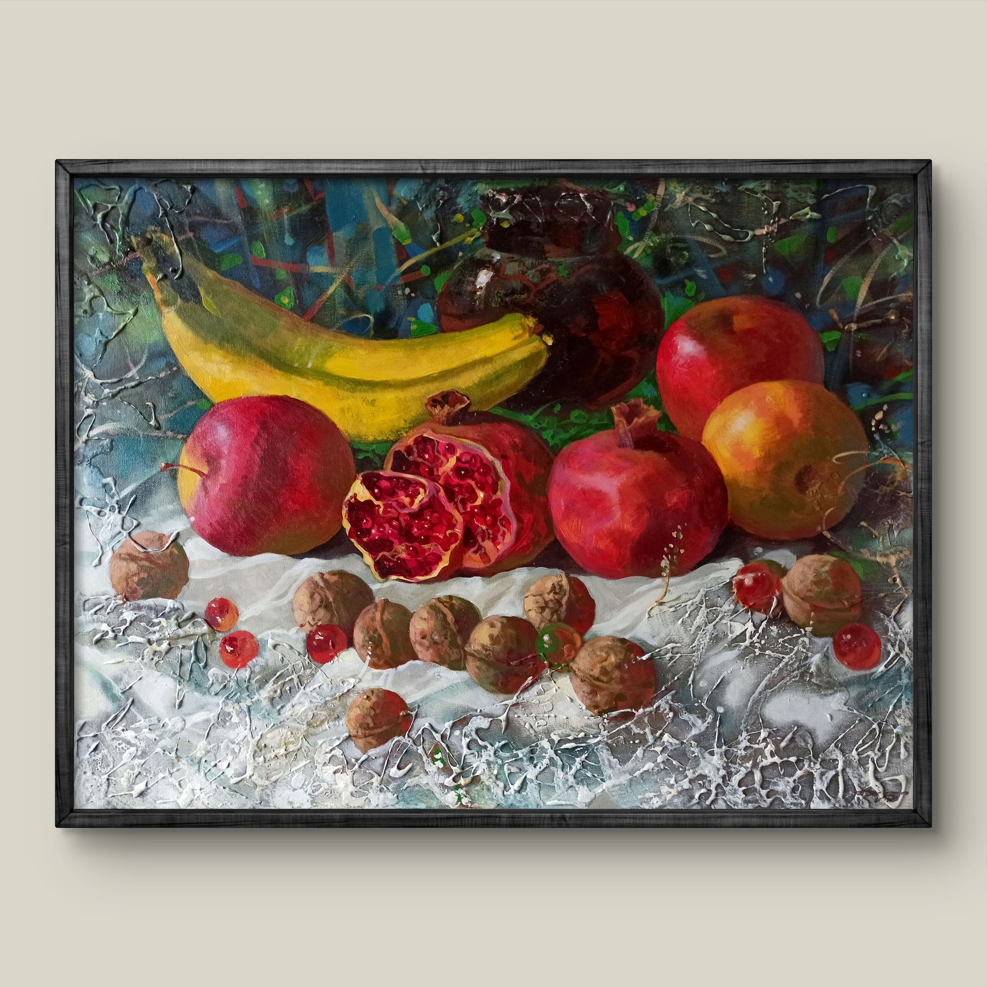 Immerse yourself in the vibrant world of "Orchard's Trio" a breathtaking oil painting by the distinguished Anatoly Borisovich Tarabanov. This masterpiece captivates with its rich depiction of pomegranates, apples, bananas, and nuts, all rendered with astonishing detail and vivid colors. A celebration of nature's bounty, this painting embodies the essence of still life artistry, bringing a slice of nature's serenity into your home or office.