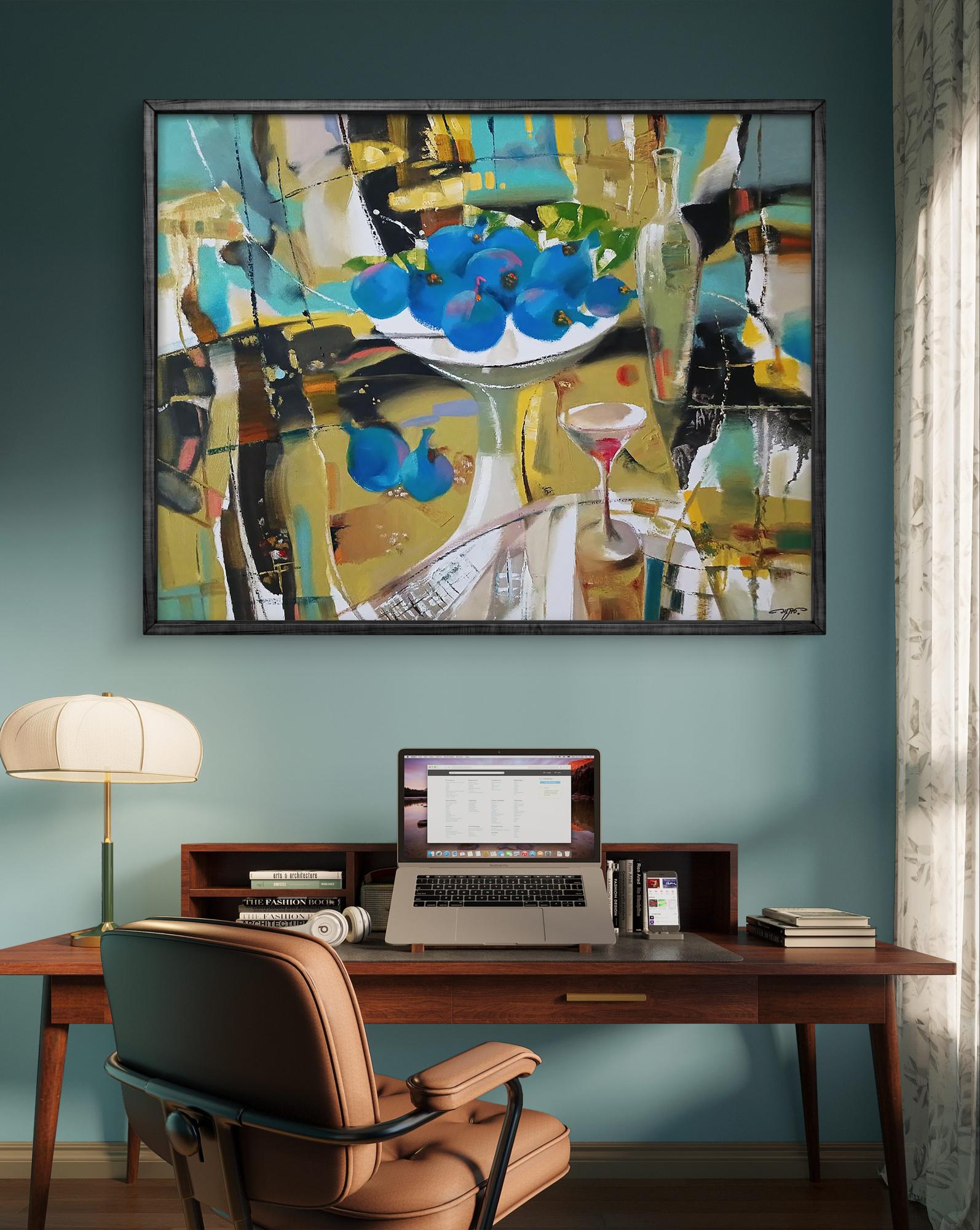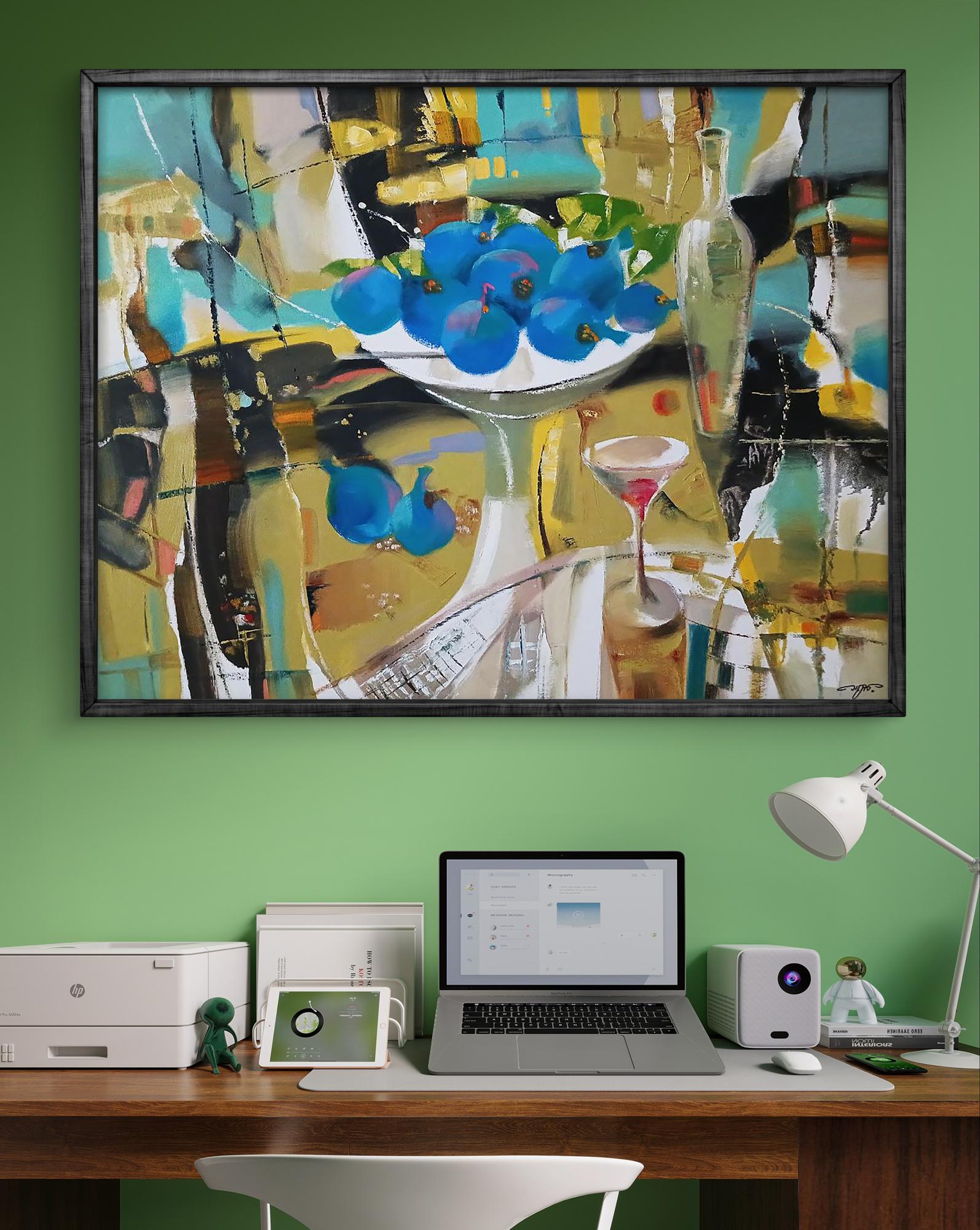 The oil painting "Sweet Still Life" presents a modern interpretation of a traditional still life scene, blending abstract elements with recognizable objects. The artist uses a bold color palette and dynamic composition to create a visually engaging piece that evokes a sense of elegance and sophistication. The focal point of the painting is a large bowl of vibrant blue plums, which sits at the center of the composition. The plums are richly colored with deep blue hues, highlighted by subtle reflections of light that give them a luminous quality. The bowl rests on a round table, partially covered by a reflected surface, creating an intriguing interplay of shapes and colors. To the right of the bowl, there is a transparent glass bottle, adding a touch of refinement to the scene. In the foreground, a delicate glass of pink wine or cocktail adds a playful and inviting element, suggesting a moment of relaxation and indulgence. The background is an abstract mixture of geometric shapes and soft brushstrokes, incorporating shades of gold, turquoise, teal, and cream. The artist employs contrasting light and dark areas, creating a sense of depth and movement. The painting’s color palette is both warm and cool, balancing earthy tones with vibrant blues. This contrast enhances the sense of balance and harmony within the composition. "Sweet Still Life" exudes a sense of sophistication and modern charm. The painting evokes the pleasure of enjoying simple moments — whether it be savoring fruit, sipping wine, or relishing the beauty of everyday objects. The reflective surfaces and playful use of color add a contemporary twist to the traditional still life theme, making the painting feel both timeless and modern. It speaks to a celebration of life’s sweet moments, capturing the beauty of quiet indulgence and domestic elegance. The artist uses bold brushstrokes and abstract shapes to create a dynamic composition. The play of light and shadow adds a sense of depth, while the use of reflections enhances the painting’s modern aesthetic. The contrast between the solid shapes of the objects and the fluid, abstract background adds a sense of movement and rhythm, making the painting feel alive and energetic. "Sweet Still Life" is a vibrant and elegant artwork that combines traditional still life elements with modern abstract techniques. The painting celebrates the simple pleasures of life, such as savoring fruit or enjoying a glass of wine, while also highlighting the beauty of everyday objects through a contemporary lens. It is a stylish and dynamic piece that would bring sophistication and warmth to any space.