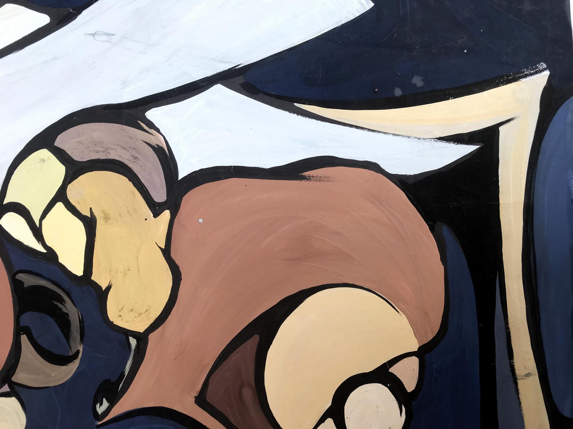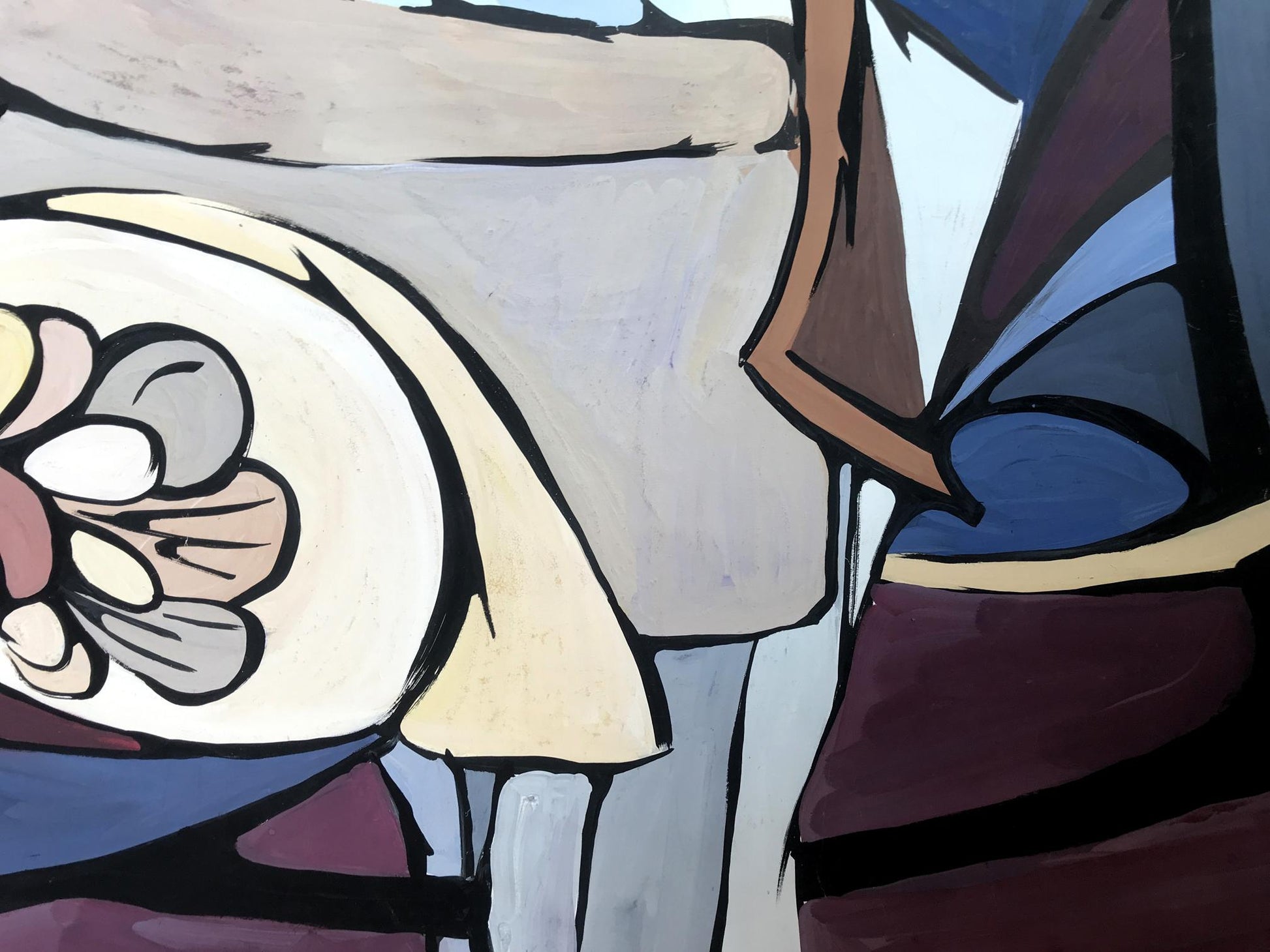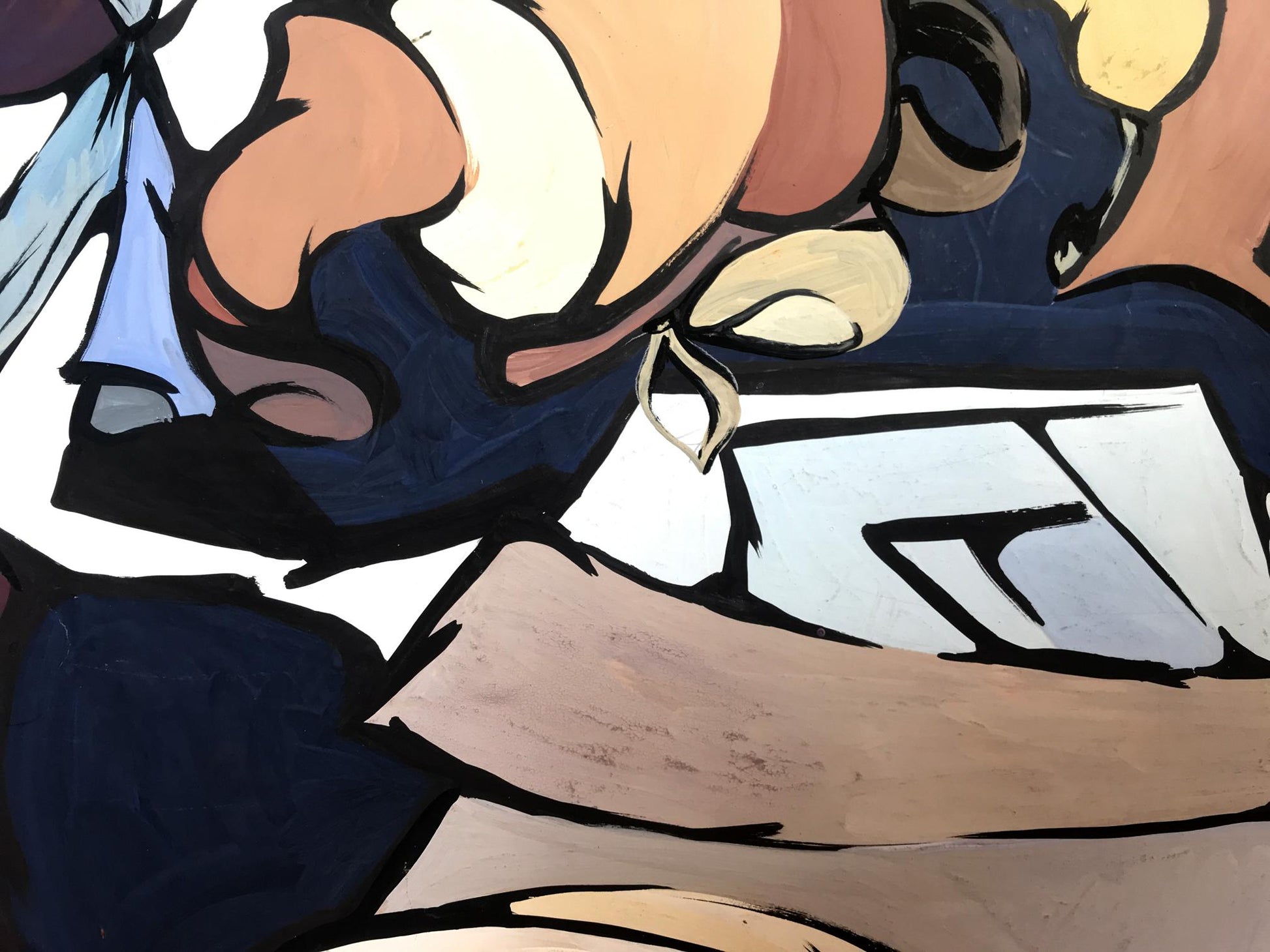 The painting in acrylic is an abstract piece that features a striking combination of colors and textures. The predominant colors used in the painting are brown, white, gray, and blue, which are layered and blended in a way that creates a captivating visual effect. At the center of the painting, there are several large, organic shapes that seem to merge and flow together. These shapes are painted in shades of brown, which give them a warm, earthy feel. Around the edges of the painting, there are jagged lines and geometric forms, which are painted in shades of white, gray, and blue. The texture of the painting is also an important aspect of the work. The surface of the painting is covered in a thick layer of acrylic paint, which has been applied in a way that creates a rough, almost sculptural effect. Some areas of the painting have been painted in thin, translucent layers, which allow the underlying colors to show through, while other areas are painted in thick, opaque layers, which create a more solid, three-dimensional effect. Overall, the painting is a stunning example of abstract art, which uses color and texture to create a sense of movement, depth, and complexity. The use of earthy tones and organic shapes gives the painting a natural, organic feel, while the jagged lines and geometric forms create a sense of structure and order. The painting is sure to captivate and inspire anyone who sees it, and its beauty and depth will continue to reveal themselves over time.