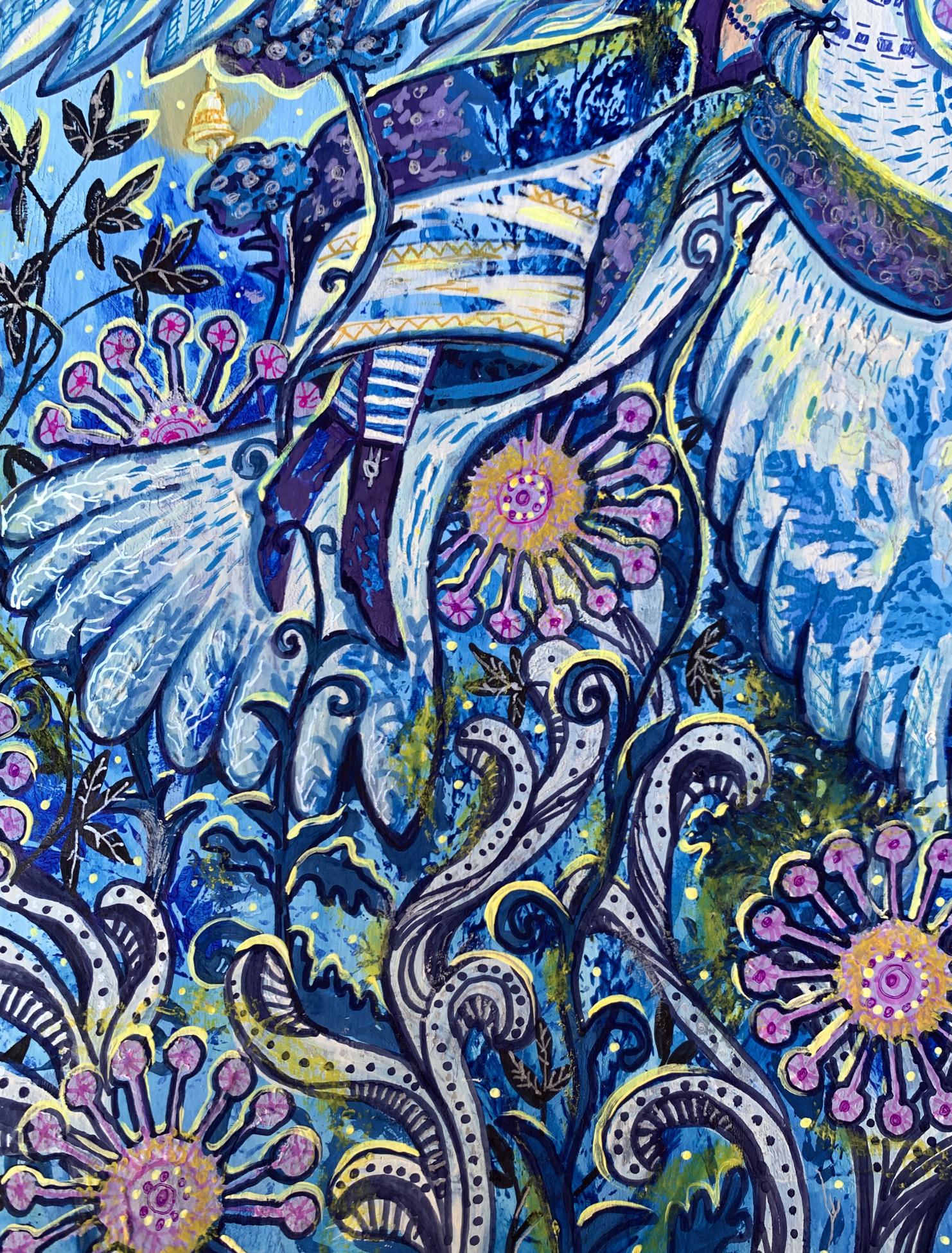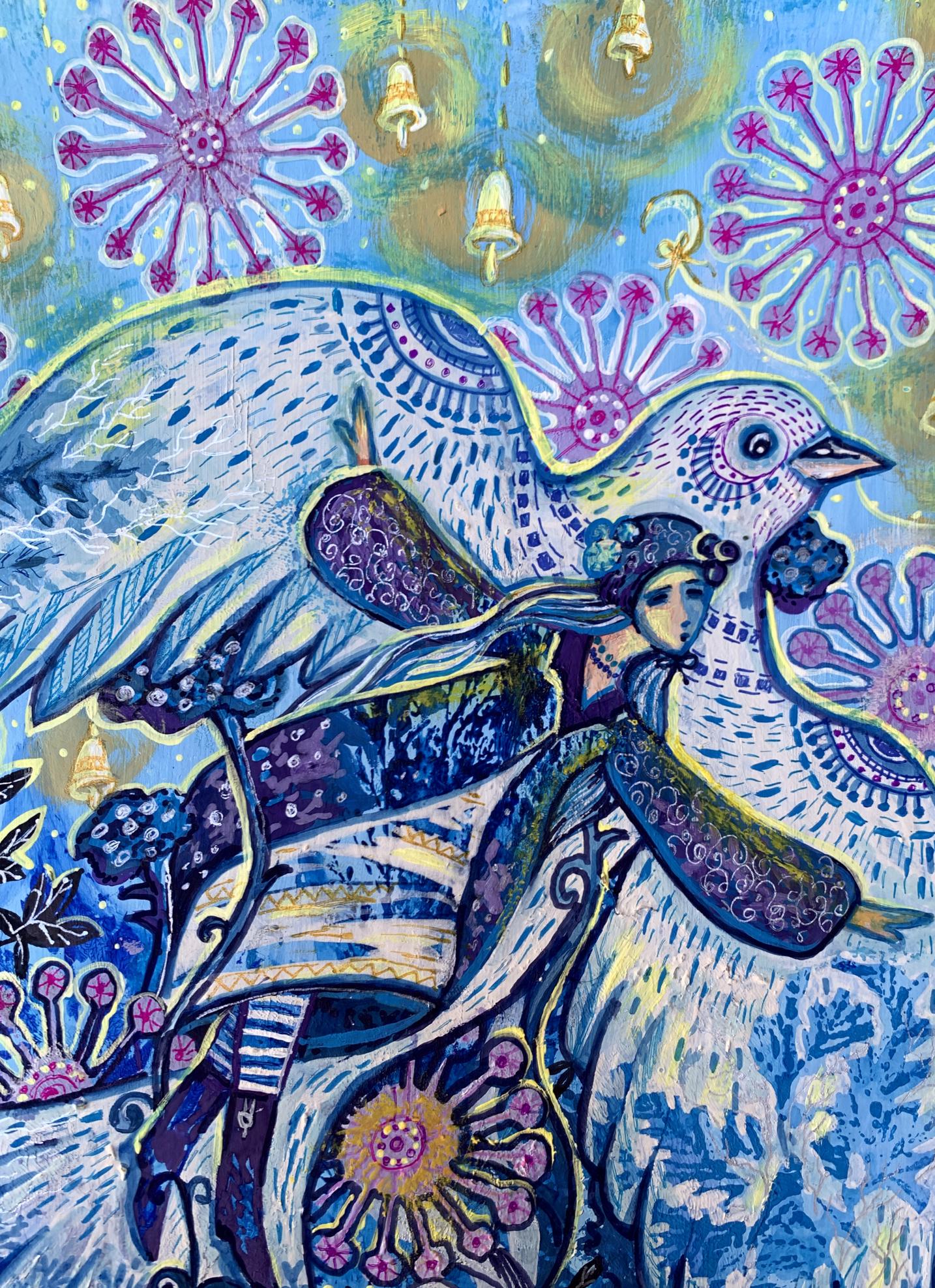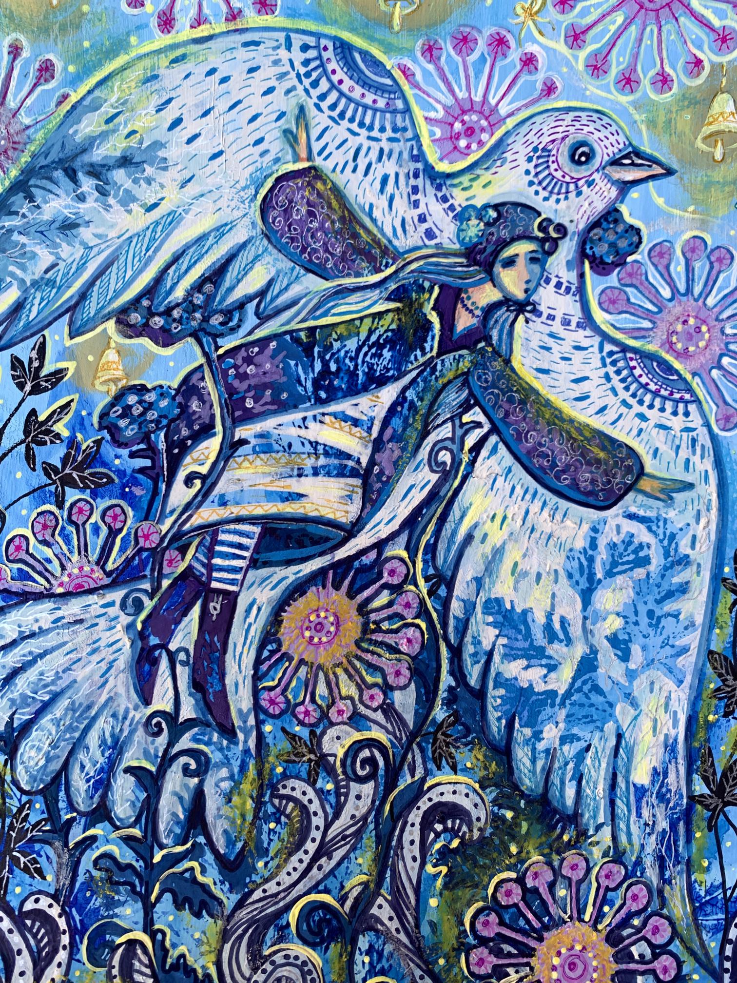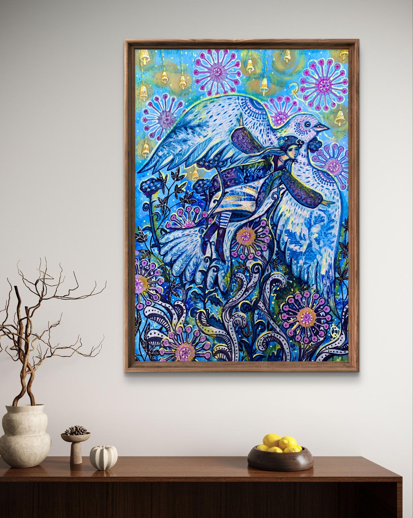 Above the bird, small golden bells dangle like stars in a celestial canopy, adding a spiritual or dreamlike dimension to the painting. Their gentle presence suggests hope, guidance, or even the sounds of a heavenly realm. The background is alive with abstract patterns resembling fireworks or bursts of light, enhancing the feeling of celebration and transcendence.The figure riding on the bird is portrayed as peaceful and contemplative, wrapped in flowing garments that blend harmoniously with the bird's feathers. This unity between the human and the bird implies a fusion of earthly and ethereal elements, symbolizing the human longing to escape the confines of reality and embrace the limitless freedom of flight.Through "If I Had Wings," the artist explores themes of aspiration, freedom, and the interplay between nature and human imagination. The bird becomes a metaphor for the transformative power of dreams, offering an escape from the mundane and a journey toward self-discovery and spiritual elevation. The intricate details and harmonious colors evoke a sense of wonder and inspire viewers to reflect on their own desires to rise above life's challenges and limitations.This painting is a celebration of the beauty of imagination and the human spirit’s eternal longing to transcend, to explore, and to achieve the impossible. It invites the audience to dream of having wings and ponder where their flight might take them.