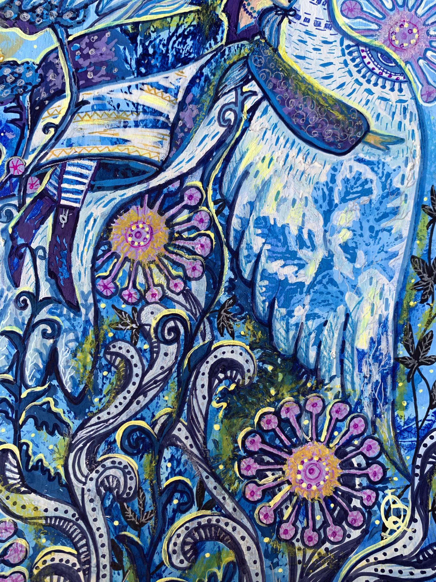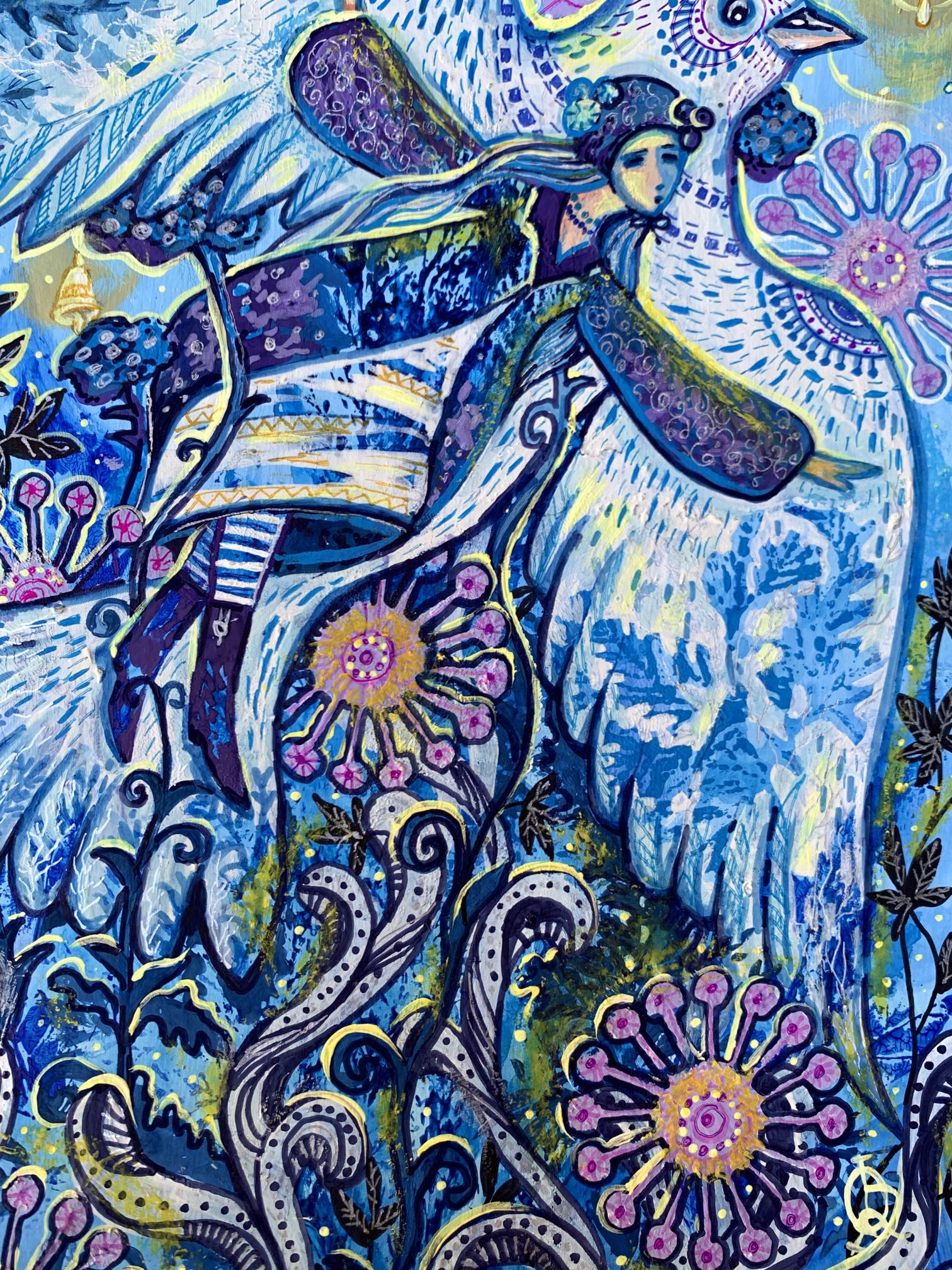 The painting titled "If I Had Wings" is an enchanting and intricate composition created with acrylic, marker, and gel pen on paper. This artwork exudes a sense of whimsy and fantasy, inviting the viewer into a world where dreams take flight. At the heart of the painting is the depiction of a majestic bird with elaborate, almost ethereal wings, carrying a human figure on its back. The bird, with its flowing feathers, represents freedom, transcendence, and the boundless potential of imagination.The artwork is drenched in vibrant hues of blue, violet, and gold, which dominate the background and create an atmosphere of serenity and wonder. The floral motifs that surround the bird are intricately detailed, bursting with life in shades of pink, purple, and green. These flowers seem to reach out toward the bird and its passenger, symbolizing nature’s connection to the human spirit and the desire to soar beyond earthly limitations.