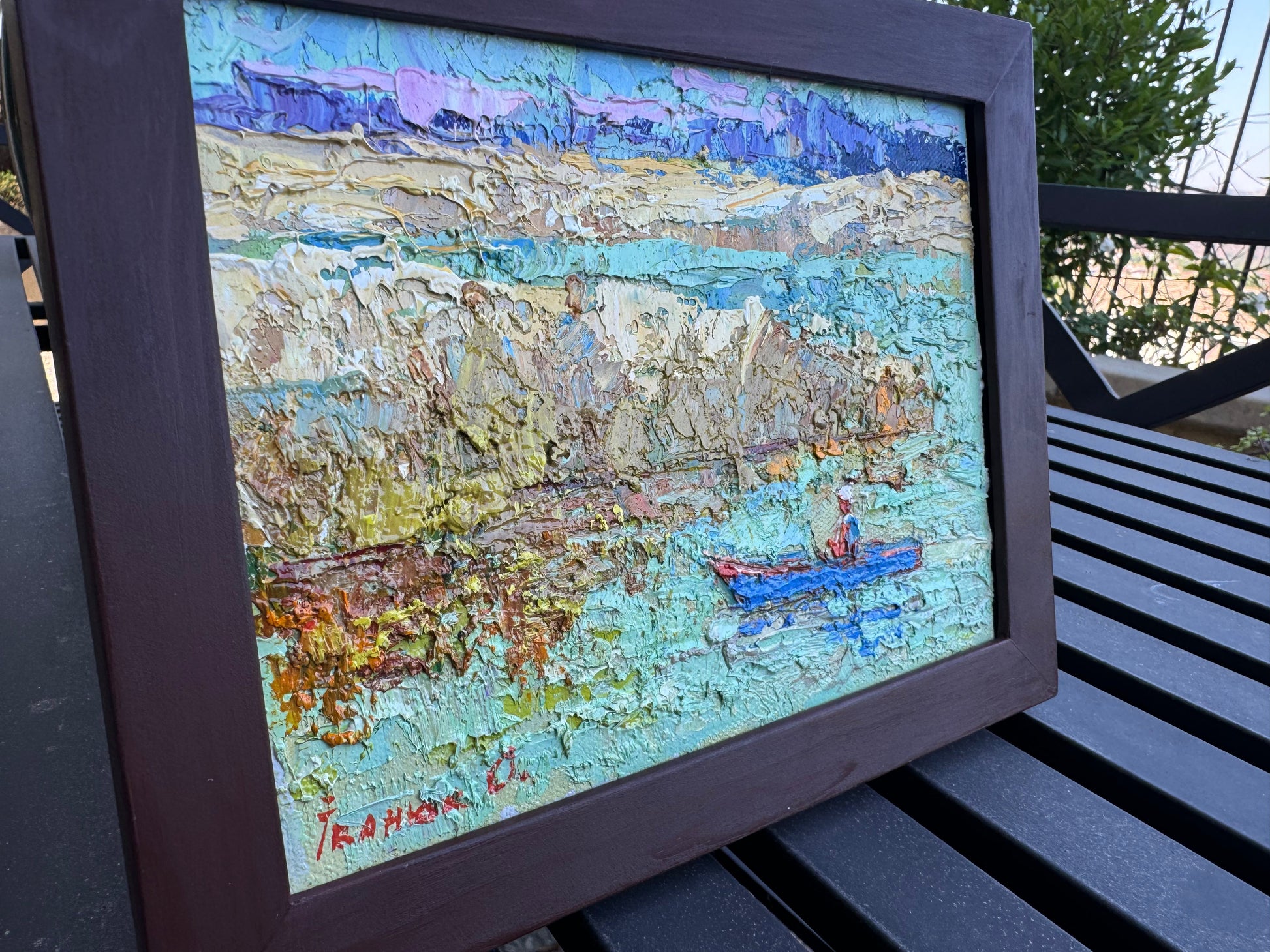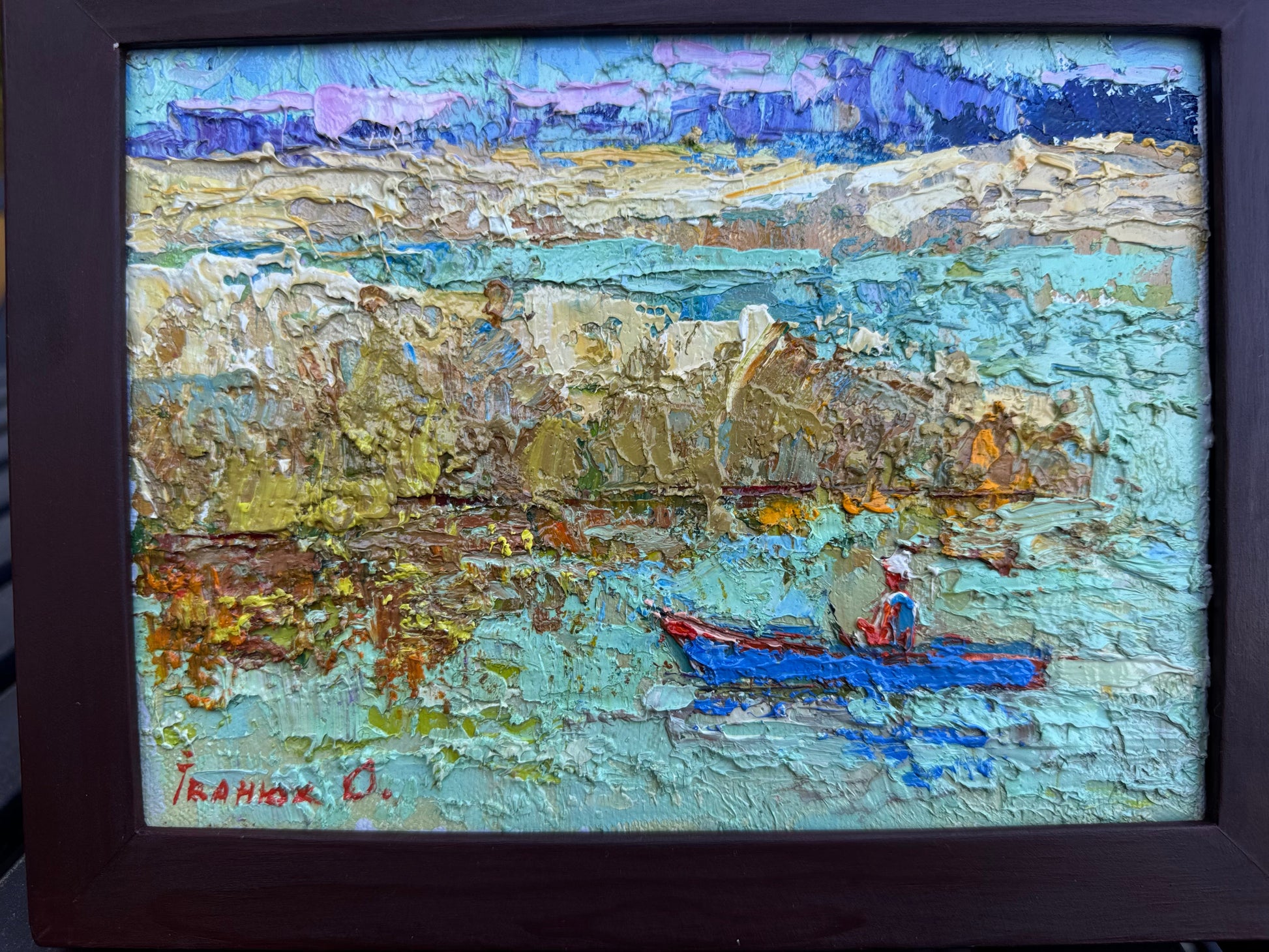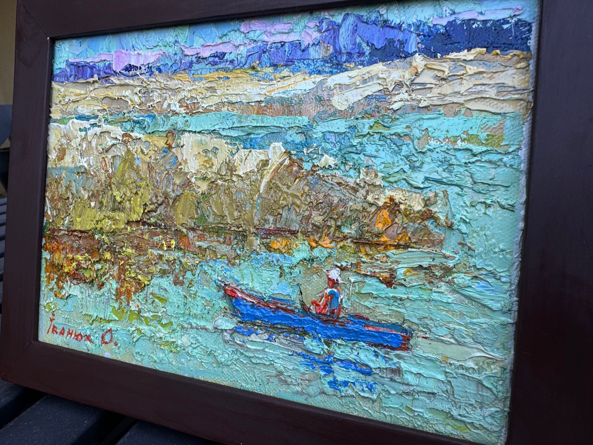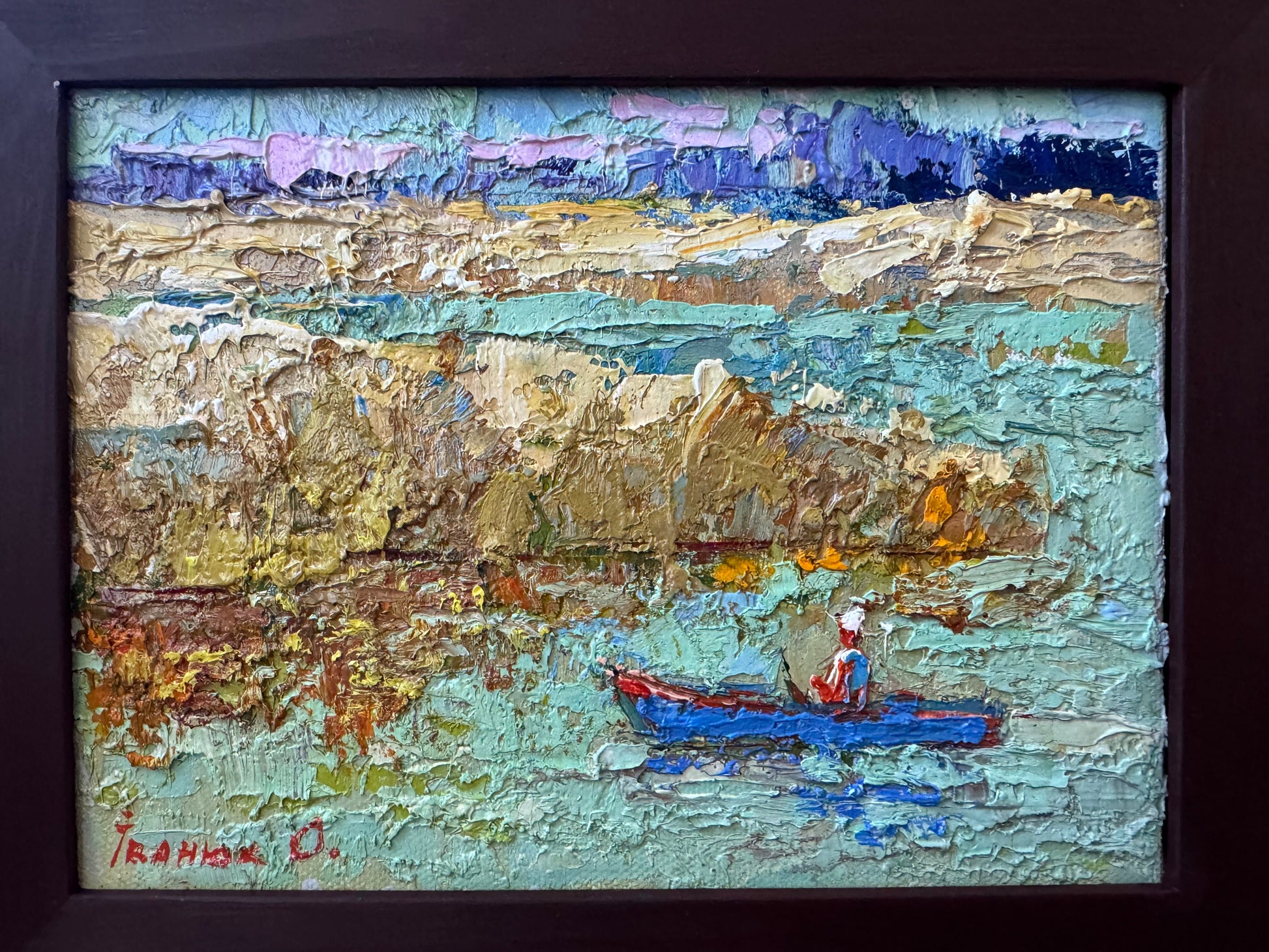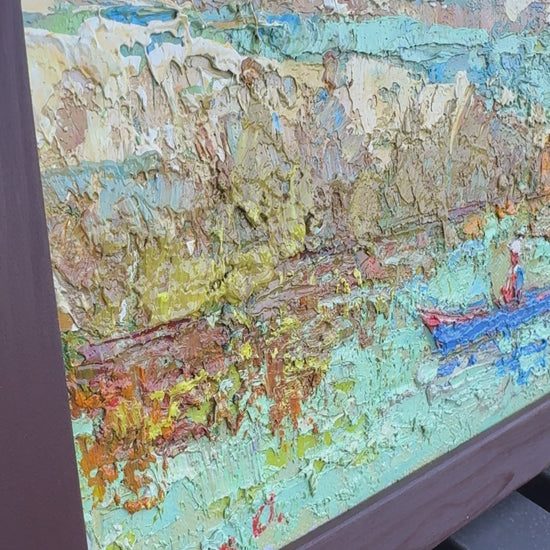 This vibrant and textured oil painting captures a serene scene by the river. The thick application of paint creates a sense of depth and movement, especially in the water and surrounding landscape. The subtle yet expressive use of color enhances the natural beauty of the scene, while the lone figure in a boat adds a peaceful and contemplative element to the composition.