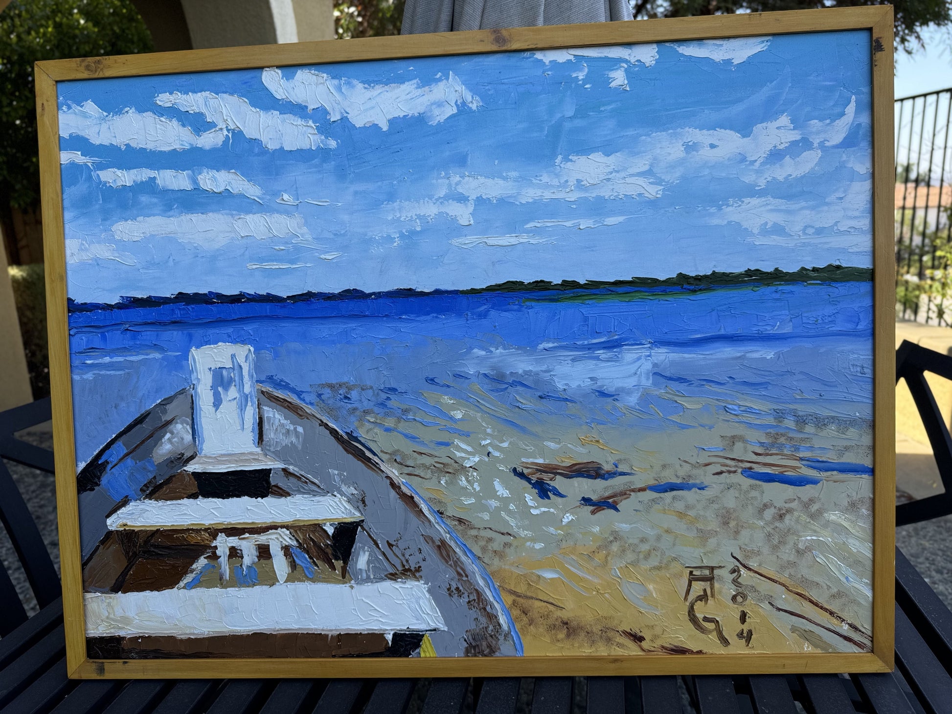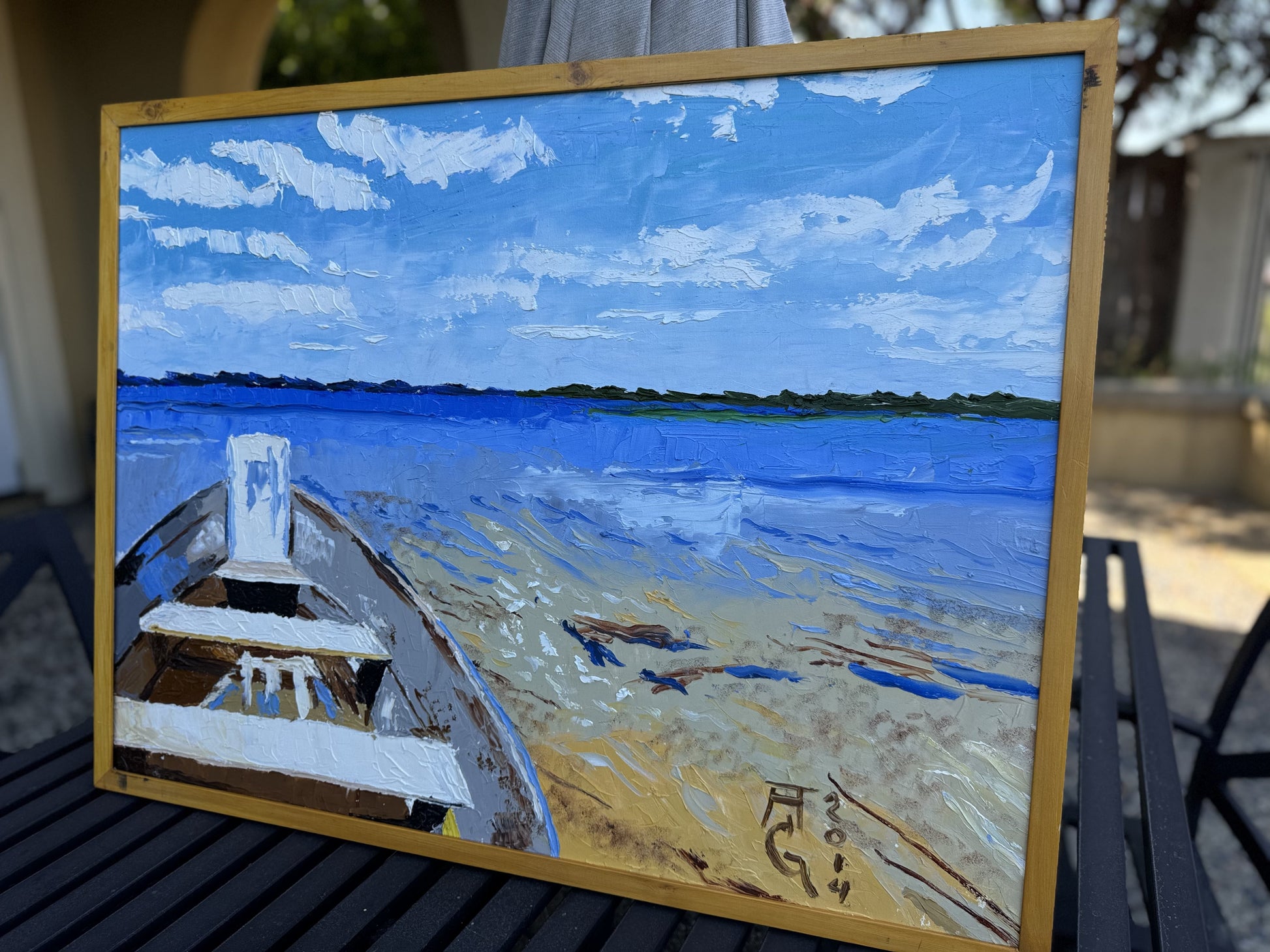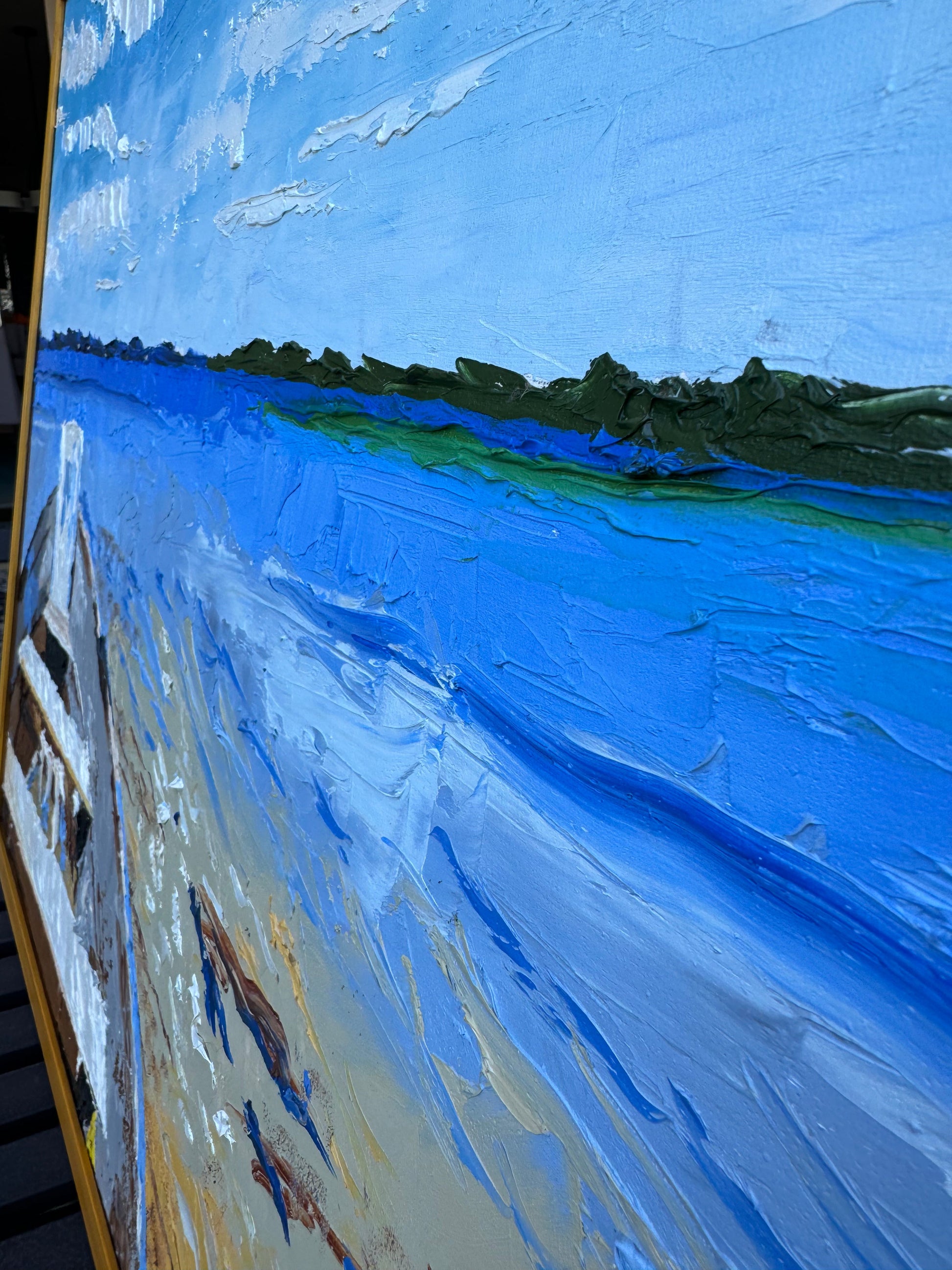 This peaceful scene of a boat gently resting by the shore invites the viewer into a moment of serene reflection. The artist uses a rich palette of blues and earthy tones to depict the tranquil water and distant horizon. Thick brushstrokes bring the sky and the water to life, creating a sense of movement, while the boat offers a quiet presence, anchoring the scene.