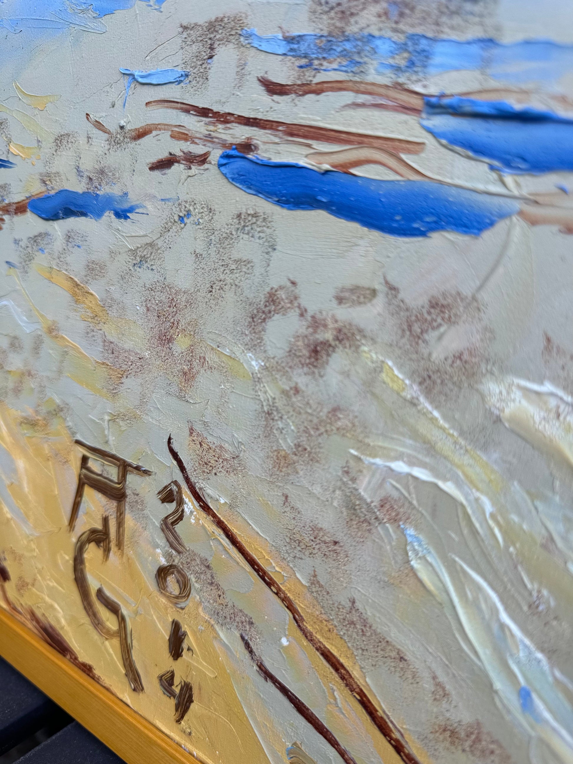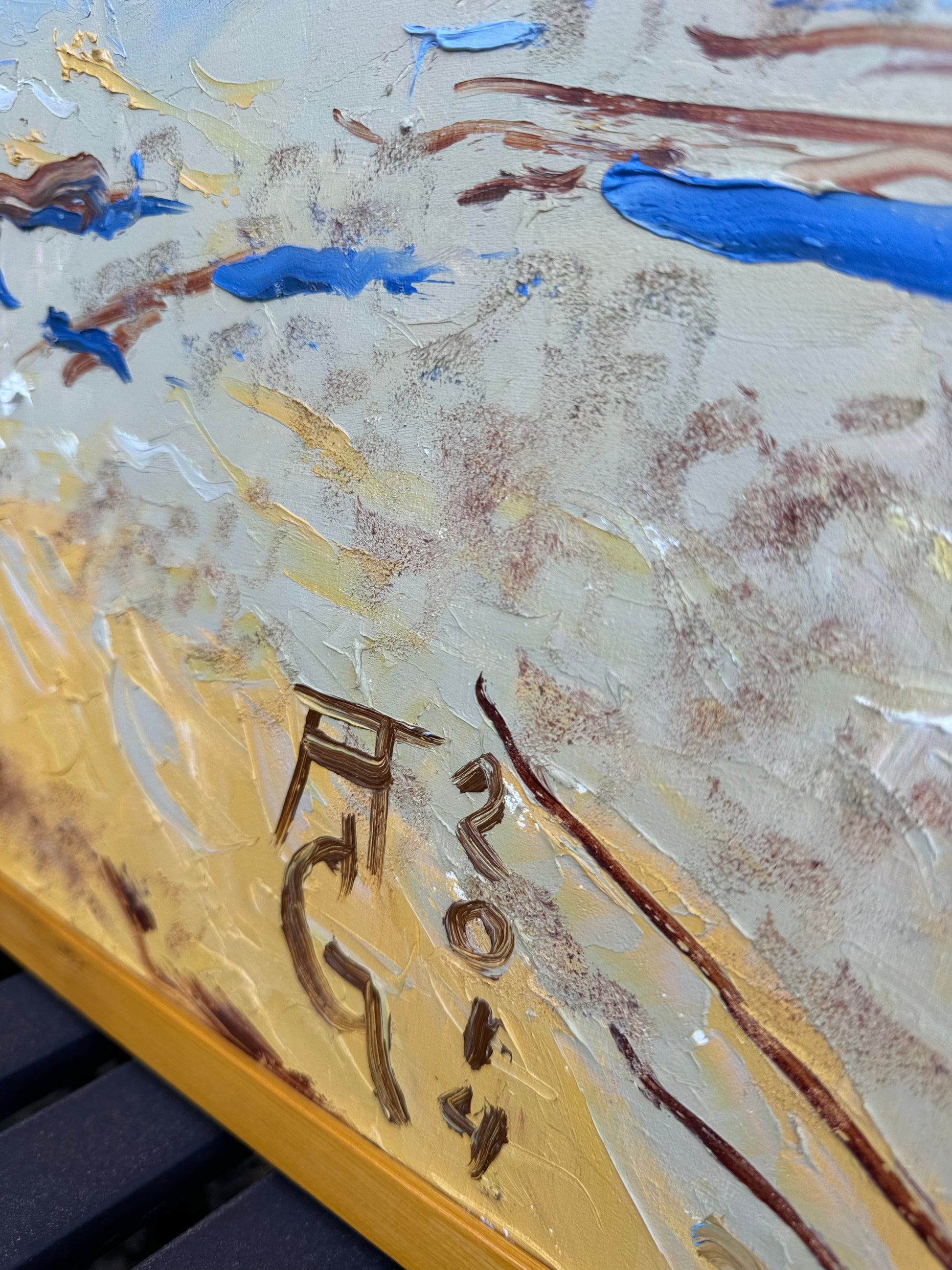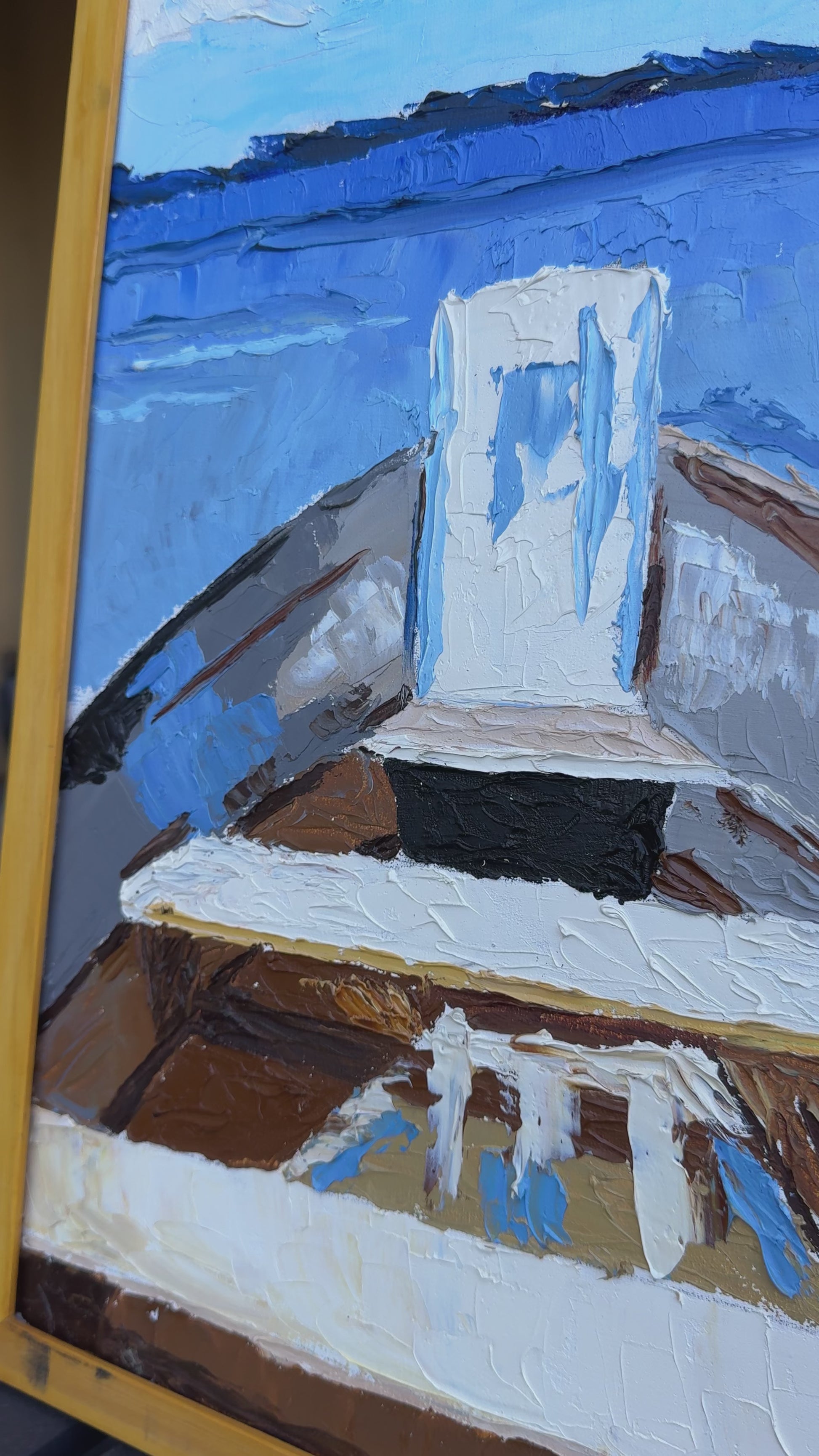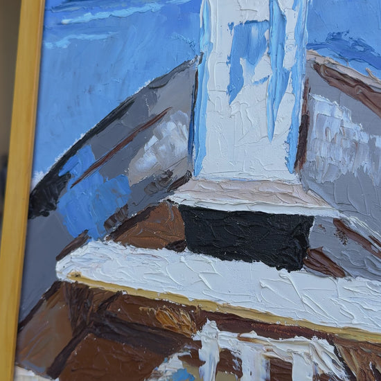 This peaceful scene of a boat gently resting by the shore invites the viewer into a moment of serene reflection. The artist uses a rich palette of blues and earthy tones to depict the tranquil water and distant horizon. Thick brushstrokes bring the sky and the water to life, creating a sense of movement, while the boat offers a quiet presence, anchoring the scene.