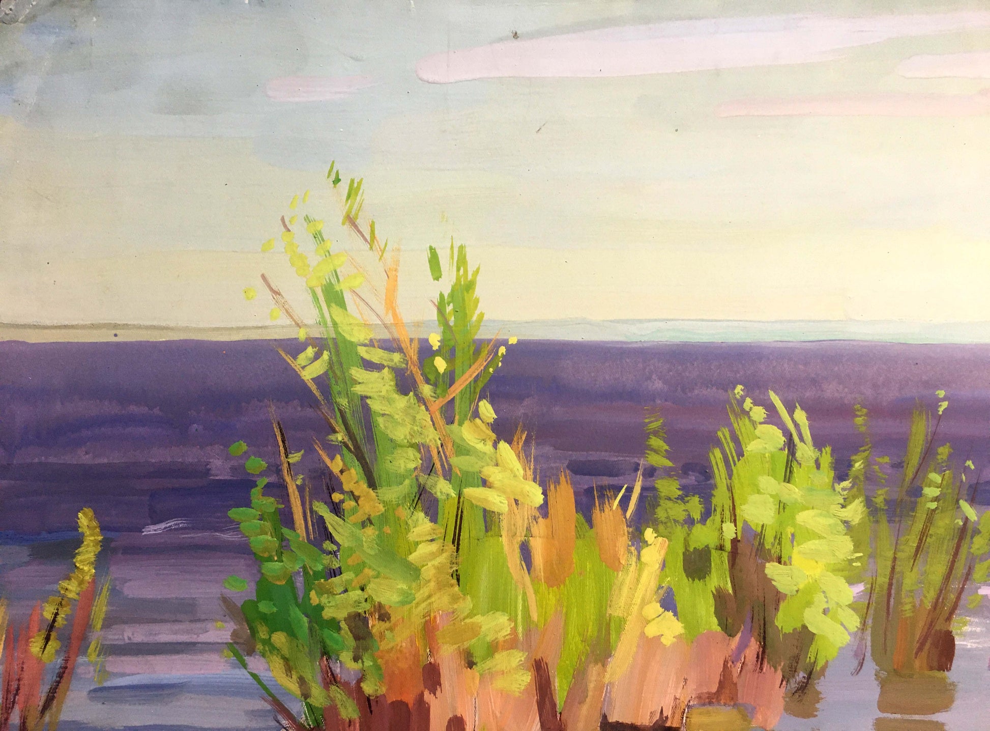 Gouache painting Calm coastal river Vladimir Chernikov