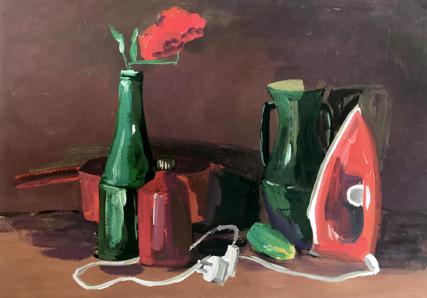 The painting in gouache is a captivating still life composition, masterfully executed with a keen eye for color and balance. The central focal point of the painting is a vibrant green bottle, adorned with a striking red flower. The bottle is positioned on a table, with a richly hued cup of red placed in front of it. Behind the bottle, a frying pan of the same deep shade of red provides a bold contrast to the bottle's verdant green. To the right of the central still life arrangement, there are two additional objects that add further interest and dimension to the composition. A red iron stands tall, its sleek lines contrasting with the more organic shapes of the other items. A green jug, also on the right, holds a crisp cucumber, adding a fresh burst of color to the scene. The background of the painting is divided into two distinct halves, with one side painted in a rich shade of red and the other in a deep, earthy brown. This creates a sense of balance and harmony, while also allowing the central objects to pop out and draw the viewer's gaze. Overall, the painting in gouache is a stunning still life that captures the beauty of everyday objects and elevates them to a work of art through the skillful use of color, composition, and technique.