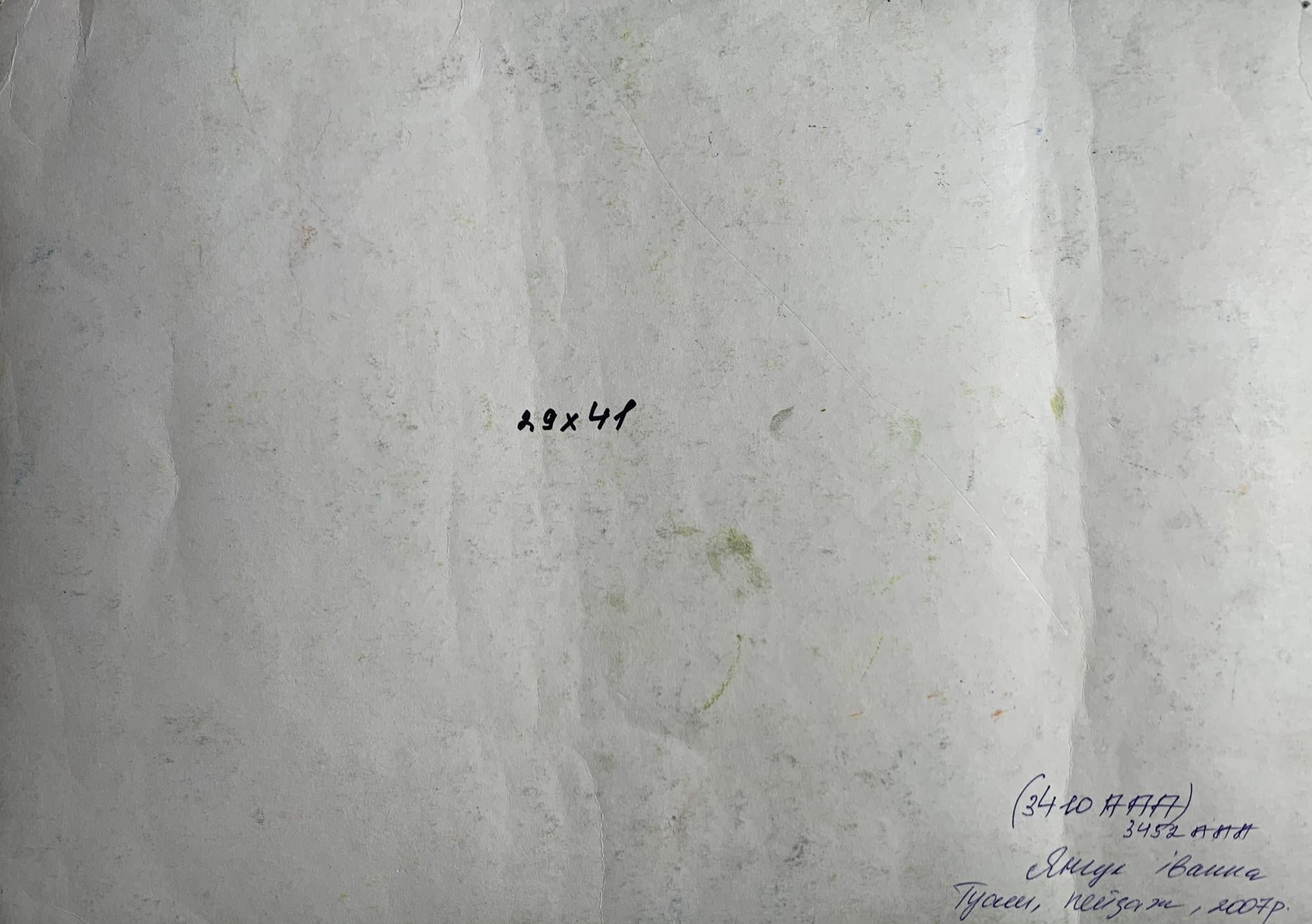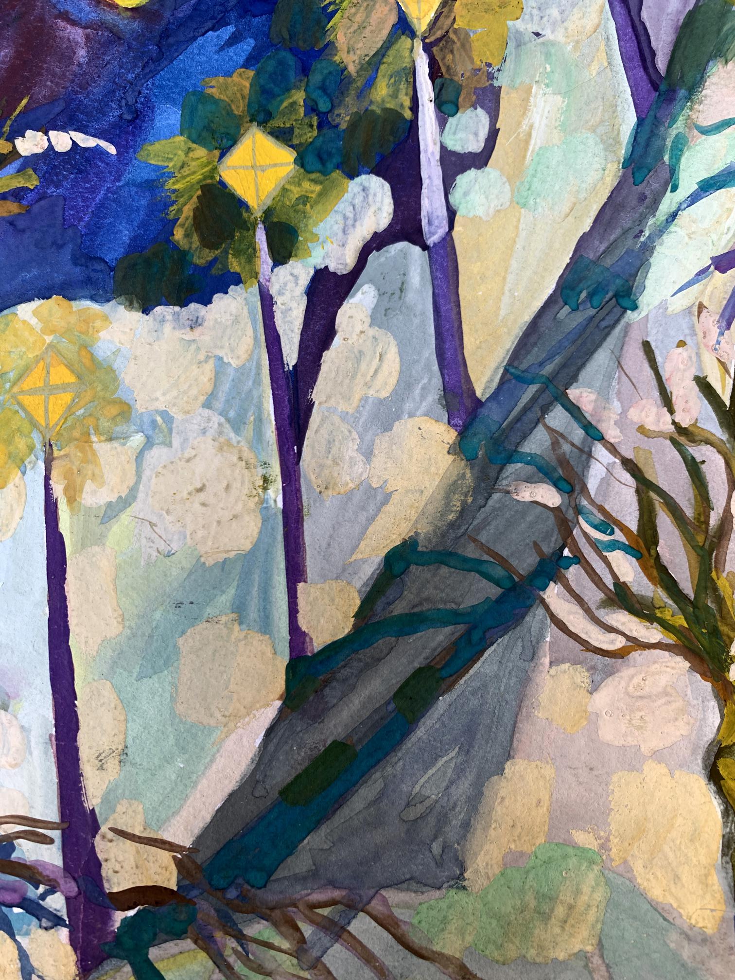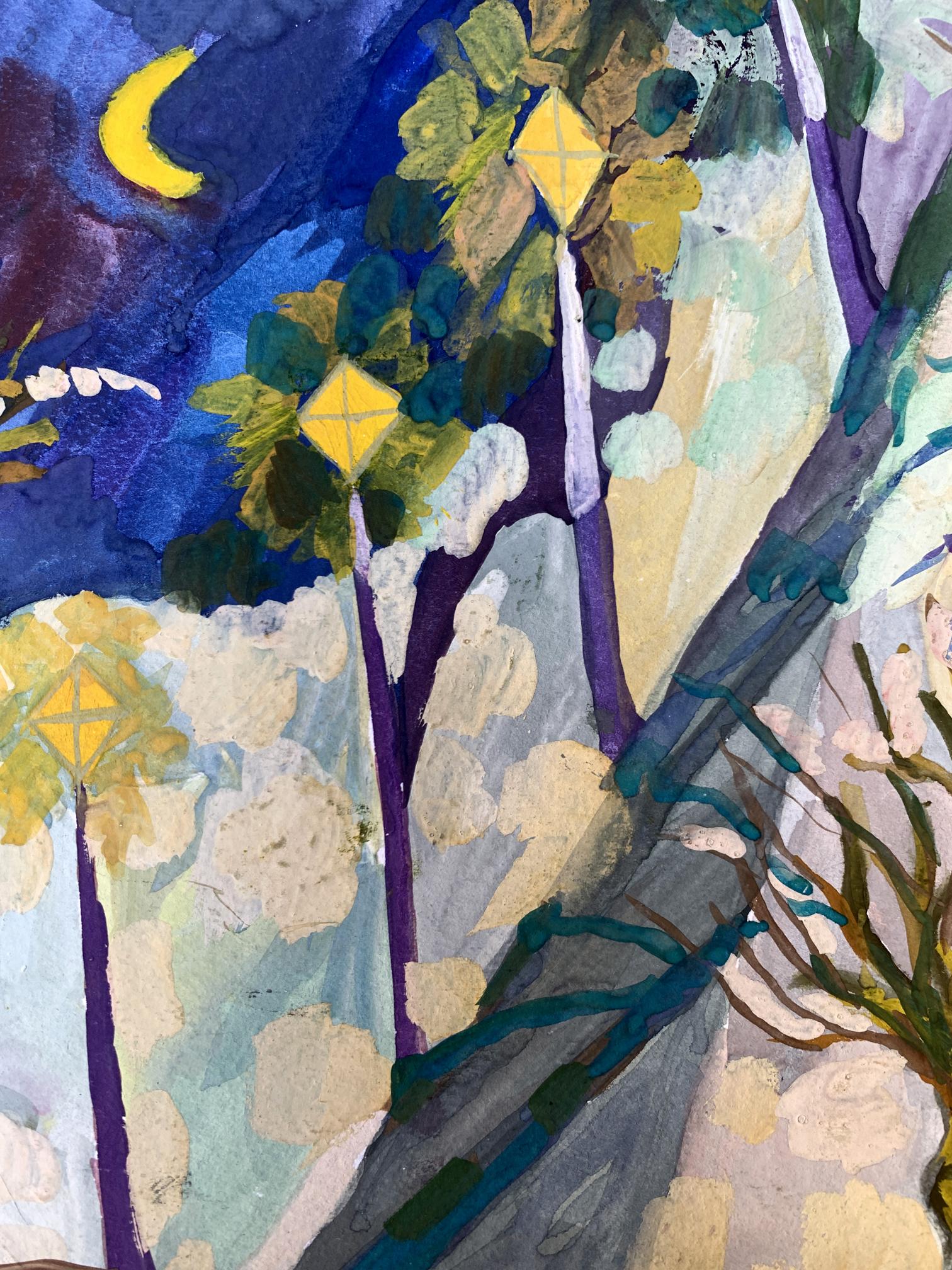 The painting "Winter Evening in the Park" captures a serene yet mysterious moment in a park during winter, executed with gouache on paper. The composition presents a quiet, almost dreamlike atmosphere, where the elements of nature are stylized and enhanced through the use of bold, vivid colors and dynamic brushstrokes.The central focus of the painting is a group of bare trees, their intricate branches extending upward into the night sky. The trees are portrayed with sharp, angular lines, creating a sense of isolation and barrenness typical of winter. However, the white snow that dusts the branches contrasts beautifully with the dark blues and purples of the surrounding night, suggesting the beauty that can exist even in solitude. The snow is represented by large, dappled white spots that seem to glow, bringing life to the otherwise muted landscape.In the background, a crescent moon hangs delicately in the sky, adding a gentle light that highlights the sparse landscape. The use of yellow in the moonlight contrasts against the deep blues of the sky and the cool tones of the snow-covered ground, evoking a feeling of quiet contemplation. The sky itself is an expressionistic blend of blues and purples, which imparts a sense of stillness and peace, typical of a calm winter evening.The trees' roots are partially exposed in the foreground, rendered in a rich dark purple hue. This grounding element symbolizes the depth of nature, its unseen energy, and the interconnectedness of life even during the colder months. The unusual use of color in these roots adds an abstract quality to the painting, inviting the viewer to consider the invisible forces that shape the world around us.The artist’s choice to depict the scene in gouache gives the work a soft, velvety finish, while the vibrant color palette enhances the emotional depth of the winter scene. The exaggerated, almost surreal hues in the trees and sky serve to heighten the magical quality of the scene, while the soft blending of shapes and colors evokes a sense of introspection.Through "Winter Evening in the Park," the artist conveys a quiet, meditative experience of nature in winter. The use of vibrant color in a cold, still landscape suggests that even in times of stillness or seeming emptiness, there is beauty, life, and energy. The park, with its bare trees and moonlit sky, acts as a symbol of resilience and the subtle vibrancy that persists in the natural world during winter. The painting invites viewers to pause and reflect on the inner peace that can be found in the natural world, even in the coldest seasons.