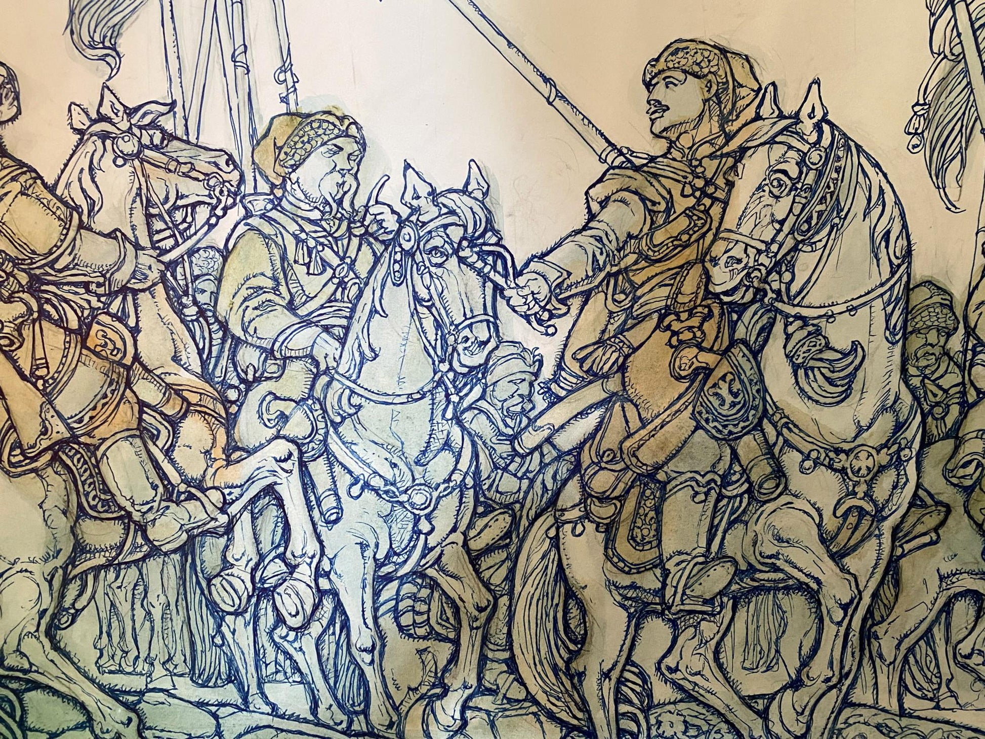 Immerse yourself in the deep historical and cultural narratives of Ukraine with "Legacy of the Sich" an exquisite ink and watercolor painting by the renowned artist Oleg Arkad'yevich Litvinov. This artwork masterfully combines the literary genius of Nikolai Gogol with the legendary figure of Taras Bulba, bringing to life the spirit of Ukrainian Cossacks and their timeless tales of valor and tradition.