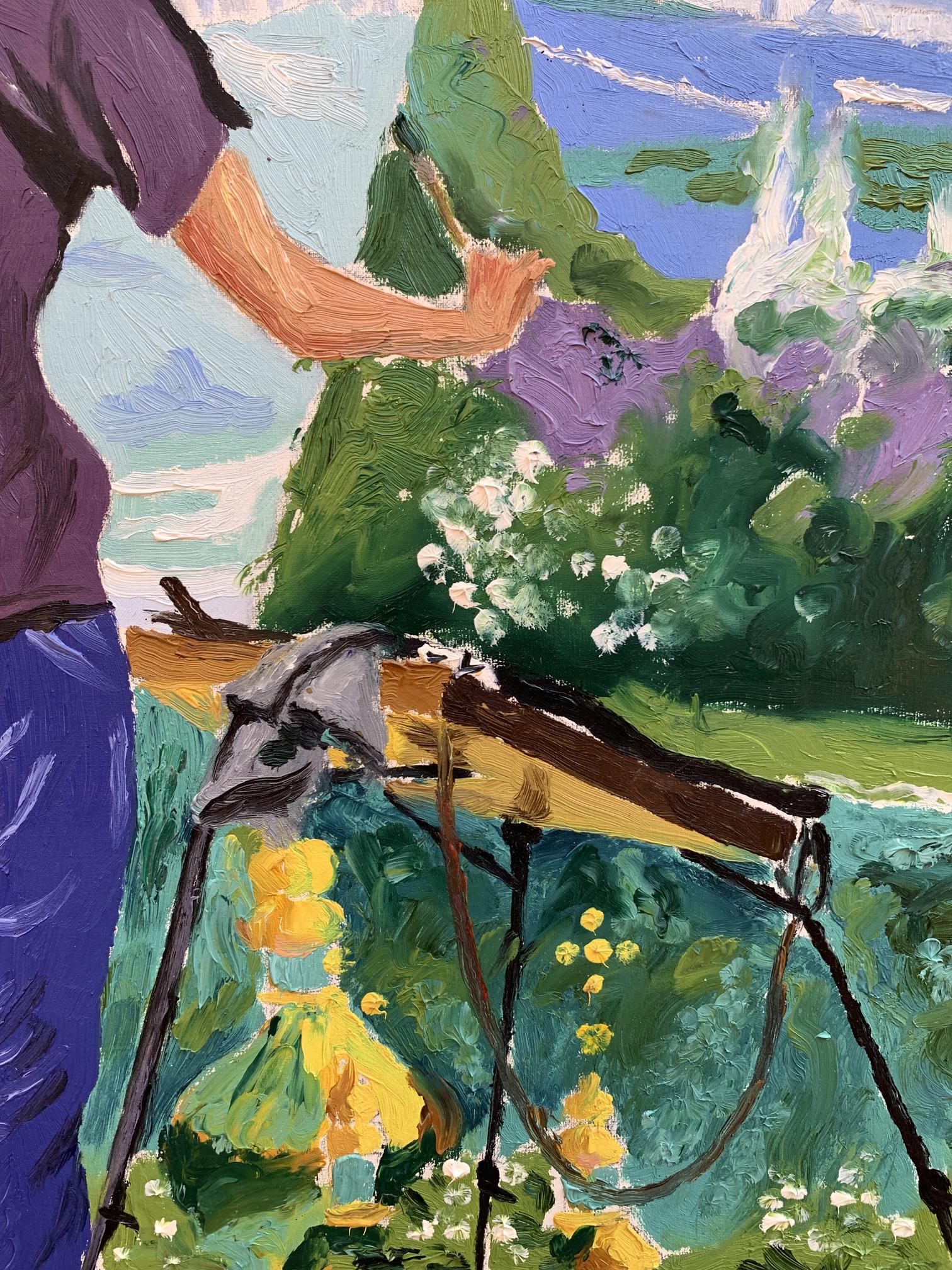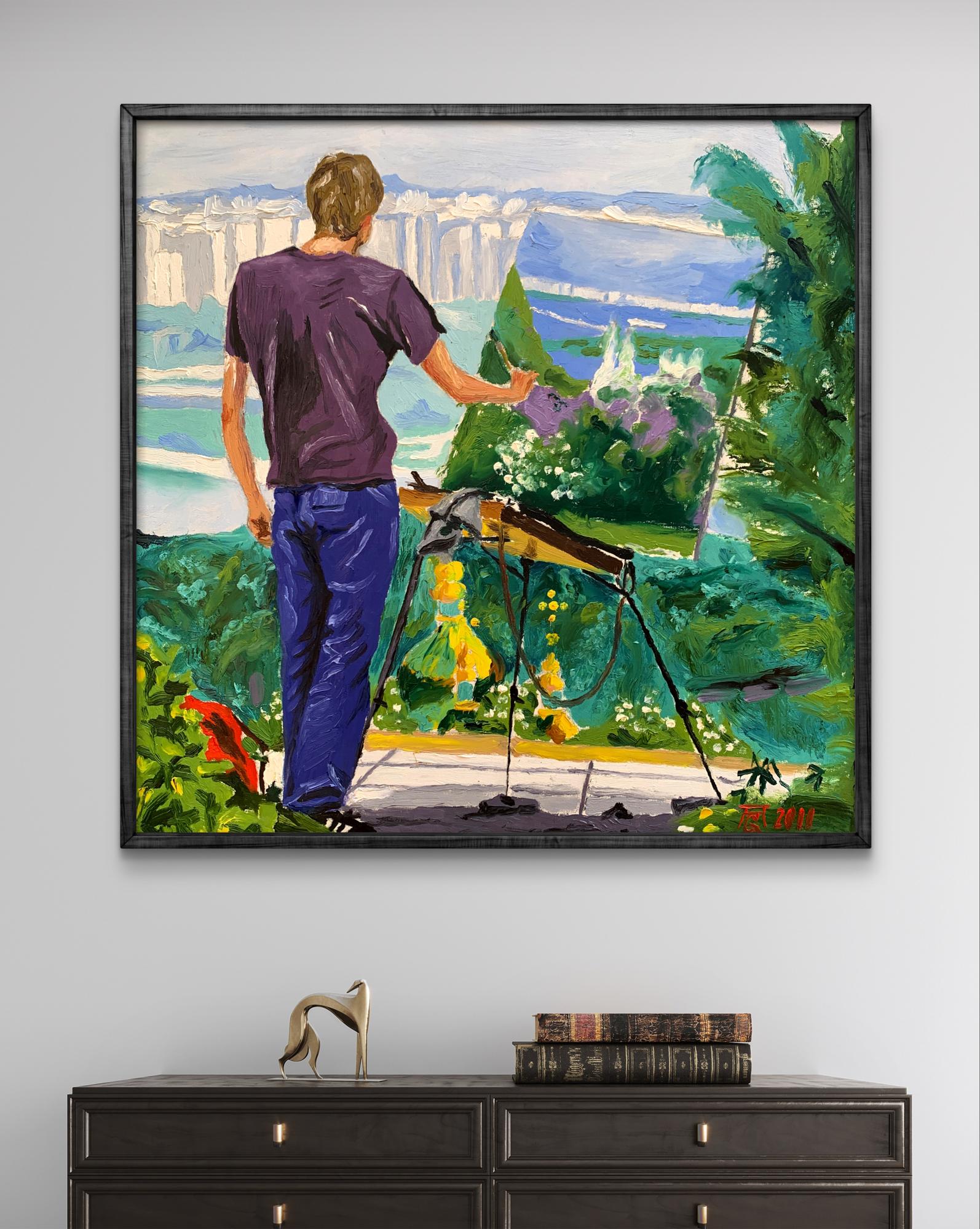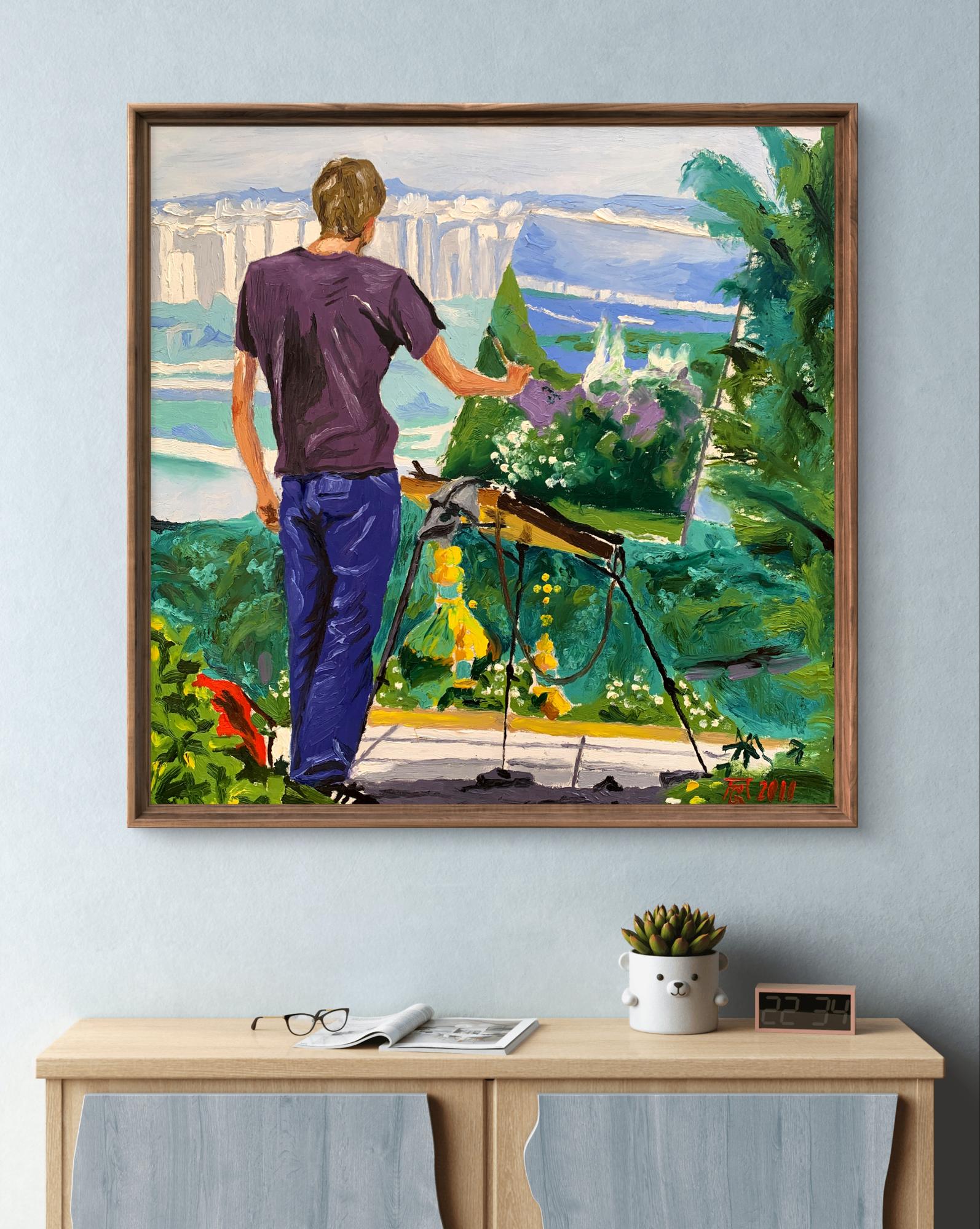 The painting titled "A Site with a View of the City" portrays a serene yet dynamic moment of artistic expression. The composition centers around an artist standing on a lush green hill, observing and recreating the panoramic cityscape before him. Using bold and vibrant oil strokes, the artist captures the juxtaposition of natural beauty and urban life.In the foreground, the figure of the artist is presented from behind, emphasizing his focus on the canvas and the scene ahead. He wears a casual purple shirt and blue jeans, highlighting the simplicity of his attire against the vibrant setting. The painter’s easel, tools, and canvas stand out amidst the greenery, suggesting that he is deeply immersed in his work. His posture, slightly leaning forward with his hand gesturing toward the city, conveys a sense of dedication and contemplation.The background reveals a breathtaking view of the cityscape, featuring a blend of architectural and natural elements. Towering modern buildings rise in the distance, painted in soft, muted tones, while a large river winds gracefully through the scene, adding depth and movement. In contrast, the foreground bursts with the colors of a verdant park, dotted with flowers and foliage. A hint of sunlight illuminates the greenery, creating a lively yet tranquil atmosphere.Through this piece, the artist explores the harmony between nature and urbanization. The vivid greenery in the foreground serves as a reminder of the natural beauty that coexists with human development. The artist's act of painting symbolizes an attempt to capture this balance and preserve the fleeting moment of connection between man, nature, and the city."A Site with a View of the City" invites the viewer to appreciate the intricate relationship between the natural world and modern life. The choice of vibrant colors and fluid brushwork reflects the artist’s admiration for the scene, while the act of painting within the painting underscores the transformative power of art in interpreting and celebrating our surroundings. This piece inspires reflection on the beauty of urban landscapes as seen through the eyes of a passionate observer.