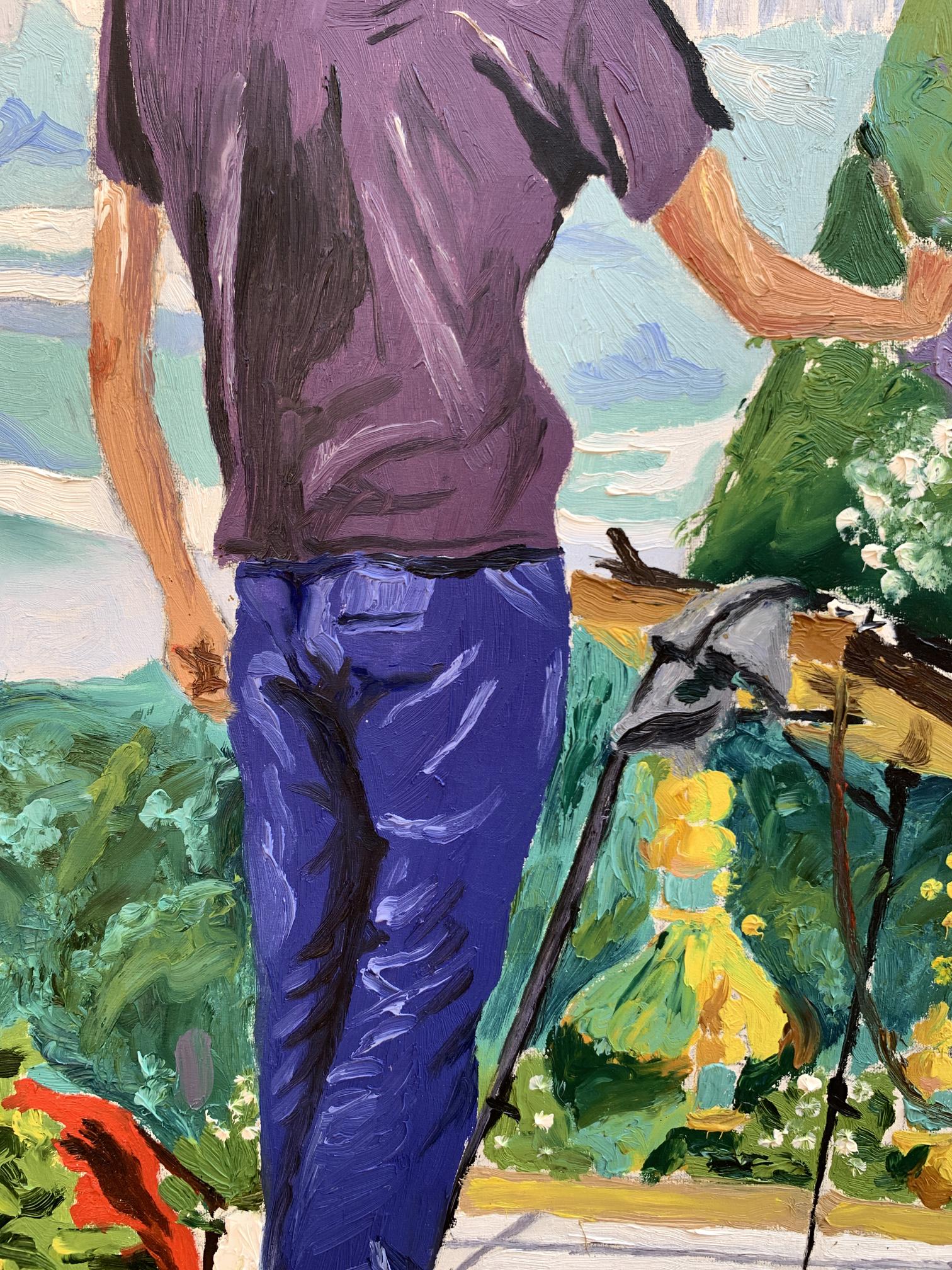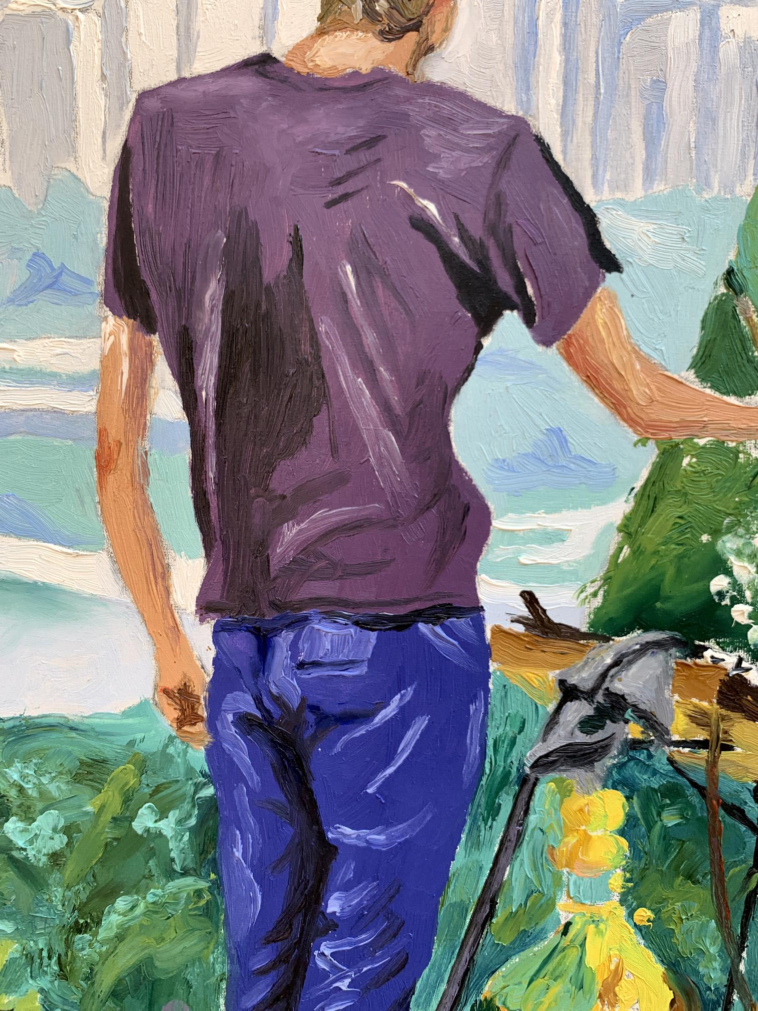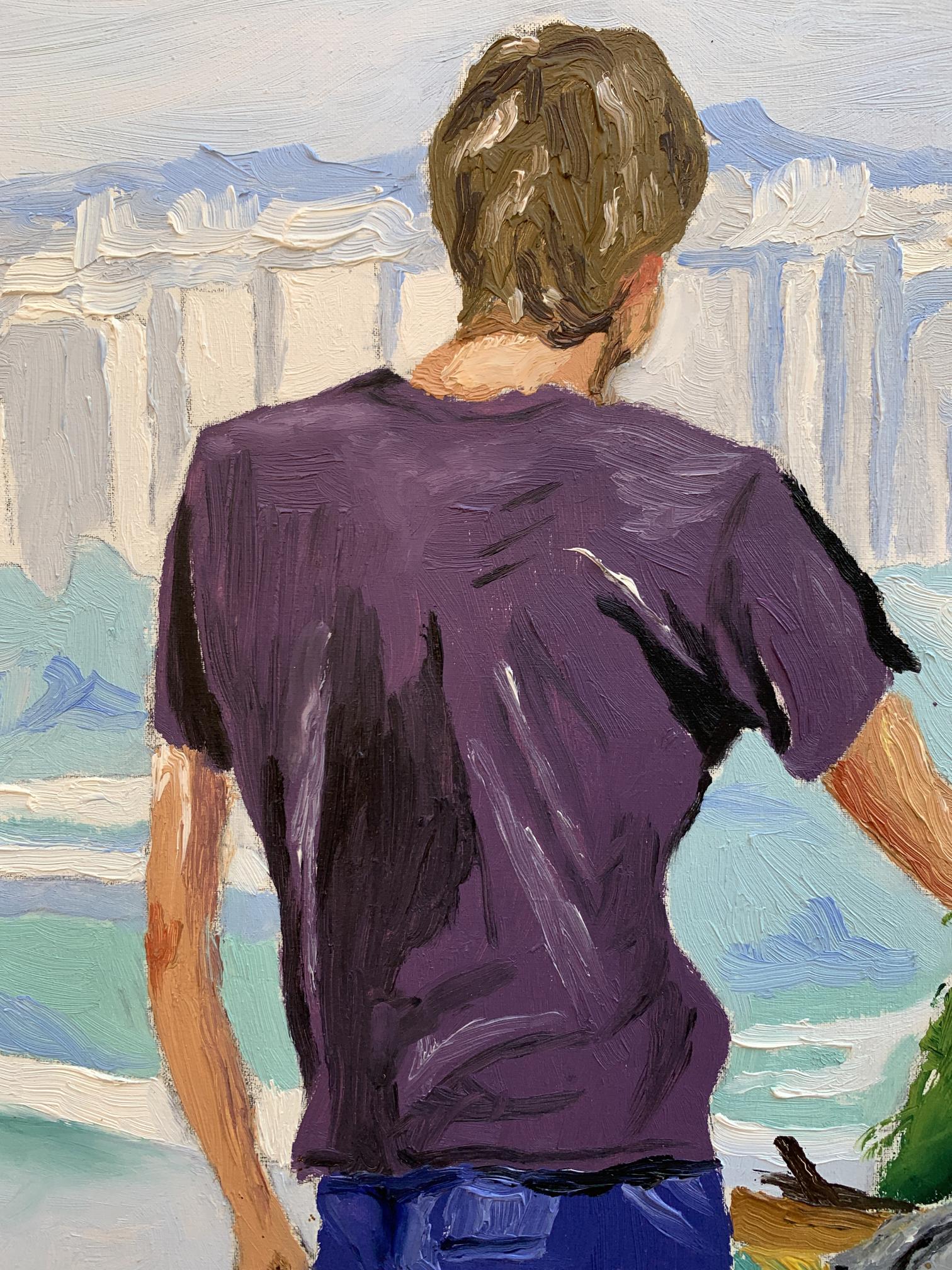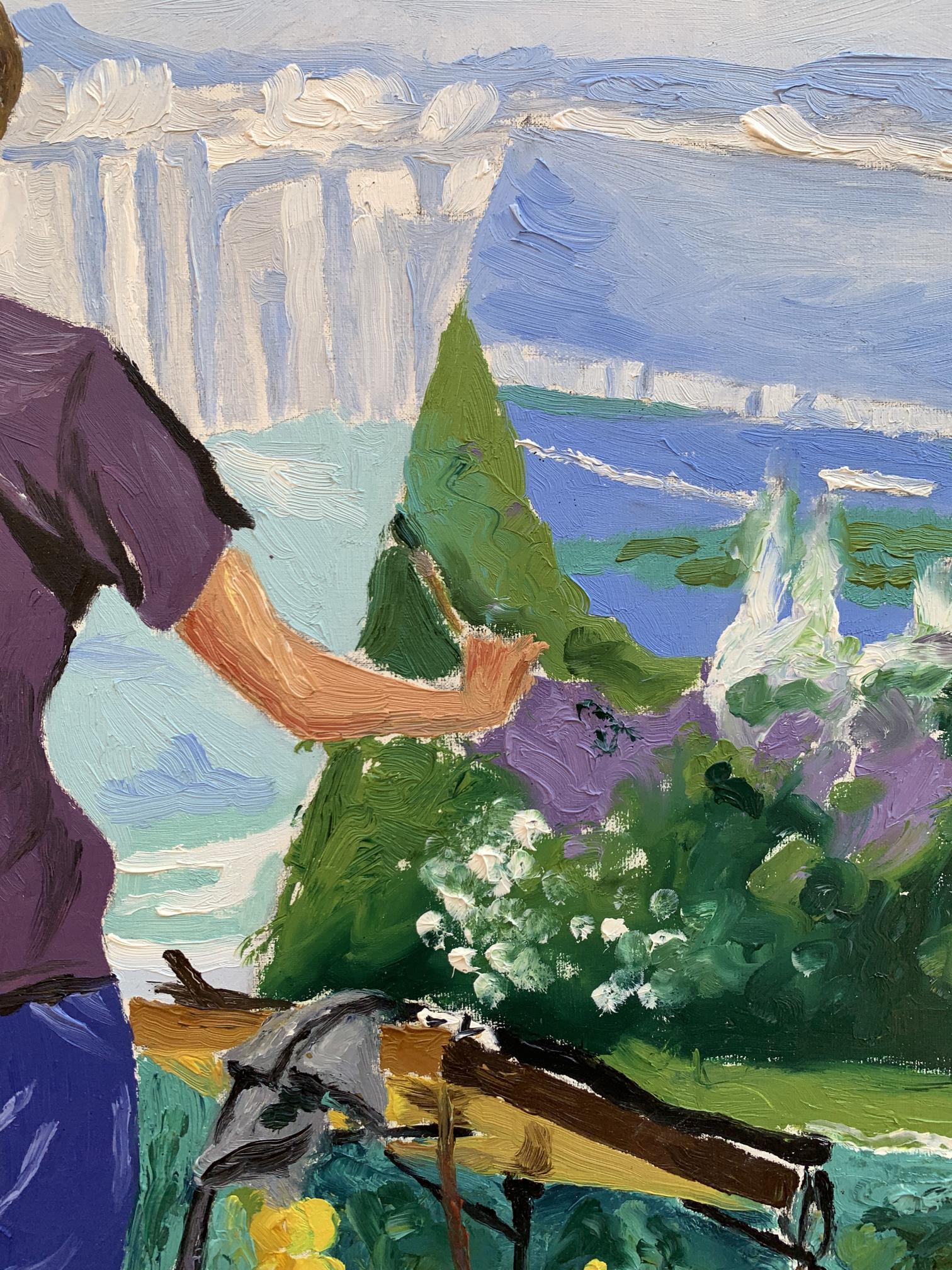 The painting titled "A Site with a View of the City" portrays a serene yet dynamic moment of artistic expression. The composition centers around an artist standing on a lush green hill, observing and recreating the panoramic cityscape before him. Using bold and vibrant oil strokes, the artist captures the juxtaposition of natural beauty and urban life.In the foreground, the figure of the artist is presented from behind, emphasizing his focus on the canvas and the scene ahead. He wears a casual purple shirt and blue jeans, highlighting the simplicity of his attire against the vibrant setting. The painter’s easel, tools, and canvas stand out amidst the greenery, suggesting that he is deeply immersed in his work. His posture, slightly leaning forward with his hand gesturing toward the city, conveys a sense of dedication and contemplation.The background reveals a breathtaking view of the cityscape, featuring a blend of architectural and natural elements. Towering modern buildings rise in the distance, painted in soft, muted tones, while a large river winds gracefully through the scene, adding depth and movement. In contrast, the foreground bursts with the colors of a verdant park, dotted with flowers and foliage. A hint of sunlight illuminates the greenery, creating a lively yet tranquil atmosphere.Through this piece, the artist explores the harmony between nature and urbanization. The vivid greenery in the foreground serves as a reminder of the natural beauty that coexists with human development. The artist's act of painting symbolizes an attempt to capture this balance and preserve the fleeting moment of connection between man, nature, and the city."A Site with a View of the City" invites the viewer to appreciate the intricate relationship between the natural world and modern life. The choice of vibrant colors and fluid brushwork reflects the artist’s admiration for the scene, while the act of painting within the painting underscores the transformative power of art in interpreting and celebrating our surroundings. This piece inspires reflection on the beauty of urban landscapes as seen through the eyes of a passionate observer.