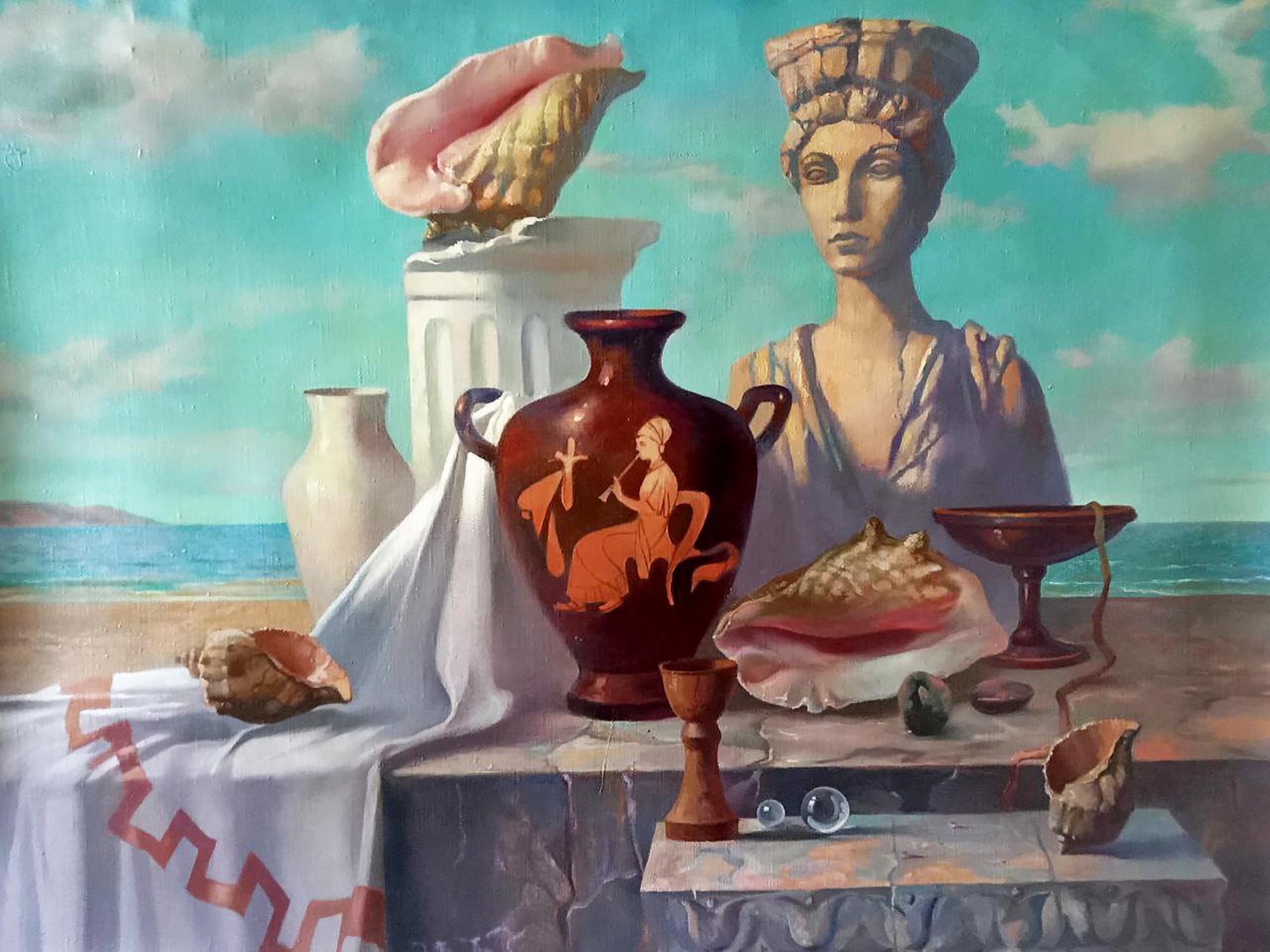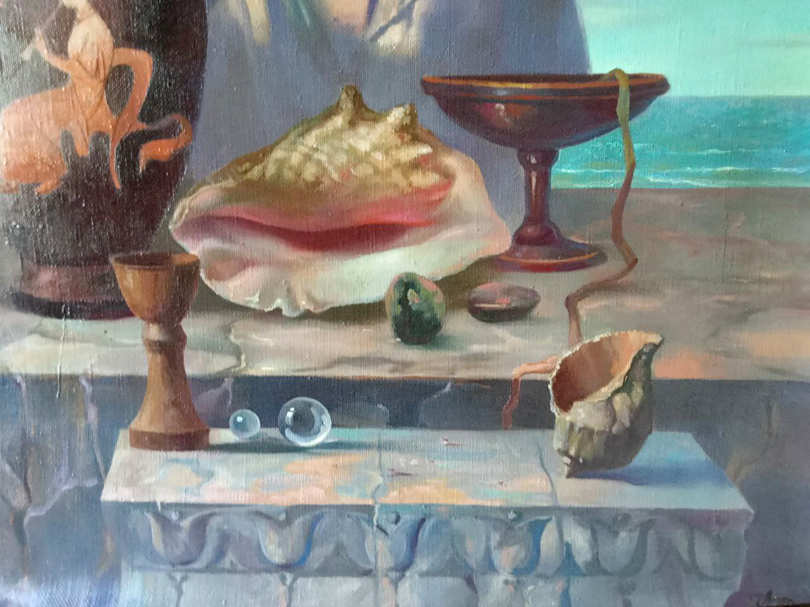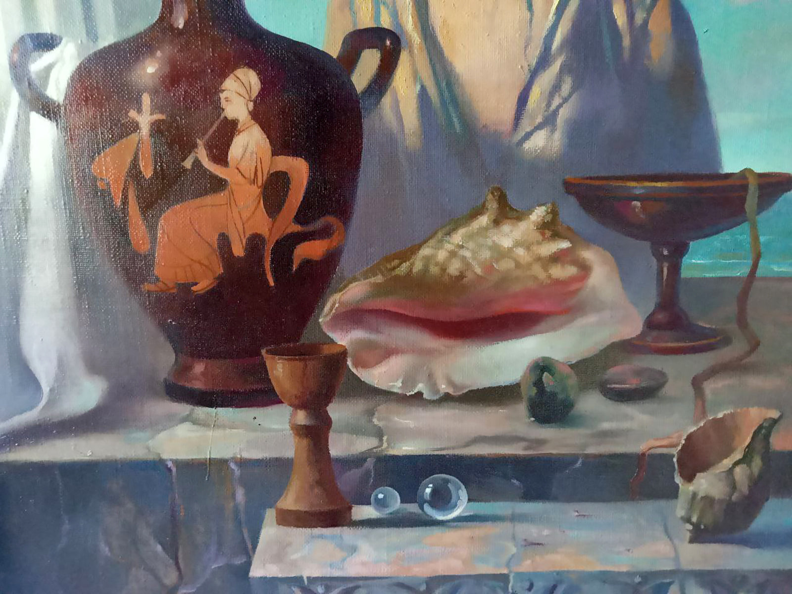 This beautiful oil painting is called "Antique still life". It captures a moment in time, with an antique statue of a girl surrounded by antique amphorae and sea shells. The colors are stunning, and the details are amazing. It's a truly special piece that would be a perfect addition to any home.