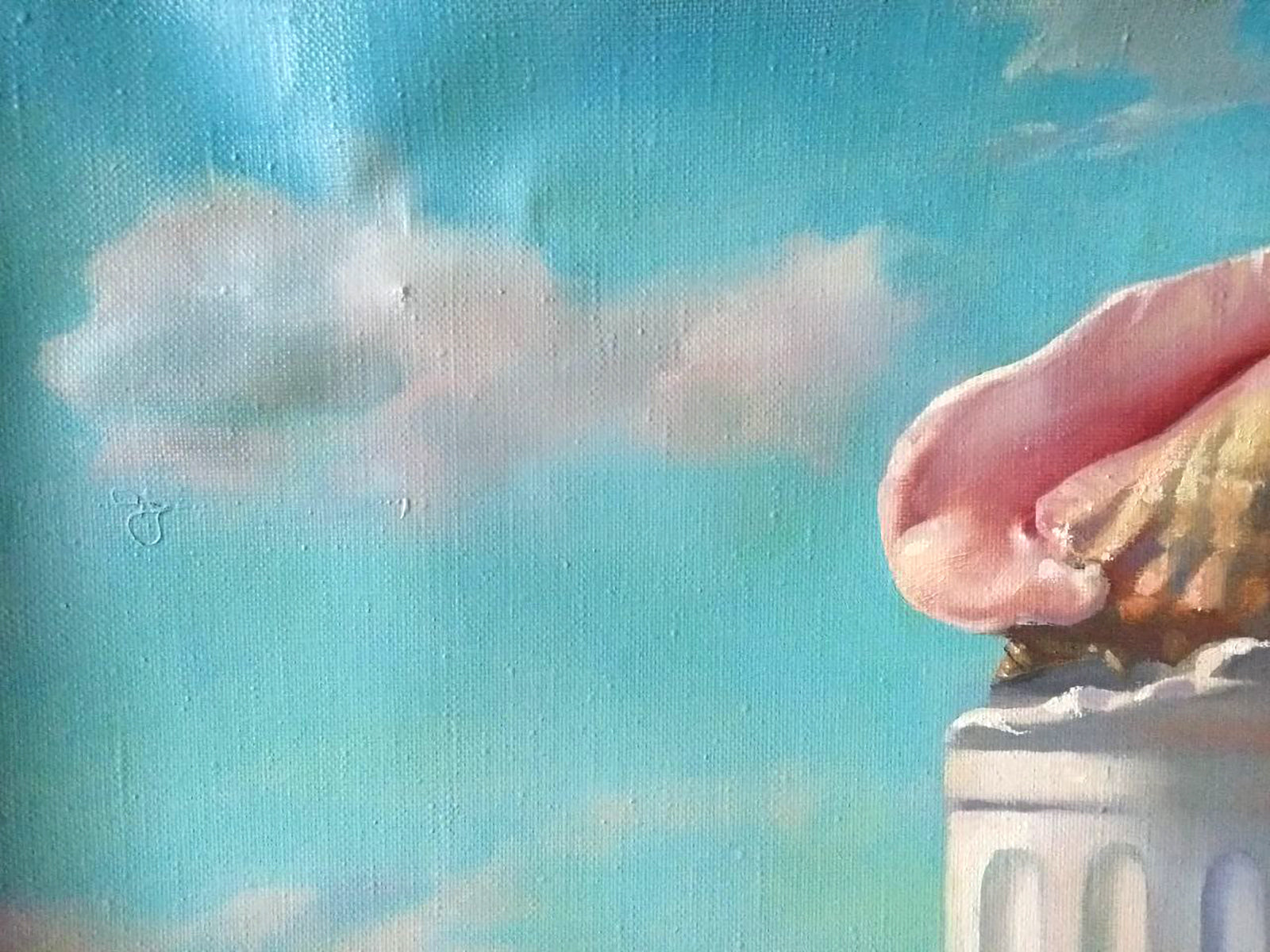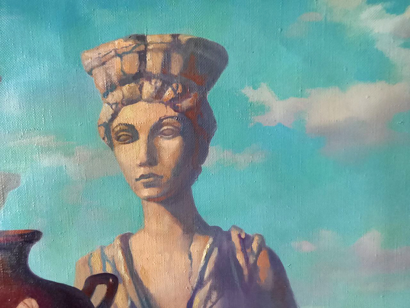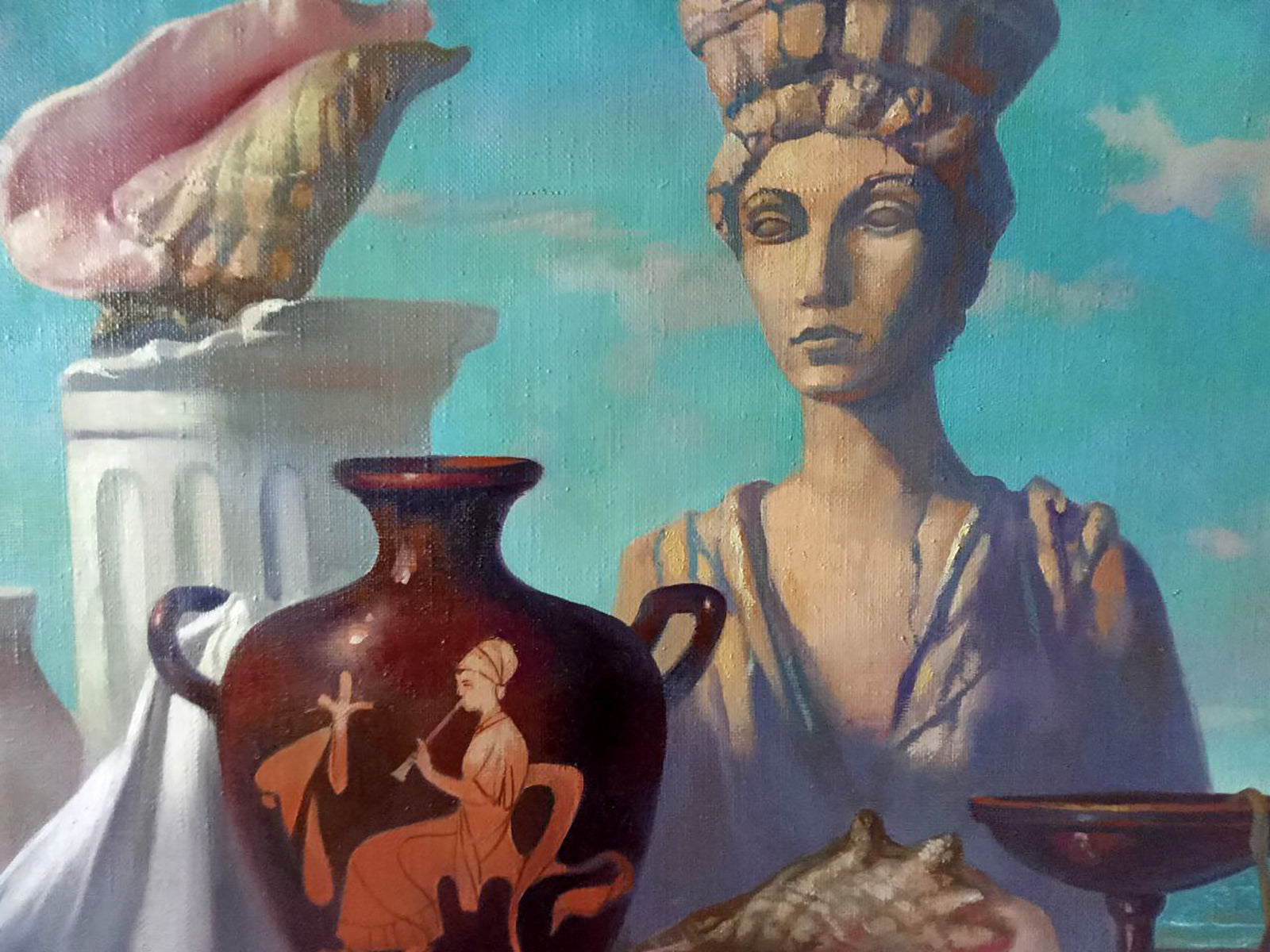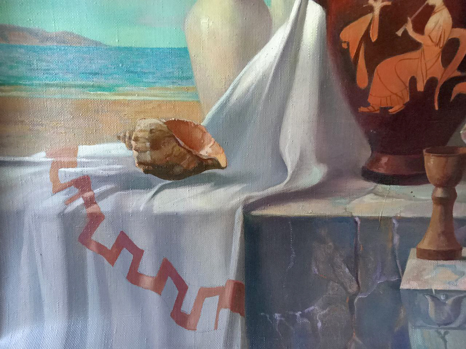 This beautiful oil painting is called "Antique still life". It captures a moment in time, with an antique statue of a girl surrounded by antique amphorae and sea shells. The colors are stunning, and the details are amazing. It's a truly special piece that would be a perfect addition to any home.
