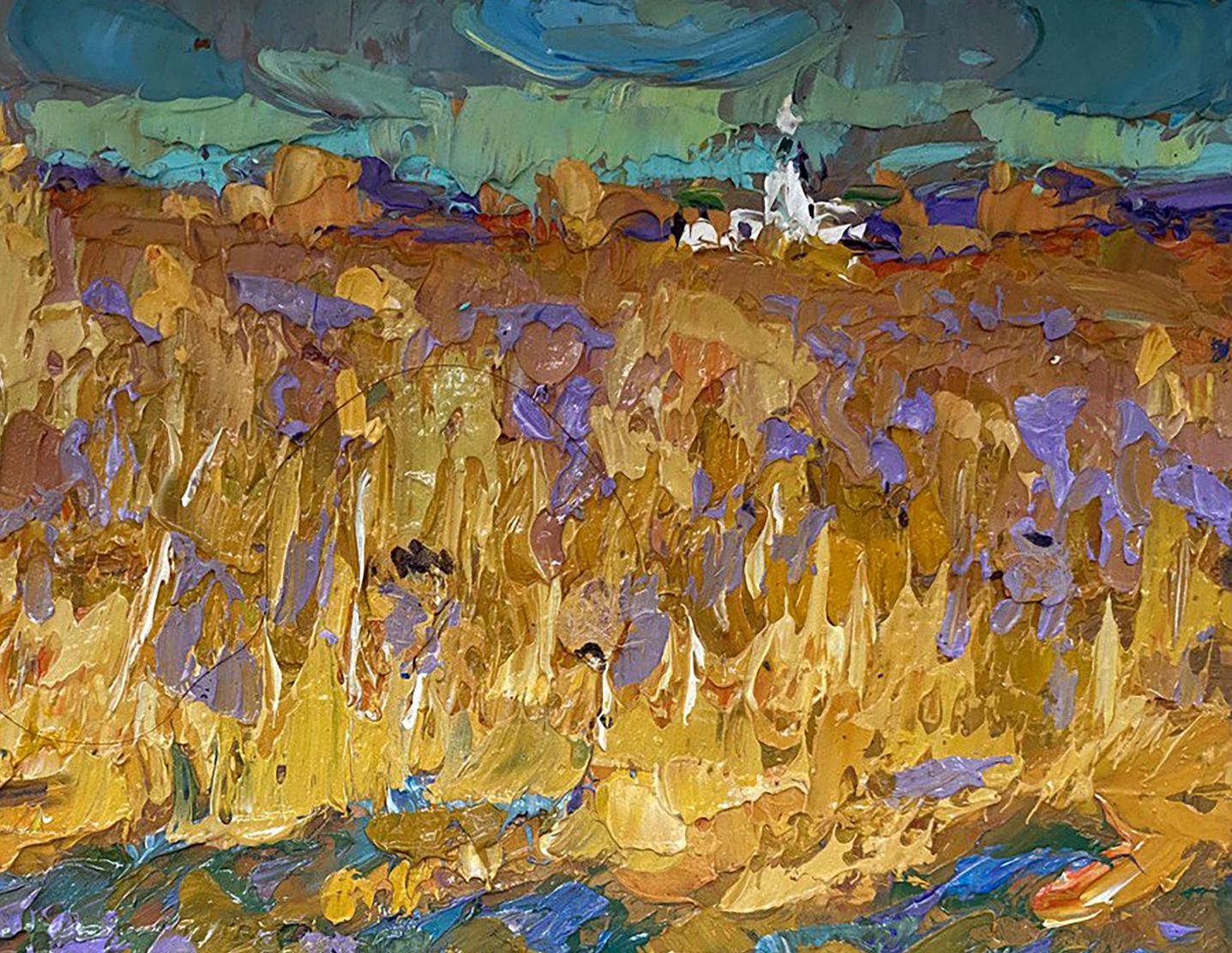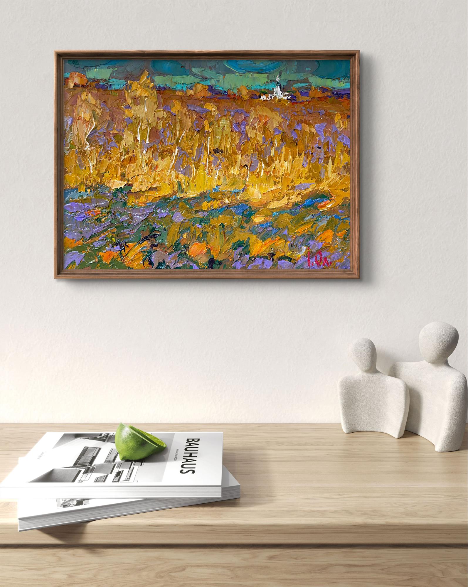 The painting titled "Autumn Distance" is a vibrant and atmospheric portrayal of a golden autumn field stretching into the horizon. The artist uses thick, textured brushstrokes and a rich, warm color palette to capture the essence of a rural landscape bathed in the soft glow of autumn light. The composition is filled with energy and movement, evoking a sense of vastness and tranquility as the viewer gazes toward the distant horizon. The foreground is dominated by earthy and golden tones, representing a field of dry autumn grass and wildflowers. The brushstrokes are thick and layered, creating a sense of texture and depth that makes the field appear almost three-dimensional. Shades of yellow, ochre, and burnt orange dominate the scene, suggesting the dryness of the grass and the richness of the autumn season. Scattered throughout the field are strokes of purple and lavender, which add contrast and visual interest to the composition. These cooler tones balance the warmth of the yellows and browns, creating a harmonious color palette that evokes the feeling of a crisp autumn day. As the viewer's eye moves further into the painting, the field transitions into more muted shades of orange, brown, and green. The middle ground suggests a landscape gently sloping toward the horizon, with subtle rises and dips in the terrain. The interplay of light and shadow across the field gives the impression of soft autumn sunlight filtering through the sky. In the middle ground, small white structures—perhaps a farmhouse or distant cottages—peek through the golden field. These tiny details add a sense of scale and distance to the painting, emphasizing the vastness of the landscape. The background is filled with soft, muted shades of blue and green, representing the sky and distant hills. The sky is painted with swirling brushstrokes that add movement and energy to the scene, suggesting a breezy autumn day. The cool tones of the sky contrast beautifully with the warm hues of the field, creating a dynamic and balanced composition. The distant horizon line is gently blurred, giving the impression of a landscape that stretches endlessly into the distance. The subtle blending of colors in the background adds to the overall feeling of depth and vastness in the painting. "Autumn Distance" evokes a sense of peace, nostalgia, and connection to nature. The painting captures the quiet beauty of a rural landscape in autumn, inviting the viewer to appreciate the changing colors of the season and the vastness of the natural world. The warm, golden tones convey a feeling of warmth and comfort, while the distant horizon suggests endless possibilities and a sense of calm. The artwork is a celebration of the beauty of autumn, capturing the fleeting moment when nature is at its most colorful and vibrant before the onset of winter. It invites the viewer to pause, reflect, and appreciate the simple beauty of the changing seasons.