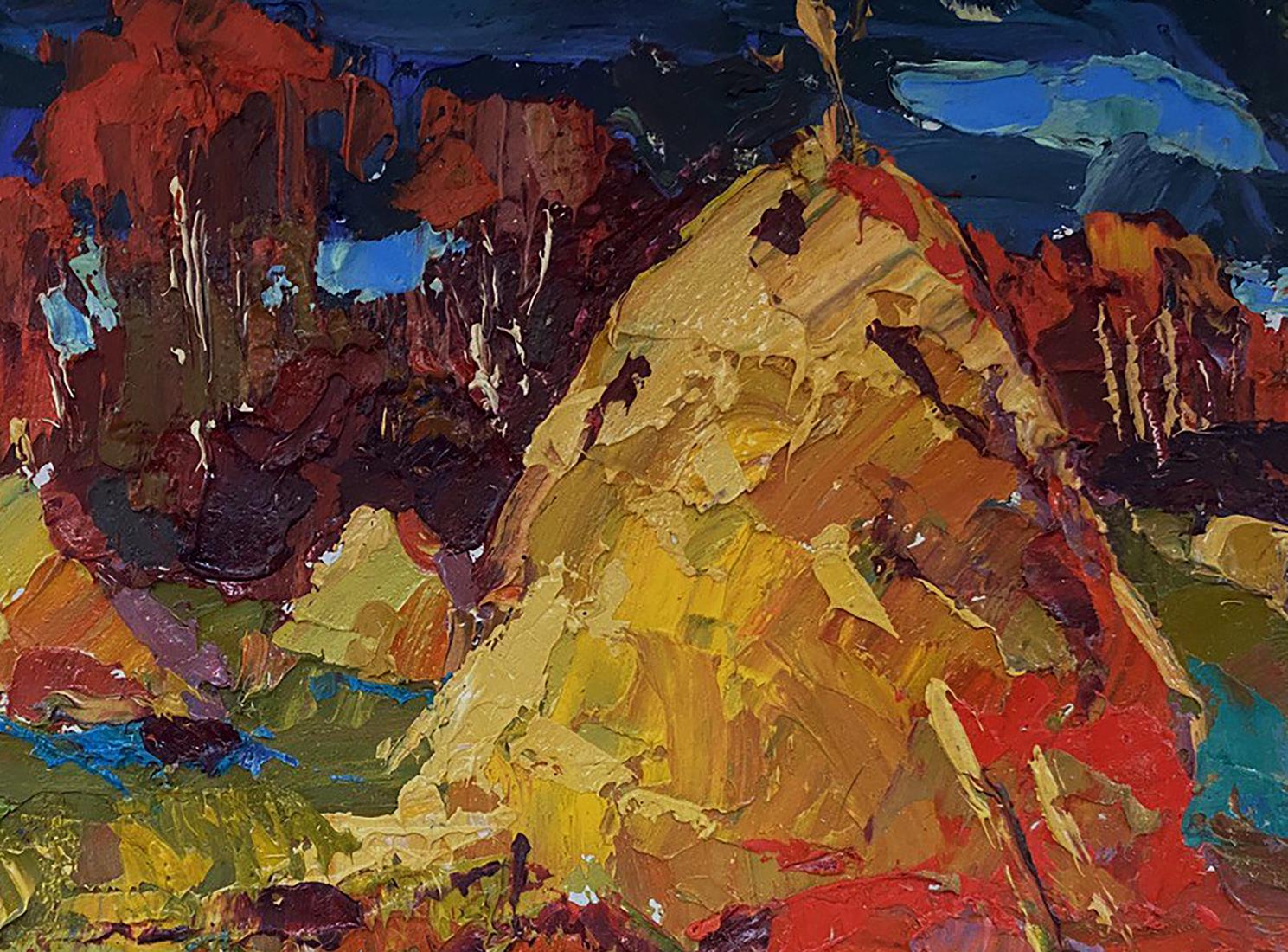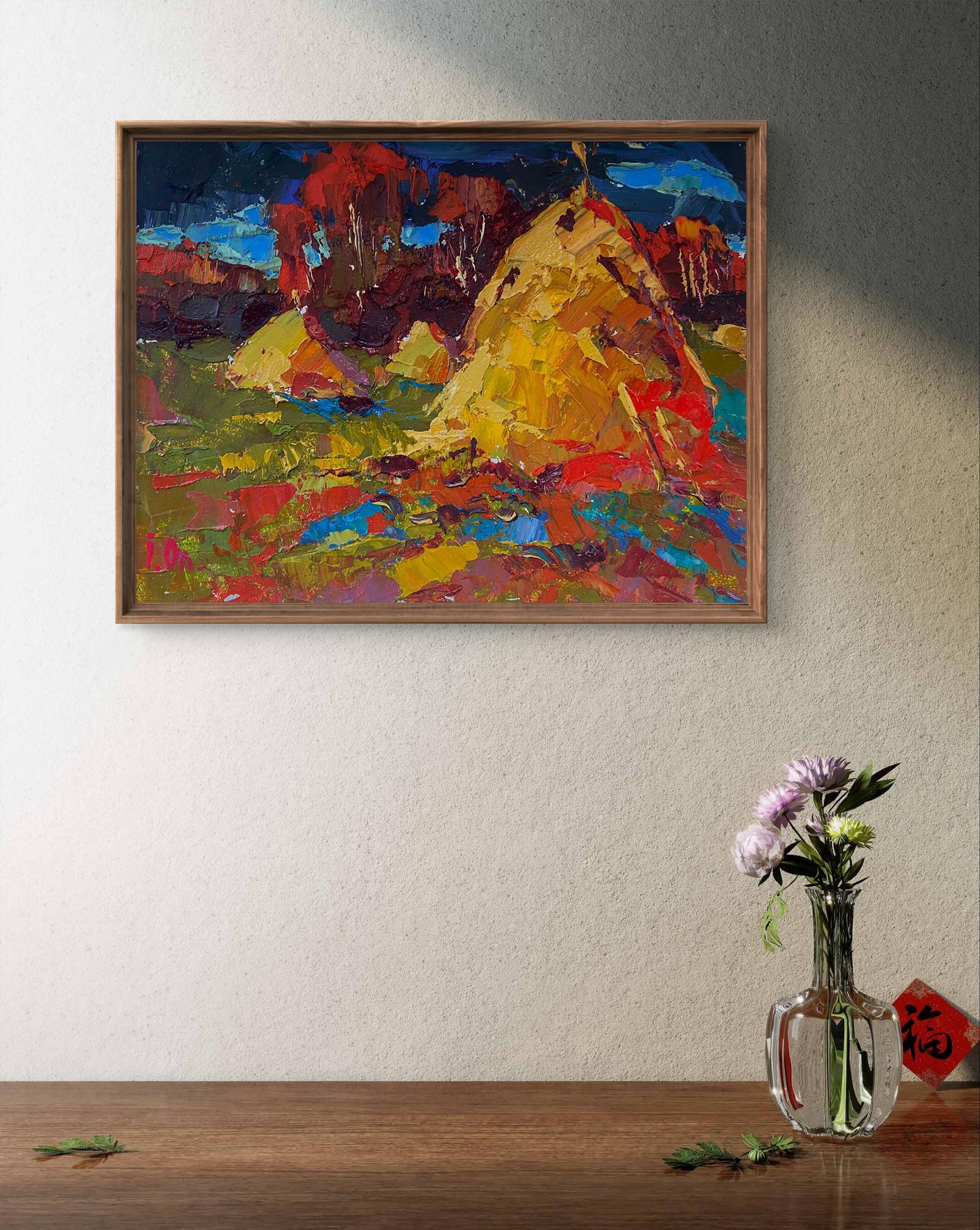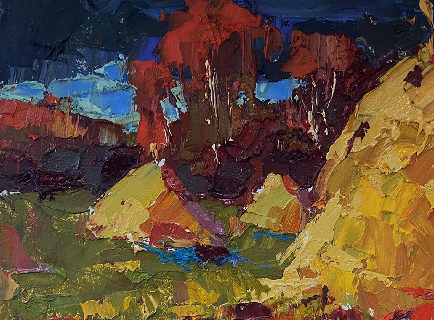 The painting titled "Autumn Field" depicts a vibrant rural landscape, capturing the richness of the autumn season. The scene is filled with bold colors and textured brushstrokes that bring a dynamic and expressive quality to the artwork. The warm hues of the field, combined with the deep tones of the background, create a striking contrast that evokes a sense of warmth, harvest, and the beauty of nature's transformation. The foreground is a lively patchwork of warm colors—golden yellows, reds, and earthy greens—representing an autumn field in full splendor. The thick, impasto brushstrokes give the field a textured, almost tactile appearance, creating the impression of layered leaves, grass, and soil. The vibrant red and orange tones suggest fallen leaves scattered across the field, while the green patches indicate lingering grass that has not yet been overtaken by autumn's colors. There are also hints of blue and purple throughout the foreground, adding contrast and depth to the composition. These cooler tones provide a balance to the warm hues and evoke the impression of shadows cast by the haystacks and trees in the distance. In the middle ground, two large haystacks dominate the composition. Painted in shades of gold, orange, and brown, the haystacks stand out as focal points in the landscape. Their textured appearance, created through thick, layered brushstrokes, gives them a three-dimensional quality. The haystacks symbolize the harvest season, a time of hard work and abundance in rural life. Surrounding the haystacks are patches of red and green vegetation, which blend seamlessly with the colors of the field. The use of bold, expressive brushstrokes adds movement and energy to the scene, suggesting the gentle rustling of leaves and grass in the autumn breeze. The background features a dense cluster of trees painted in deep, rich tones of red, brown, and dark green. The trees are highlighted with touches of blue and white, indicating patches of sky visible through the foliage. The dark, moody colors of the background contrast with the warm tones of the field and haystacks, creating a sense of depth and distance in the painting. The sky above is painted in shades of deep blue and teal, with hints of lighter blue peeking through the clouds. The dramatic, swirling brushstrokes in the sky add a sense of movement and atmosphere to the scene, suggesting an overcast day with changing weather. "Autumn Field" conveys a sense of warmth, abundance, and connection to nature. The painting celebrates the beauty of the autumn season, with its vibrant colors and textures symbolizing the richness of the harvest. The dynamic brushstrokes and bold color choices create a lively, energetic atmosphere, while the presence of the haystacks adds a feeling of stability and tradition. The artwork invites the viewer to appreciate the changing seasons and the natural rhythms of rural life. It evokes a sense of nostalgia for simpler times and reminds us of the enduring beauty of the countryside during autumn.