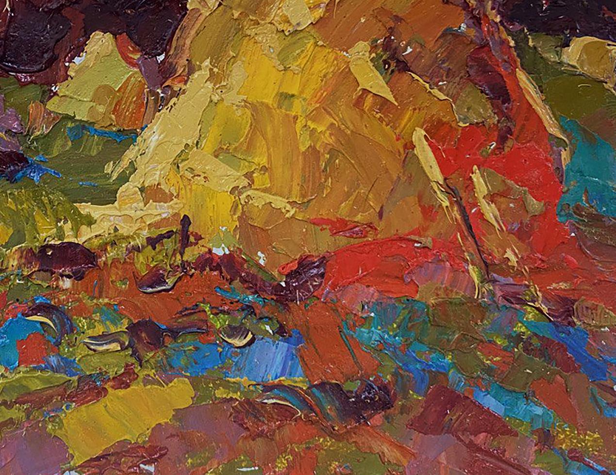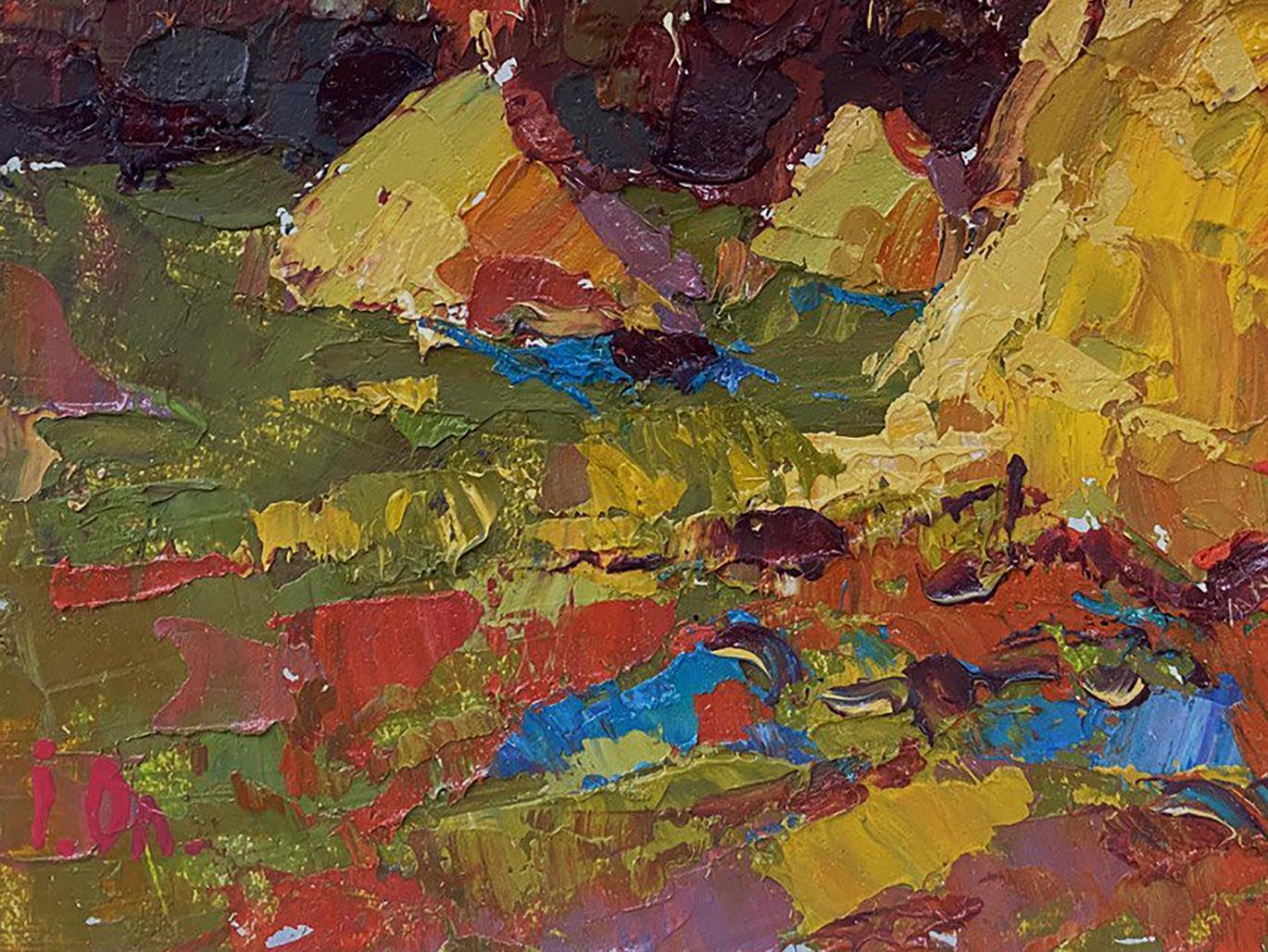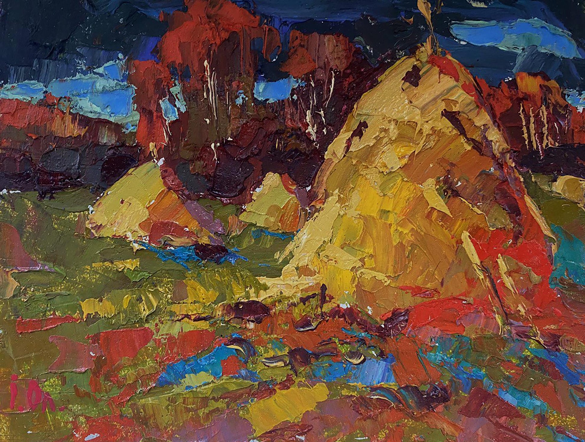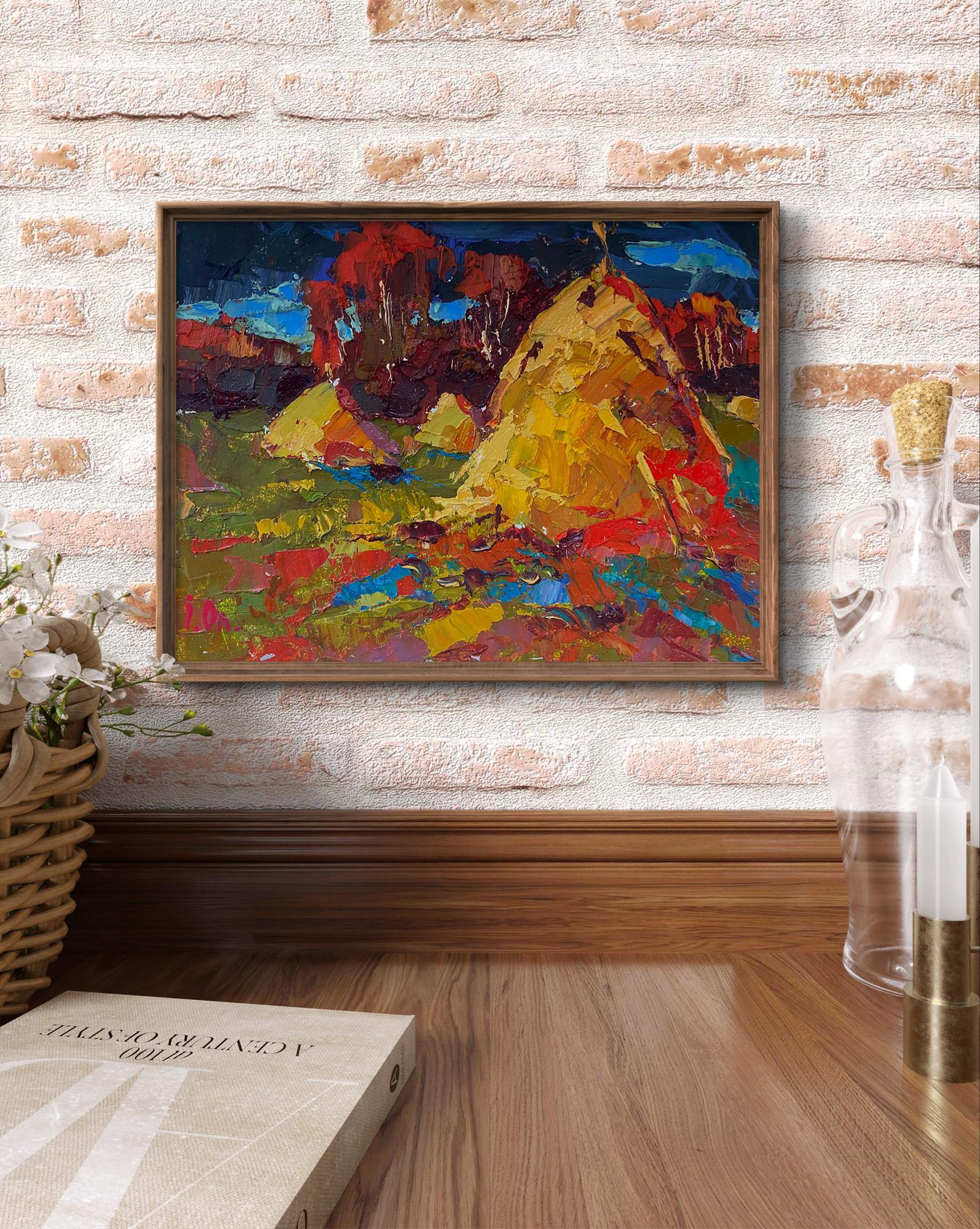The painting titled "Autumn Field" depicts a vibrant rural landscape, capturing the richness of the autumn season. The scene is filled with bold colors and textured brushstrokes that bring a dynamic and expressive quality to the artwork. The warm hues of the field, combined with the deep tones of the background, create a striking contrast that evokes a sense of warmth, harvest, and the beauty of nature's transformation. The foreground is a lively patchwork of warm colors—golden yellows, reds, and earthy greens—representing an autumn field in full splendor. The thick, impasto brushstrokes give the field a textured, almost tactile appearance, creating the impression of layered leaves, grass, and soil. The vibrant red and orange tones suggest fallen leaves scattered across the field, while the green patches indicate lingering grass that has not yet been overtaken by autumn's colors. There are also hints of blue and purple throughout the foreground, adding contrast and depth to the composition. These cooler tones provide a balance to the warm hues and evoke the impression of shadows cast by the haystacks and trees in the distance. In the middle ground, two large haystacks dominate the composition. Painted in shades of gold, orange, and brown, the haystacks stand out as focal points in the landscape. Their textured appearance, created through thick, layered brushstrokes, gives them a three-dimensional quality. The haystacks symbolize the harvest season, a time of hard work and abundance in rural life. Surrounding the haystacks are patches of red and green vegetation, which blend seamlessly with the colors of the field. The use of bold, expressive brushstrokes adds movement and energy to the scene, suggesting the gentle rustling of leaves and grass in the autumn breeze. The background features a dense cluster of trees painted in deep, rich tones of red, brown, and dark green. The trees are highlighted with touches of blue and white, indicating patches of sky visible through the foliage. The dark, moody colors of the background contrast with the warm tones of the field and haystacks, creating a sense of depth and distance in the painting. The sky above is painted in shades of deep blue and teal, with hints of lighter blue peeking through the clouds. The dramatic, swirling brushstrokes in the sky add a sense of movement and atmosphere to the scene, suggesting an overcast day with changing weather. "Autumn Field" conveys a sense of warmth, abundance, and connection to nature. The painting celebrates the beauty of the autumn season, with its vibrant colors and textures symbolizing the richness of the harvest. The dynamic brushstrokes and bold color choices create a lively, energetic atmosphere, while the presence of the haystacks adds a feeling of stability and tradition. The artwork invites the viewer to appreciate the changing seasons and the natural rhythms of rural life. It evokes a sense of nostalgia for simpler times and reminds us of the enduring beauty of the countryside during autumn.