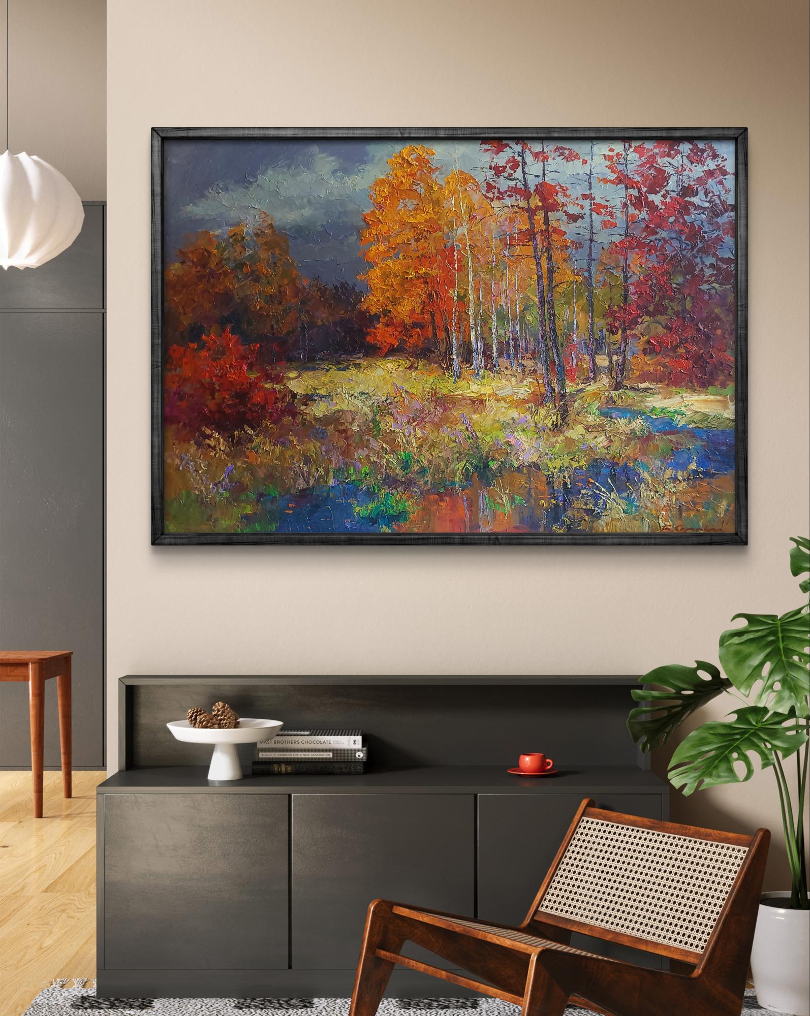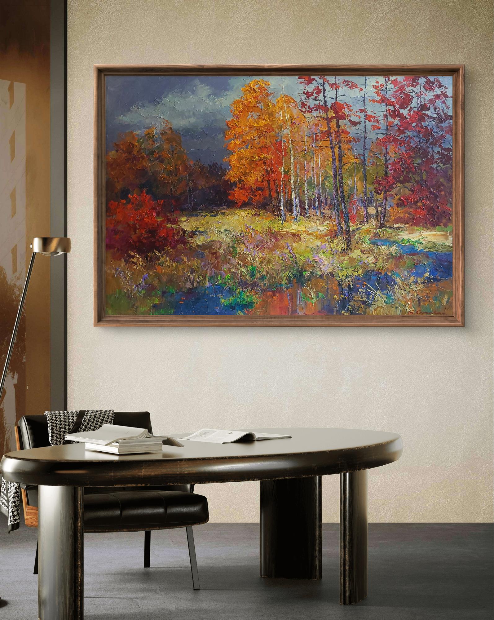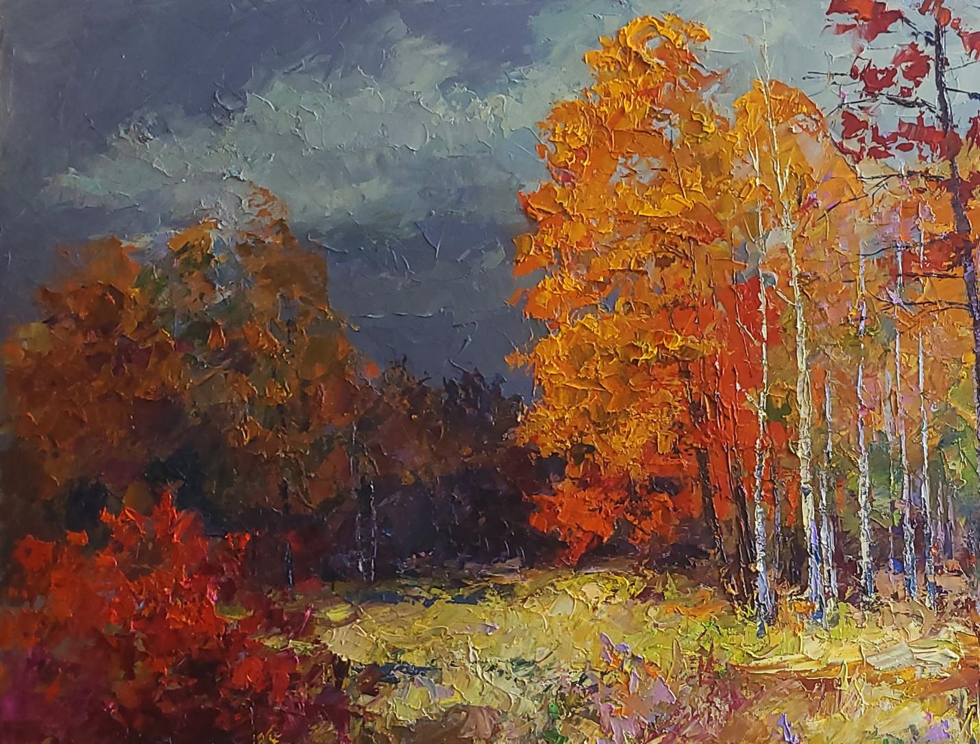 The painting titled "Autumn Forest" captures the vibrant and emotional essence of fall. The artist masterfully uses bold, textured strokes of oil paint to depict a natural scene alive with rich, warm colors that embody the transition of seasons.The composition centers on a grove of tall trees, their slender trunks reaching upward while their leaves are ablaze with fiery hues of red, orange, and golden yellow. The interplay of these colors creates a striking contrast against the dark, overcast sky, which looms ominously in the background. This dramatic sky enhances the vibrancy of the foliage, emphasizing the fleeting beauty of autumn as it resists the impending chill of winter.In the foreground, a quiet, reflective pond mirrors the surrounding colors, introducing cool tones of blue and green that balance the warmth of the fiery leaves. The water's surface is depicted with a serene quality, its calmness offering a moment of stillness amidst the dynamic energy of the trees. The grasses and shrubs near the waterline add layers of texture and subtle shades of purple and gold, enhancing the richness of the scene.The artist’s brushstrokes are deliberate yet expressive, lending the work a sense of movement as if the wind is gently rustling the leaves. The scene invites the viewer to step into the forest, to hear the crunch of leaves underfoot and feel the crisp autumn air.Through this piece, the artist seeks to convey the transient beauty of nature. "Autumn Forest" is not just a visual representation of a season but a meditation on the passage of time and the inevitability of change. The vibrant colors symbolize life and energy, while the darkening sky hints at the cyclical nature of existence. The painting urges the viewer to pause, to appreciate the fleeting moments of beauty in the natural world, and to find solace in its rhythms and transformations.