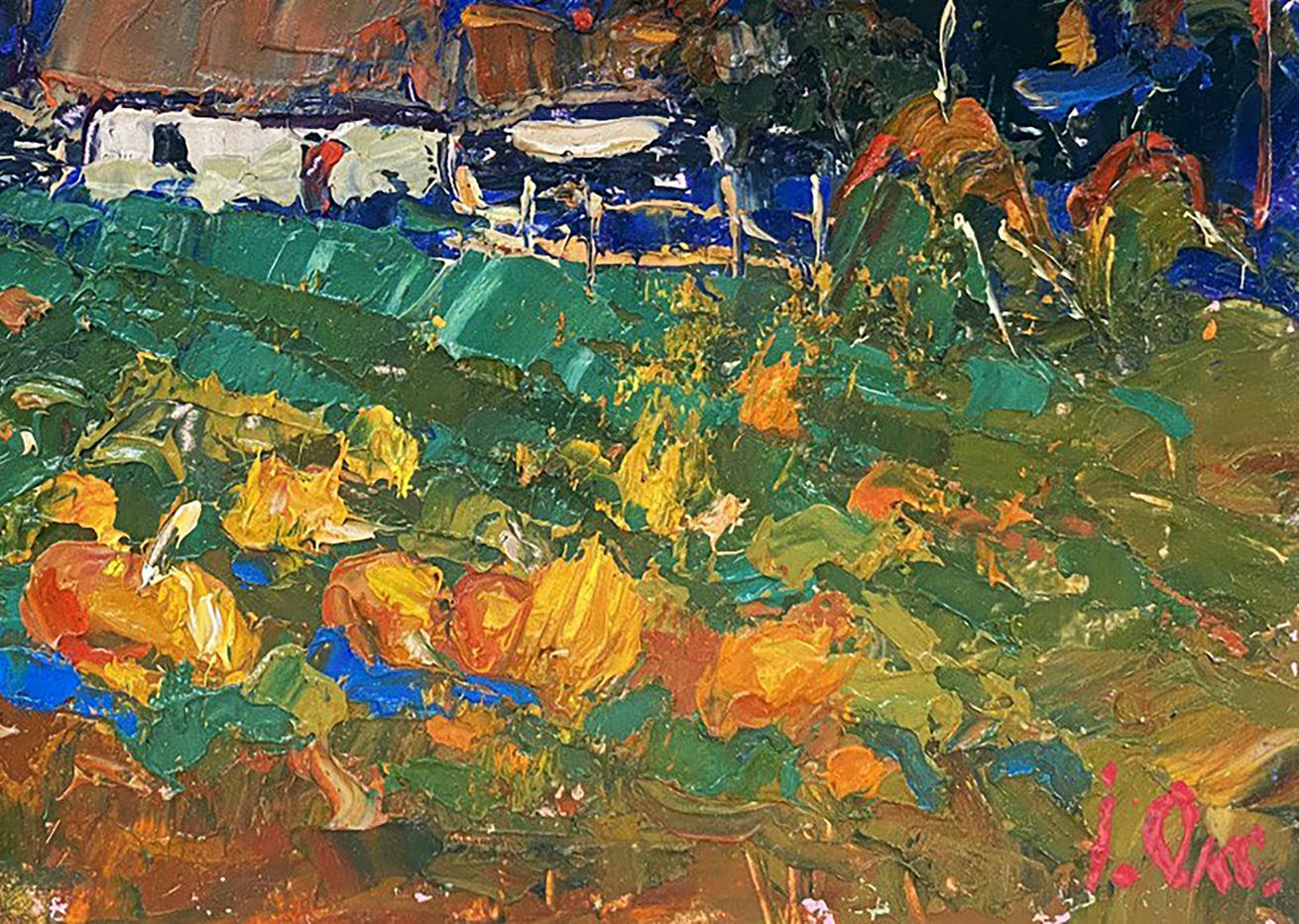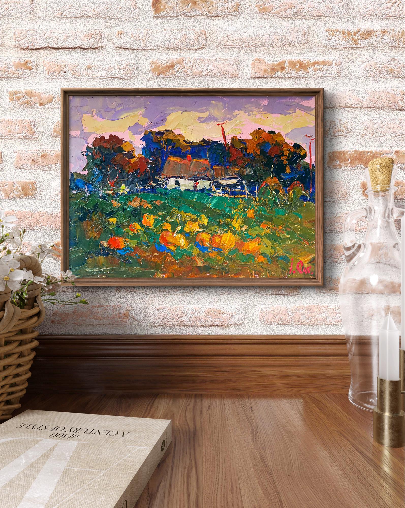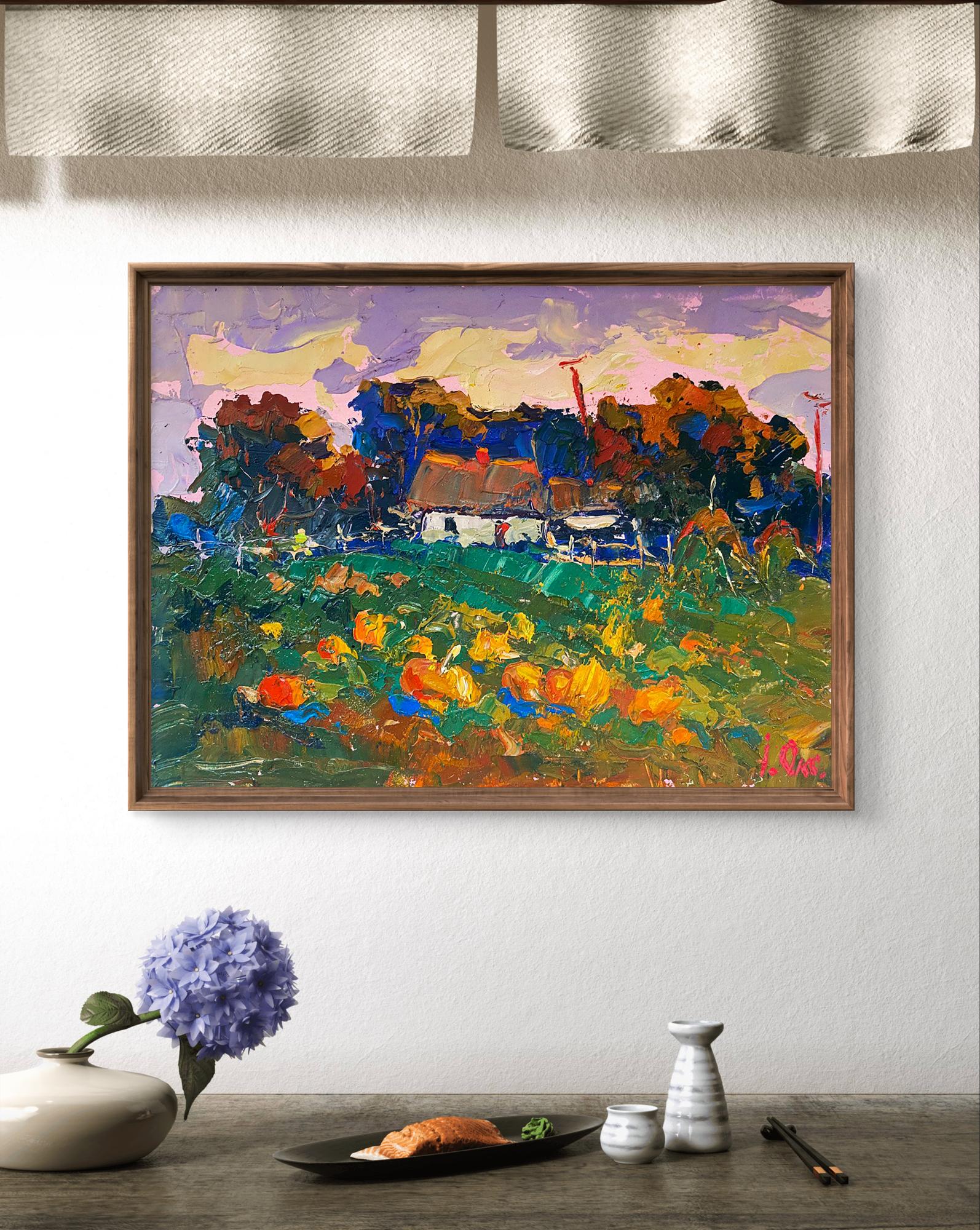 The painting titled "Autumn Gardens" captures the vibrant and colorful essence of a rural garden in the heart of autumn. The artist masterfully uses bold brushstrokes and a rich palette of warm, earthy tones to bring the landscape to life. The scene portrays a traditional village house surrounded by lush greenery and an abundant garden filled with large, bright pumpkins, reflecting the harvest season's bounty and warmth. The foreground is dominated by a pumpkin-filled garden, painted in rich shades of orange, yellow, and red. The pumpkins, scattered across the green field, are depicted with thick, textured brushstrokes, giving them a three-dimensional, tactile quality. The bright, warm colors of the pumpkins contrast beautifully with the cooler green tones of the grass and foliage, creating a vibrant, dynamic composition. The grass and garden plants are painted in shades of green and blue, with hints of brown and yellow, suggesting the natural textures of leaves and soil. The varied brushstrokes give the impression of movement, as if a gentle autumn breeze is rustling through the garden. In the middle ground stands a traditional rural house with a thatched roof, painted in soft shades of white and brown. The house exudes a cozy, welcoming charm, with its warm roof tones and rustic structure. The thatched roof is painted with thick, layered strokes in earthy hues, creating a natural texture that reflects the light and warmth of the autumn day. The house is surrounded by a simple wooden fence and patches of greenery, suggesting a well-tended garden and a peaceful, rural setting. The fence adds structure to the composition, guiding the viewer’s eye toward the house and emphasizing the cozy, enclosed feel of the garden. The background features a dense row of trees painted in deep, warm tones of red, orange, and brown, indicating that the trees are in full autumn bloom. The vibrant foliage contrasts with the cooler sky, adding depth and richness to the composition. The trees create a natural border for the scene, framing the house and garden and adding a sense of privacy and tranquility. Above the trees, the sky is painted in soft pastel shades of pink, purple, and yellow, suggesting a serene sunset or a peaceful autumn afternoon. The sky’s swirling brushstrokes add a sense of movement and atmosphere, enhancing the overall mood of the painting. "Autumn Gardens" evokes a sense of warmth, abundance, and connection to nature. The painting captures the beauty and simplicity of rural life during the harvest season, celebrating the bounty of the earth and the changing colors of autumn. The vibrant colors and dynamic brushstrokes create a lively, cheerful atmosphere, inviting the viewer to appreciate the quiet joys of nature and tradition. The artwork reflects the timeless charm of the countryside, reminding us of the natural rhythms of life and the beauty of seasonal change. It is a celebration of home, harvest, and the simple pleasures of rural living.