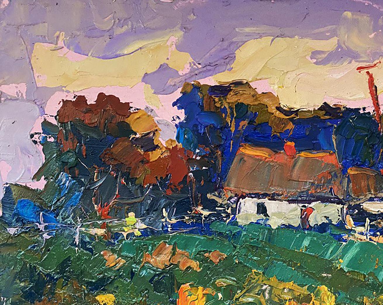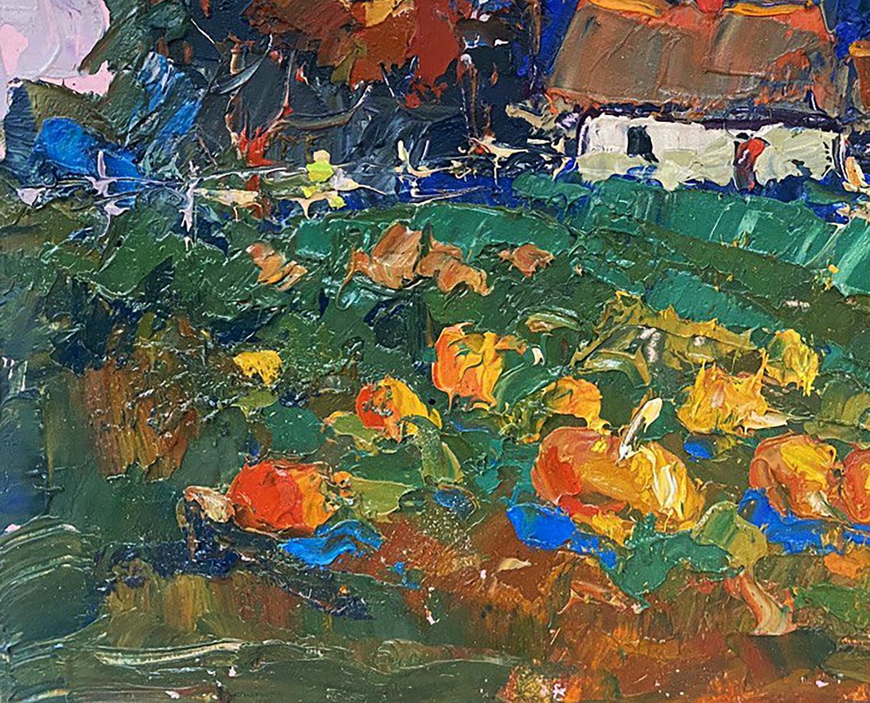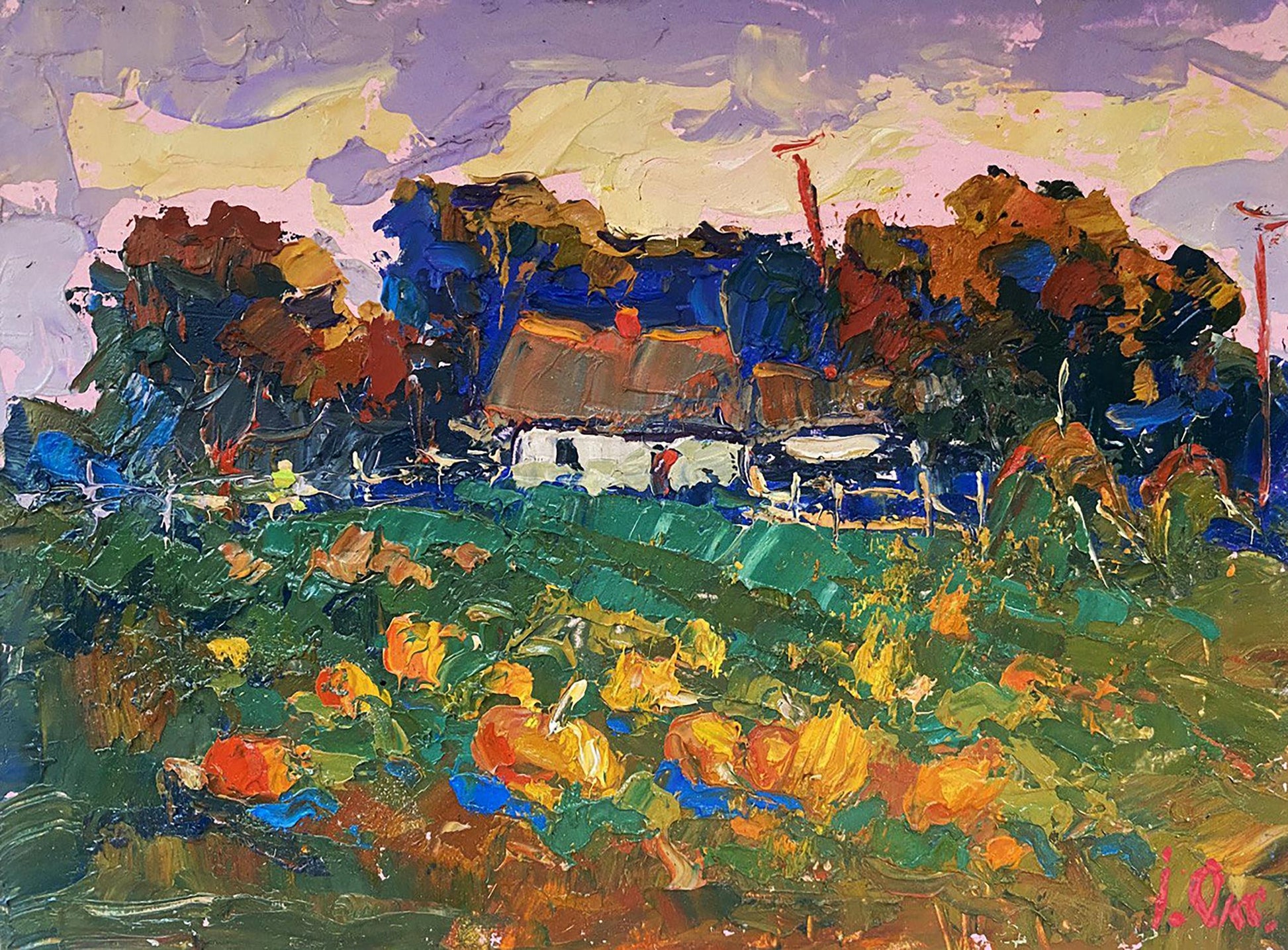 The painting titled "Autumn Gardens" captures the vibrant and colorful essence of a rural garden in the heart of autumn. The artist masterfully uses bold brushstrokes and a rich palette of warm, earthy tones to bring the landscape to life. The scene portrays a traditional village house surrounded by lush greenery and an abundant garden filled with large, bright pumpkins, reflecting the harvest season's bounty and warmth. The foreground is dominated by a pumpkin-filled garden, painted in rich shades of orange, yellow, and red. The pumpkins, scattered across the green field, are depicted with thick, textured brushstrokes, giving them a three-dimensional, tactile quality. The bright, warm colors of the pumpkins contrast beautifully with the cooler green tones of the grass and foliage, creating a vibrant, dynamic composition. The grass and garden plants are painted in shades of green and blue, with hints of brown and yellow, suggesting the natural textures of leaves and soil. The varied brushstrokes give the impression of movement, as if a gentle autumn breeze is rustling through the garden. In the middle ground stands a traditional rural house with a thatched roof, painted in soft shades of white and brown. The house exudes a cozy, welcoming charm, with its warm roof tones and rustic structure. The thatched roof is painted with thick, layered strokes in earthy hues, creating a natural texture that reflects the light and warmth of the autumn day. The house is surrounded by a simple wooden fence and patches of greenery, suggesting a well-tended garden and a peaceful, rural setting. The fence adds structure to the composition, guiding the viewer’s eye toward the house and emphasizing the cozy, enclosed feel of the garden. The background features a dense row of trees painted in deep, warm tones of red, orange, and brown, indicating that the trees are in full autumn bloom. The vibrant foliage contrasts with the cooler sky, adding depth and richness to the composition. The trees create a natural border for the scene, framing the house and garden and adding a sense of privacy and tranquility. Above the trees, the sky is painted in soft pastel shades of pink, purple, and yellow, suggesting a serene sunset or a peaceful autumn afternoon. The sky’s swirling brushstrokes add a sense of movement and atmosphere, enhancing the overall mood of the painting. "Autumn Gardens" evokes a sense of warmth, abundance, and connection to nature. The painting captures the beauty and simplicity of rural life during the harvest season, celebrating the bounty of the earth and the changing colors of autumn. The vibrant colors and dynamic brushstrokes create a lively, cheerful atmosphere, inviting the viewer to appreciate the quiet joys of nature and tradition. The artwork reflects the timeless charm of the countryside, reminding us of the natural rhythms of life and the beauty of seasonal change. It is a celebration of home, harvest, and the simple pleasures of rural living.
