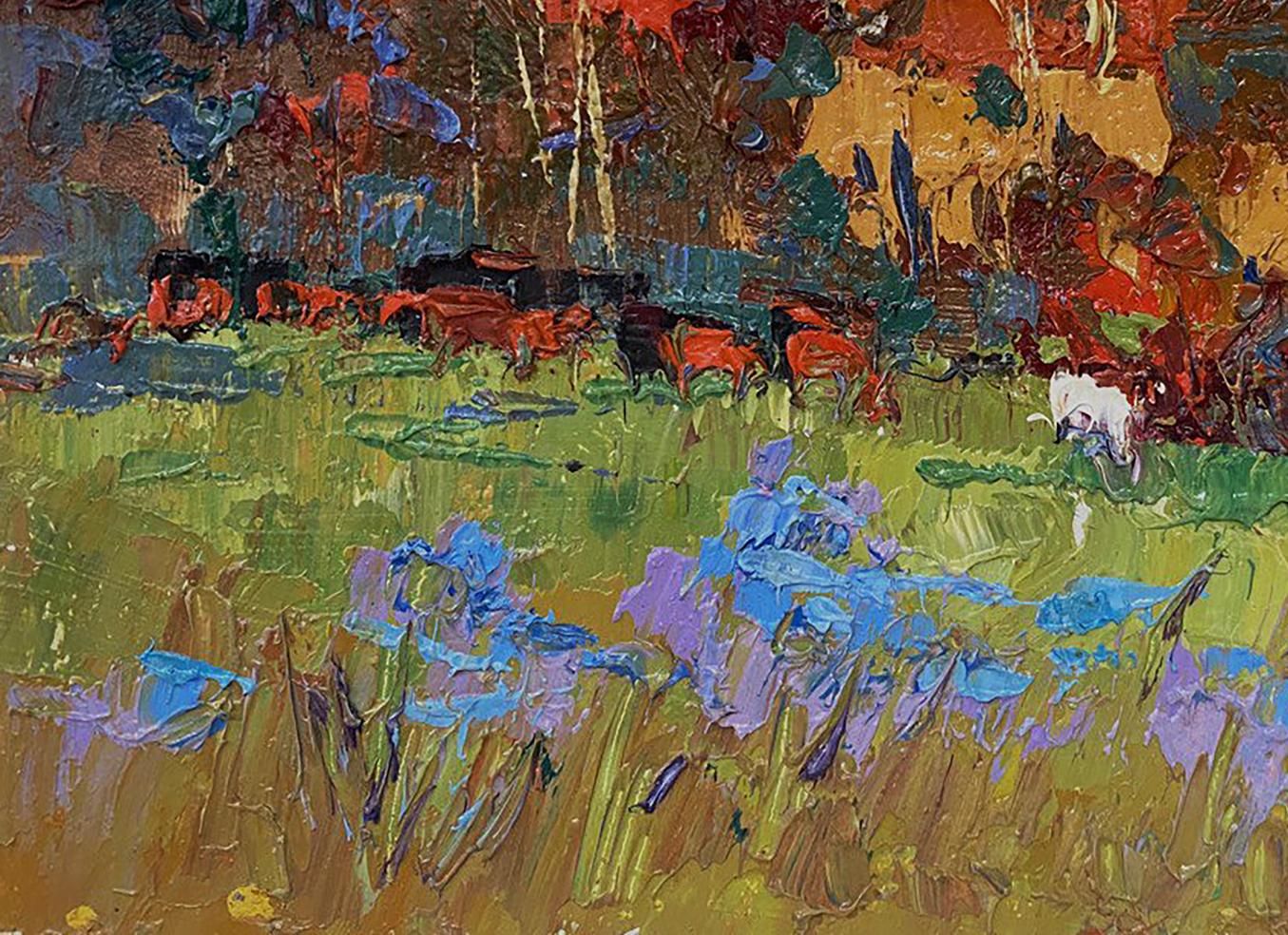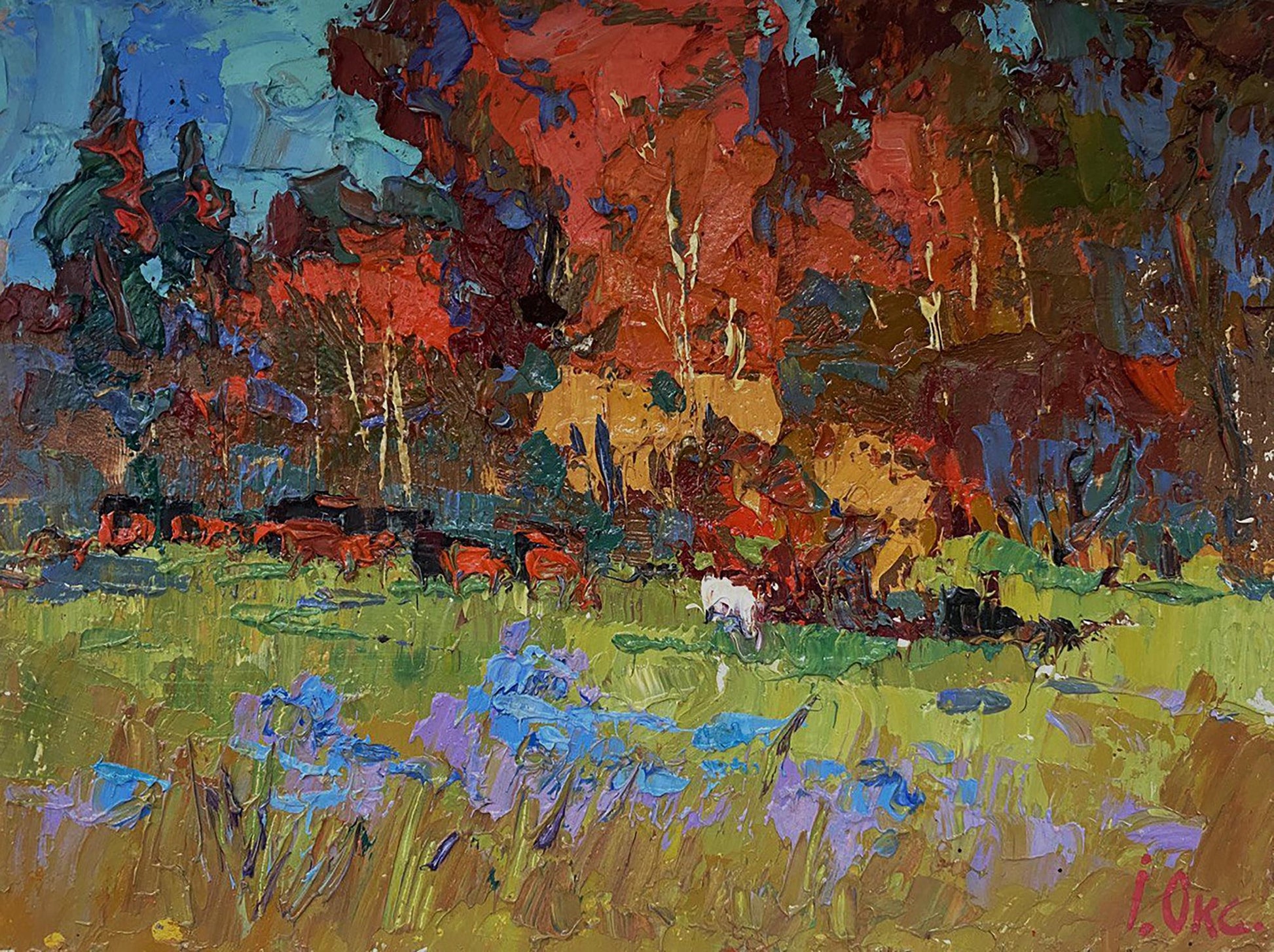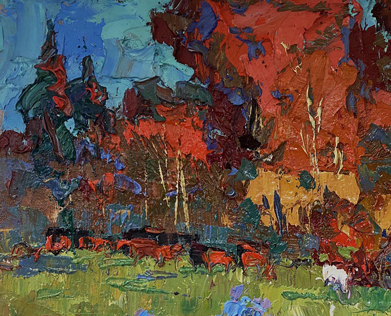 The painting titled "Autumn Has Started" beautifully captures the essence of early autumn, showcasing a vibrant landscape where nature begins its transformation from lush greenery to the warm hues of fall. The artist masterfully uses bold, textured brushstrokes and a striking color palette to bring the scene to life, creating a dynamic composition filled with energy and emotion. The foreground is dominated by lush green grass, painted with thick, expressive brushstrokes. The fresh, lively greens are accented by patches of purple and blue flowers, adding a delicate touch to the landscape. The flowers, depicted in shades of lavender and bright blue, bring contrast to the scene and suggest the remnants of summer blooms before the full arrival of autumn. The brushstrokes in the foreground are bold and layered, creating a textured, almost three-dimensional effect. The use of vibrant colors draws the viewer’s attention to the details of the field, inviting them to explore the natural beauty of the landscape. The middle ground features a group of grazing cattle, painted in warm shades of red, brown, and black. The animals are scattered across the field, adding a sense of life and movement to the scene. Among the herd is a white animal, possibly a goat or sheep, standing out against the darker tones of the other animals and the surrounding foliage. The presence of the animals emphasizes the rural, pastoral setting of the painting, evoking a sense of peace and harmony with nature. The background is a riot of autumn colors, with trees painted in fiery shades of red, orange, and gold. The dense foliage suggests that the trees are in the early stages of autumn, with their leaves just beginning to change color. The warm hues of the trees contrast beautifully with the cooler tones of the sky and the foreground, creating a balanced and harmonious composition. The sky above the trees is painted in a mix of teal, blue, and soft green tones, suggesting a calm, overcast day. The subtle swirls in the sky add a sense of movement and depth, enhancing the overall atmosphere of the painting. "Autumn Has Started" captures the transitional beauty of nature as summer gives way to fall. The painting evokes a sense of change and renewal, celebrating the richness of the autumn season while acknowledging the lingering presence of summer. The combination of vibrant colors and dynamic brushstrokes creates a lively, uplifting atmosphere that invites the viewer to appreciate the simple beauty of the natural world. The artwork conveys a sense of peace and harmony, reminding the viewer of the cyclical rhythms of nature and the quiet joys of rural life. It is a celebration of color, texture, and the ever-changing beauty of the seasons.