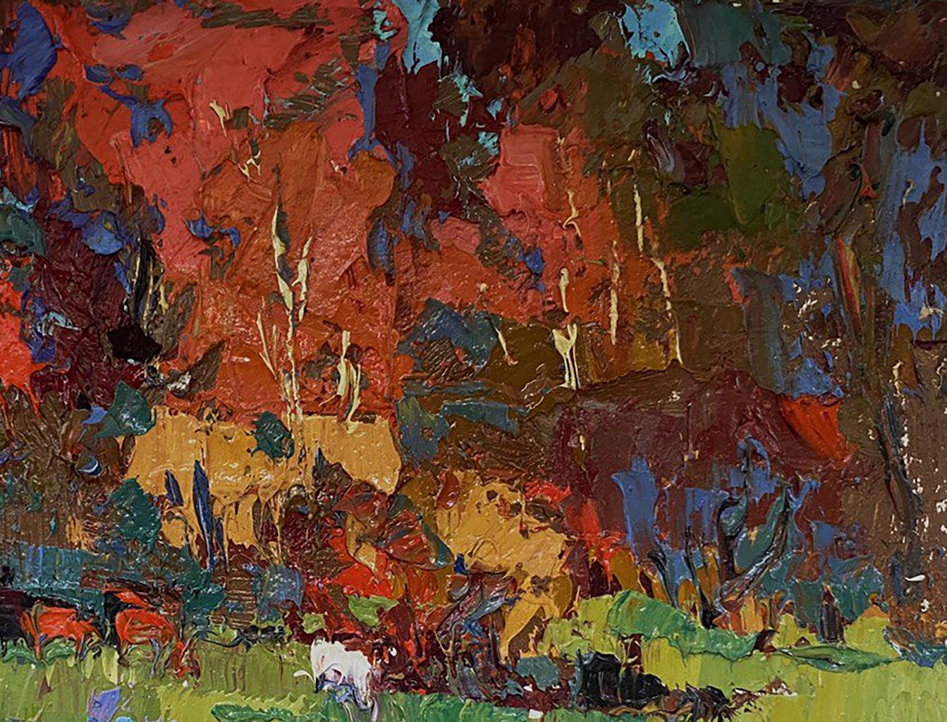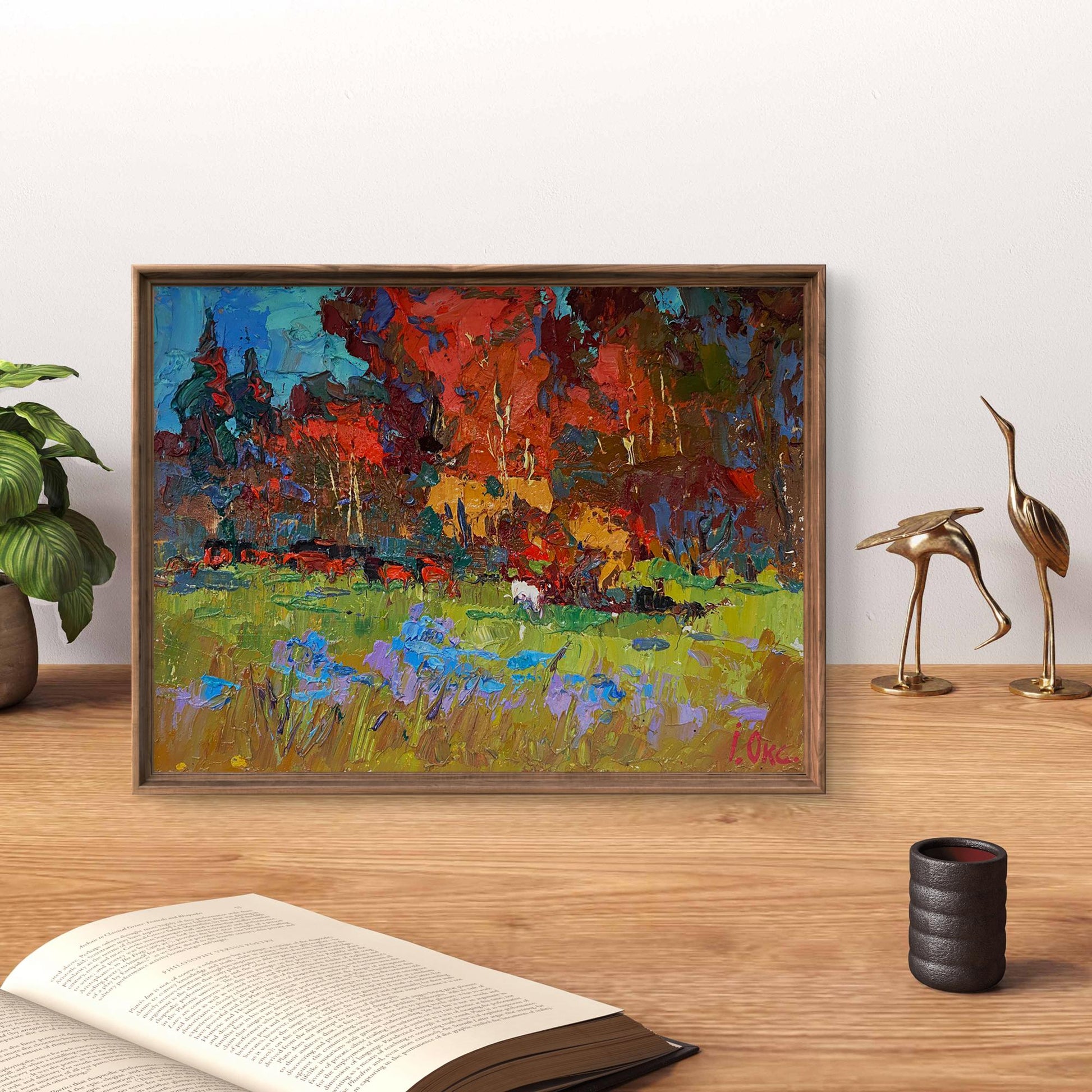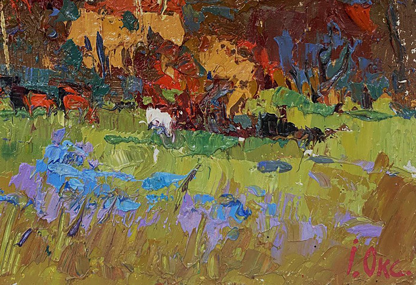 The painting titled "Autumn Has Started" beautifully captures the essence of early autumn, showcasing a vibrant landscape where nature begins its transformation from lush greenery to the warm hues of fall. The artist masterfully uses bold, textured brushstrokes and a striking color palette to bring the scene to life, creating a dynamic composition filled with energy and emotion. The foreground is dominated by lush green grass, painted with thick, expressive brushstrokes. The fresh, lively greens are accented by patches of purple and blue flowers, adding a delicate touch to the landscape. The flowers, depicted in shades of lavender and bright blue, bring contrast to the scene and suggest the remnants of summer blooms before the full arrival of autumn. The brushstrokes in the foreground are bold and layered, creating a textured, almost three-dimensional effect. The use of vibrant colors draws the viewer’s attention to the details of the field, inviting them to explore the natural beauty of the landscape. The middle ground features a group of grazing cattle, painted in warm shades of red, brown, and black. The animals are scattered across the field, adding a sense of life and movement to the scene. Among the herd is a white animal, possibly a goat or sheep, standing out against the darker tones of the other animals and the surrounding foliage. The presence of the animals emphasizes the rural, pastoral setting of the painting, evoking a sense of peace and harmony with nature. The background is a riot of autumn colors, with trees painted in fiery shades of red, orange, and gold. The dense foliage suggests that the trees are in the early stages of autumn, with their leaves just beginning to change color. The warm hues of the trees contrast beautifully with the cooler tones of the sky and the foreground, creating a balanced and harmonious composition. The sky above the trees is painted in a mix of teal, blue, and soft green tones, suggesting a calm, overcast day. The subtle swirls in the sky add a sense of movement and depth, enhancing the overall atmosphere of the painting. "Autumn Has Started" captures the transitional beauty of nature as summer gives way to fall. The painting evokes a sense of change and renewal, celebrating the richness of the autumn season while acknowledging the lingering presence of summer. The combination of vibrant colors and dynamic brushstrokes creates a lively, uplifting atmosphere that invites the viewer to appreciate the simple beauty of the natural world. The artwork conveys a sense of peace and harmony, reminding the viewer of the cyclical rhythms of nature and the quiet joys of rural life. It is a celebration of color, texture, and the ever-changing beauty of the seasons.