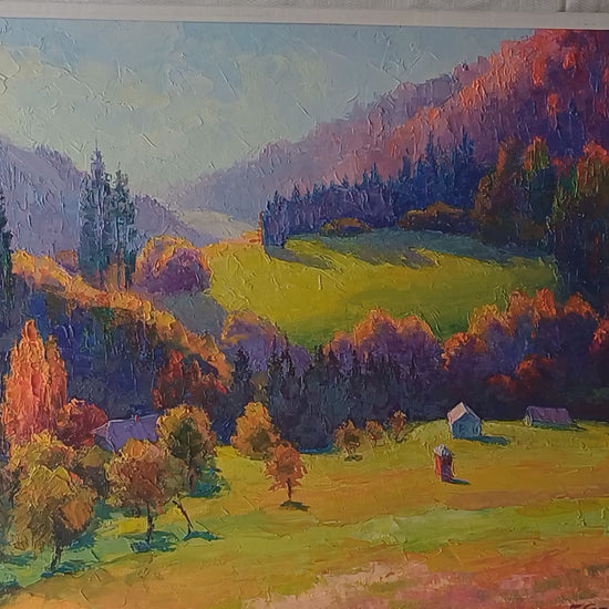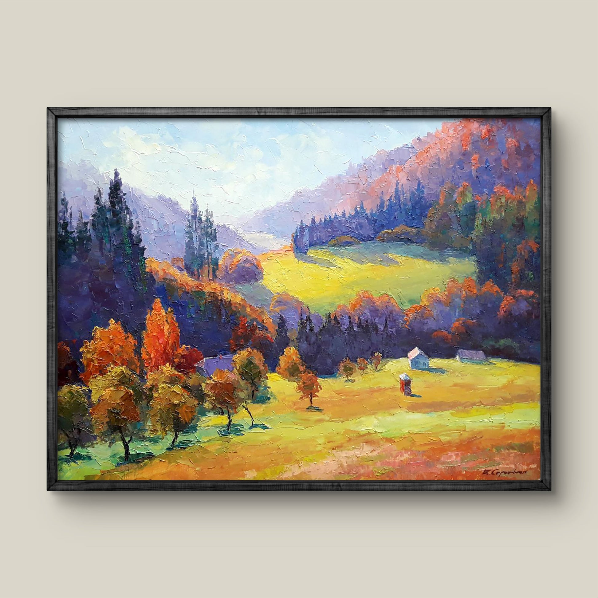 "Autumn holiday in the mountains" is an enchanting oil painting by the renowned artist Serdyuk Boris Petrovich, showcasing a serene autumn morning in all its glory. The canvas comes alive with tall trees transitioning from vibrant greens to the rich, warm tones of orange and gold, heralding the arrival of fall. This picturesque setting, devoid of rivers, hints at a secluded rural locale, embraced by rolling hills and lush fields. The artful arrangement of houses and trees in the painting creates a balanced composition, guiding the viewer’s gaze to the heart of the scene. "Autumn holiday in the mountains" captures the peaceful, tranquil beauty of fall, inviting onlookers into a tranquil world where the gentle rustle of leaves in the breeze is the only sound.