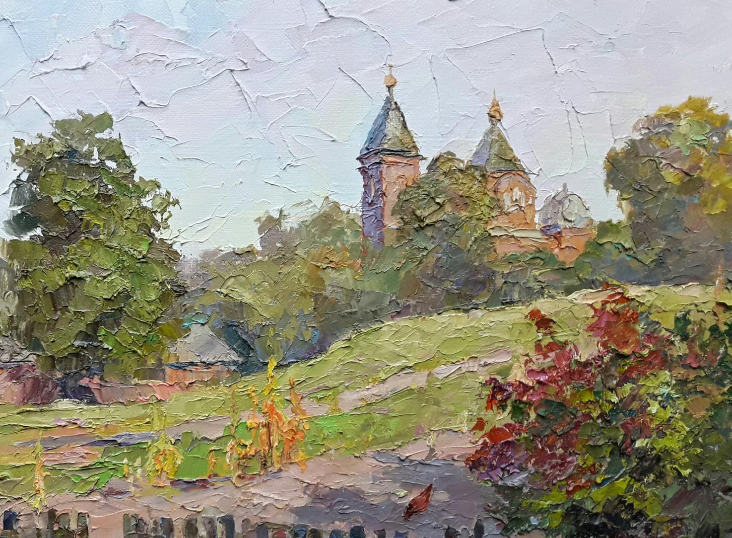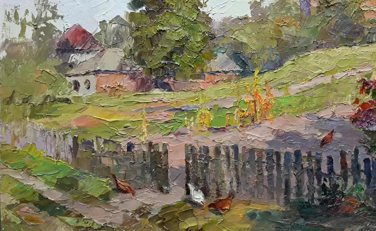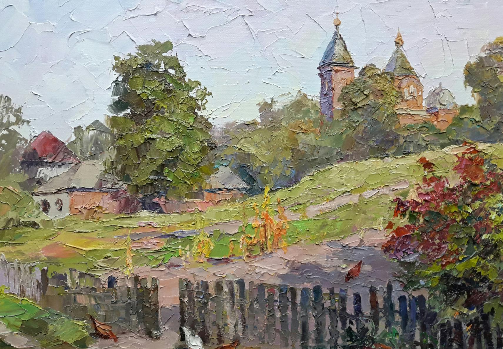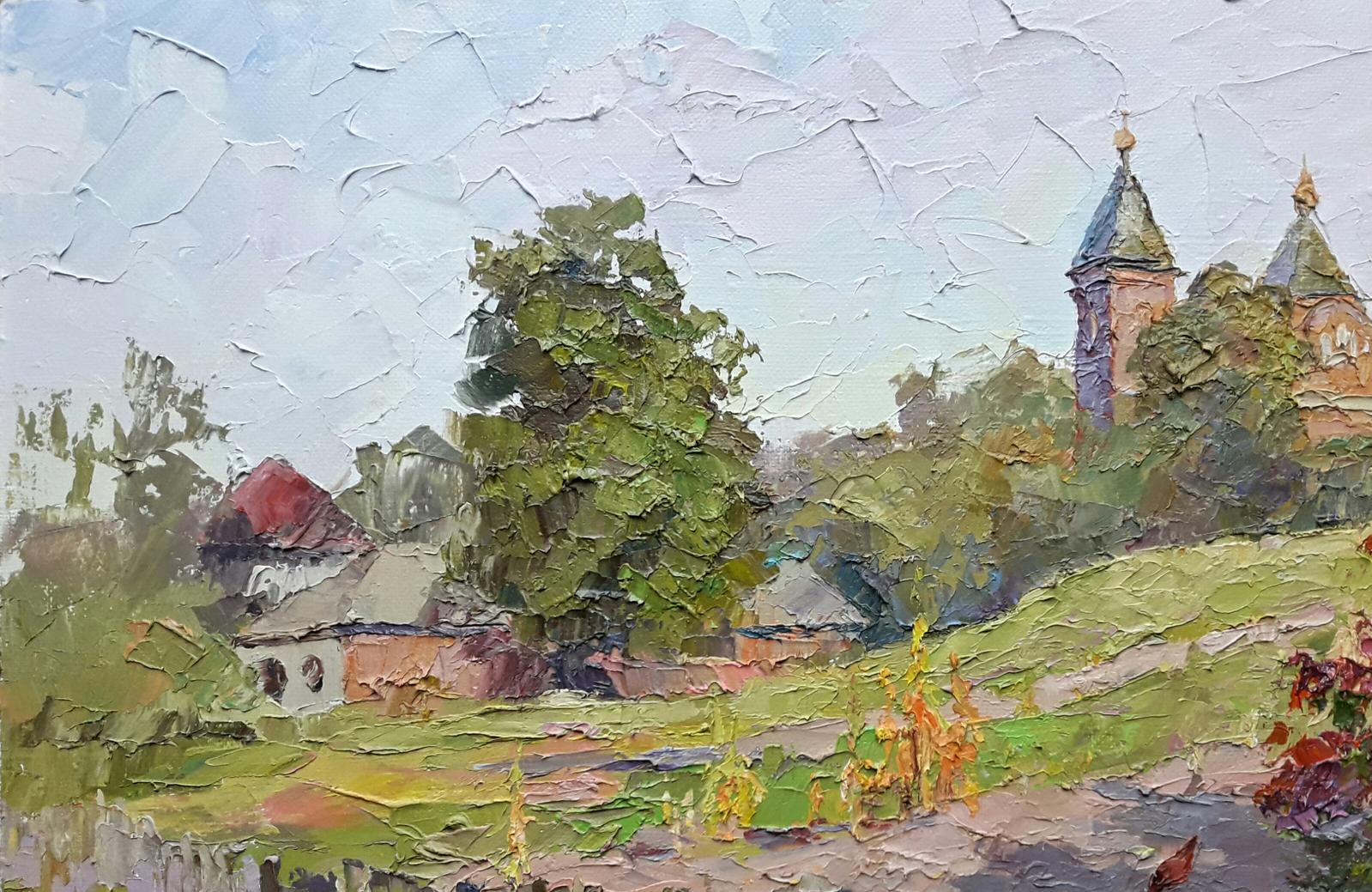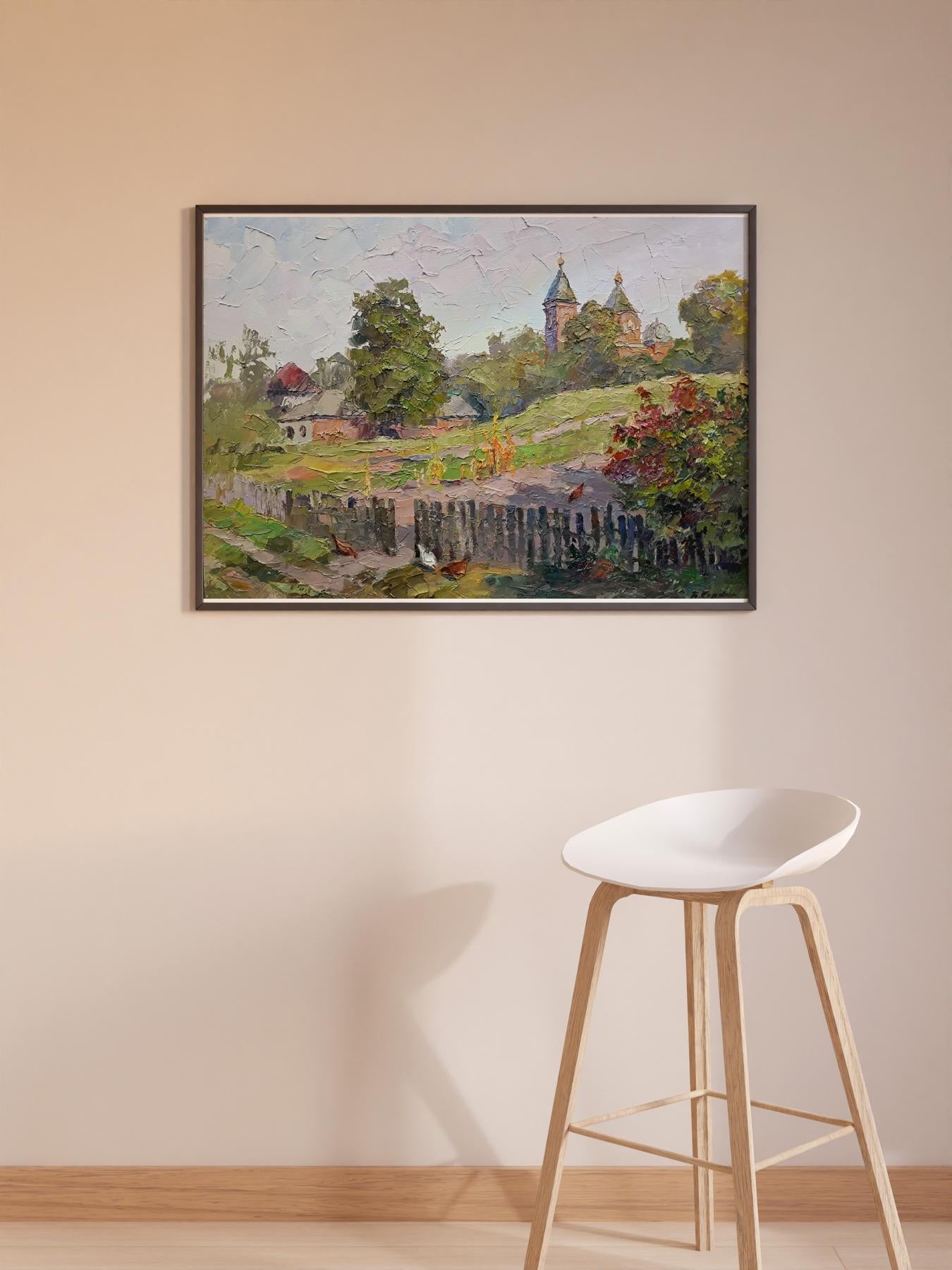 If you're looking for a beautiful oil painting that captures the essence of autumn, look no further than this "Autumn landscape" painting. The village outskirts, church on a hill, and houses on a hillside are all rendered in stunning detail, while the country road and nature create a sense of peace and tranquility. The warm colors will remind you of cozy firesides and falling leaves, making it the perfect addition to your home décor.
