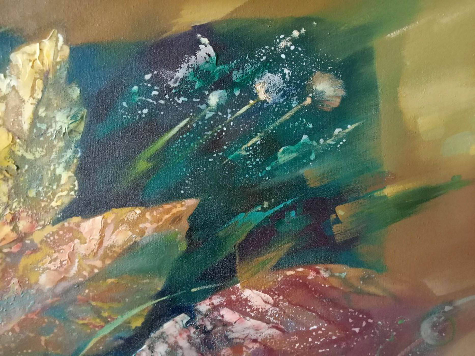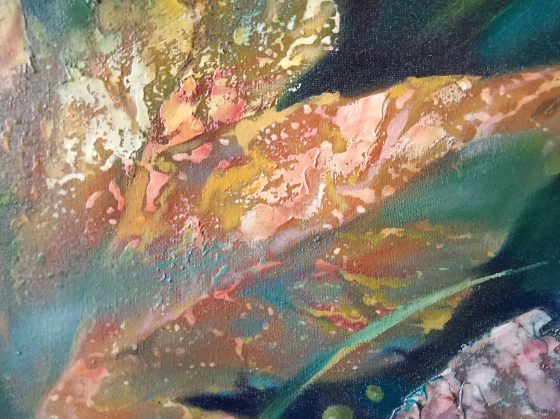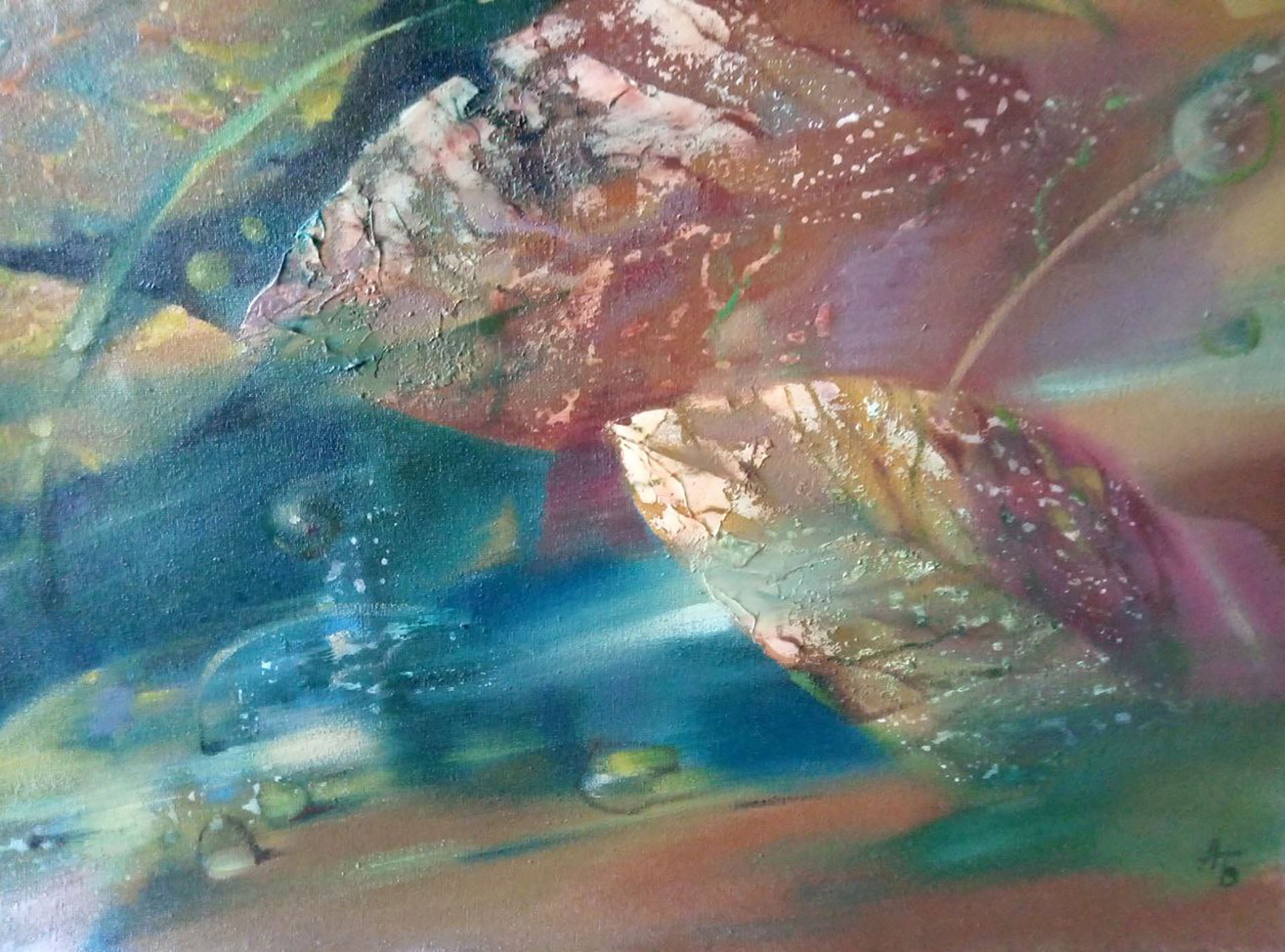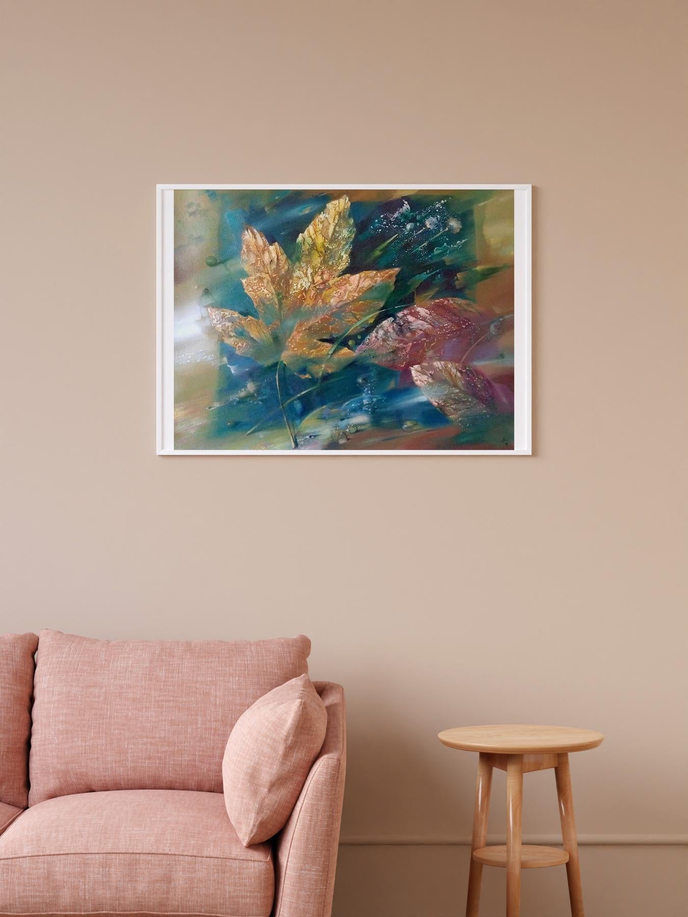 Looking at this painting, you can feel the autumn leaves rustling in the wind. The different colors and shapes of the leaves are so vividly depicted that you can almost feel their texture. It's as if you are looking at them through a microscope. This oil painting is a close-up view of autumn leaves, and it is very abstract. The leaves are of different shapes and colors, and they are all arranged in a random order. But despite the chaos, there is a certain beauty in this painting. It's like looking at a kaleidoscope - each leaf is different, but they all work together to create a harmonious whole. This painting is very interesting and engaging, and it will be a great addition to your home décor.