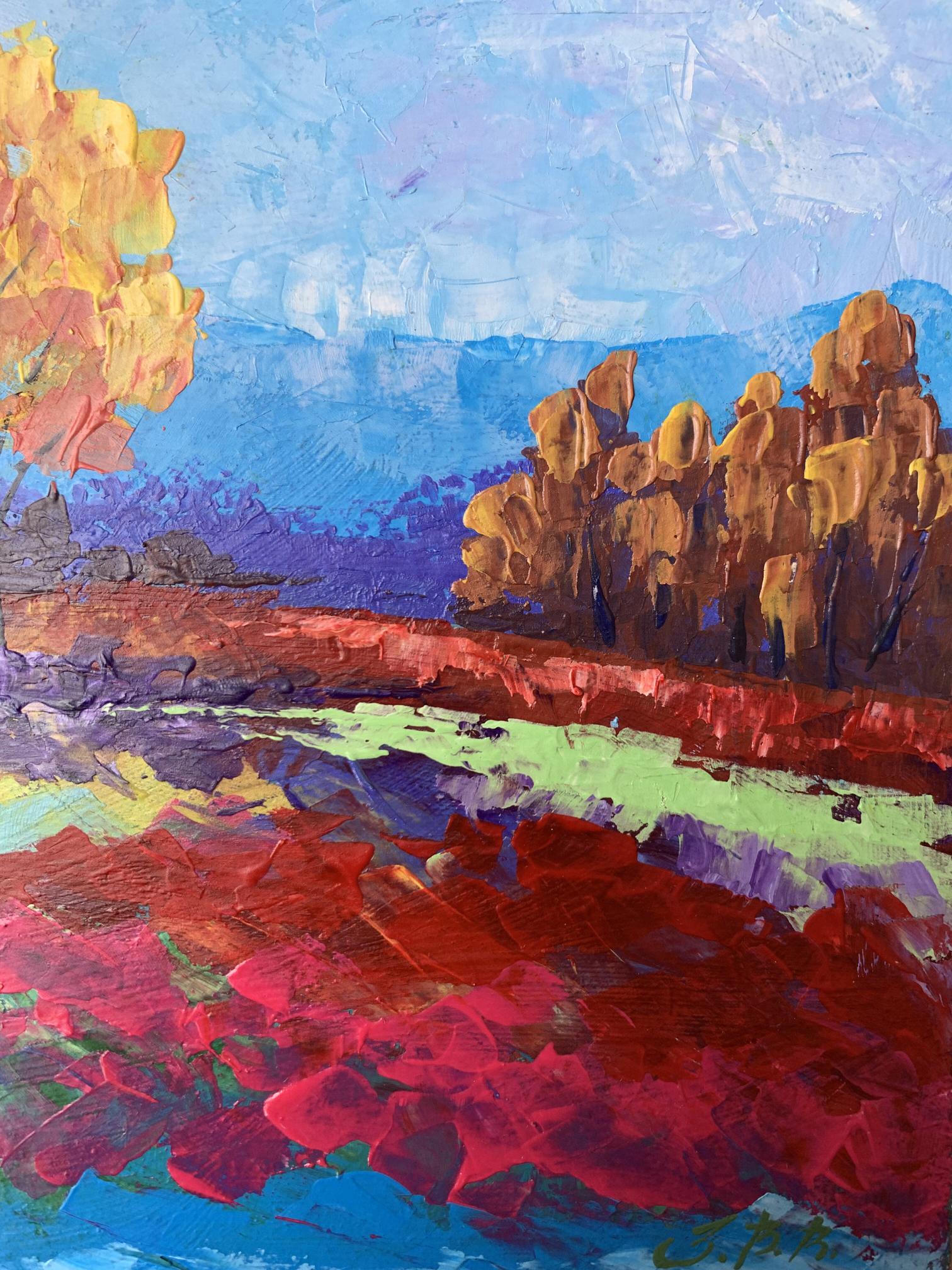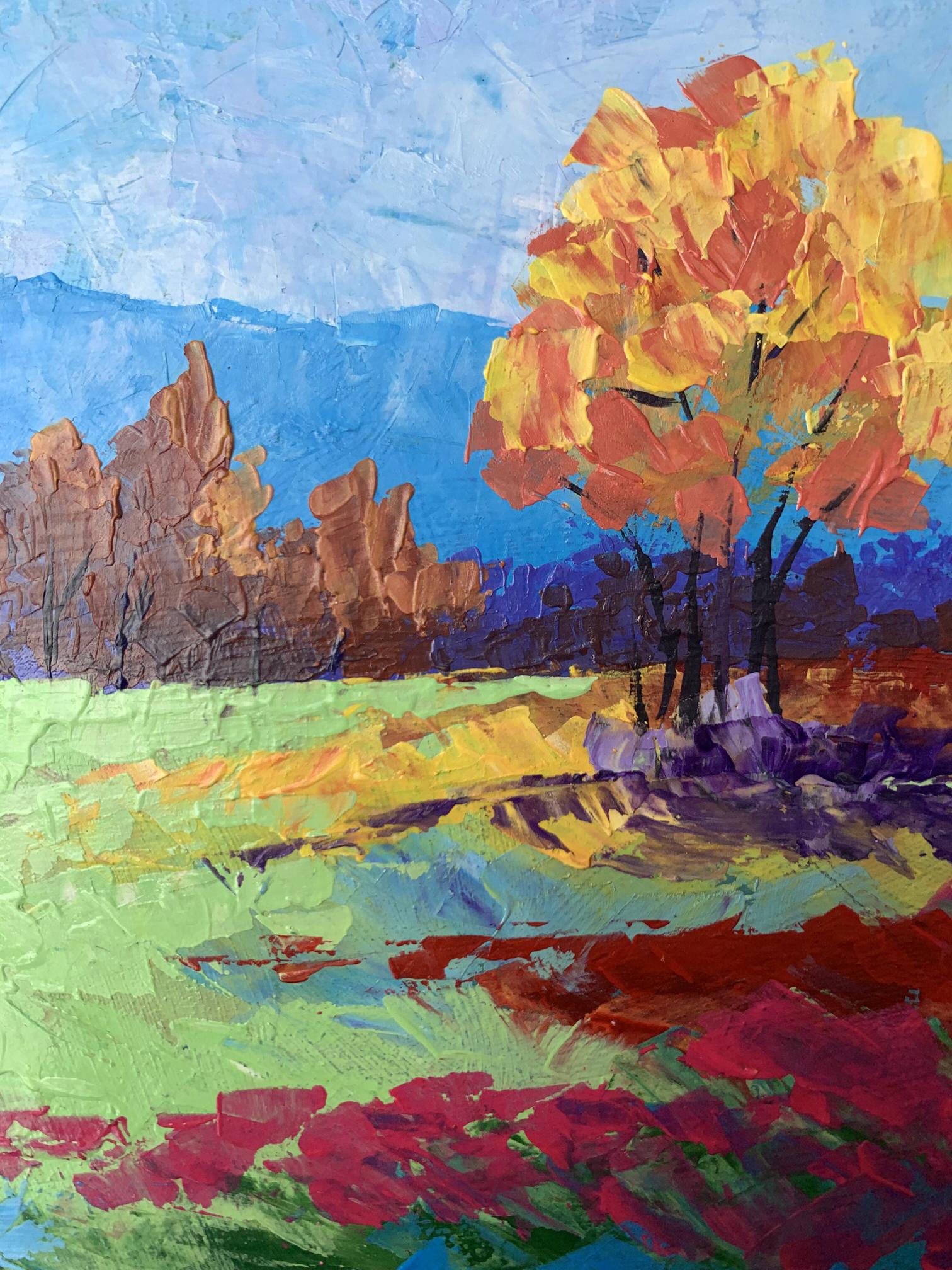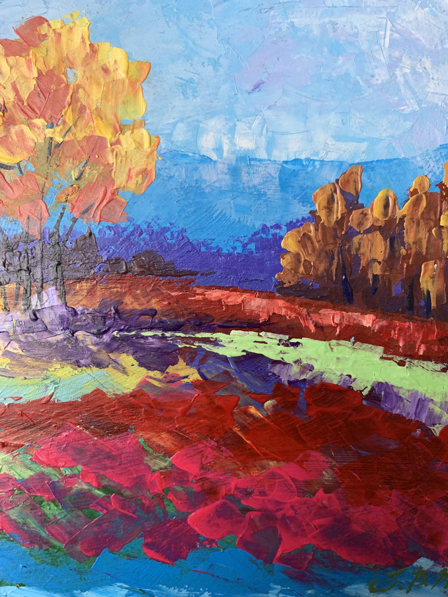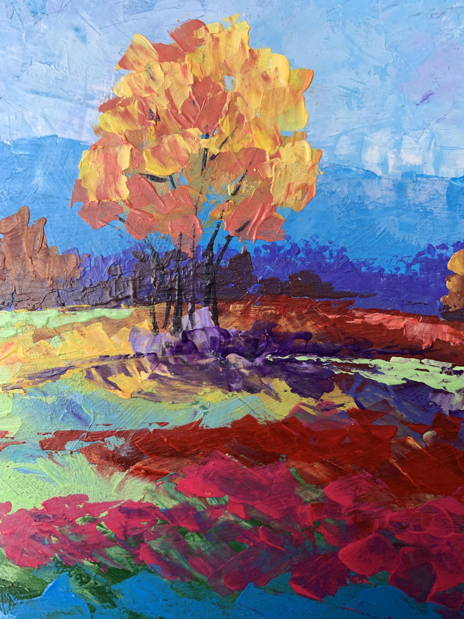 "Autumn Lonely Tree" is a vibrant and textured oil painting that captures the essence of autumn with its bold and rich color palette. The artist employs a thick impasto technique, giving the painting a three-dimensional quality that enhances its visual impact. The painting is characterized by a mix of warm and cool tones. The artist uses a variety of bold colors, including bright yellows, oranges, reds, and contrasting blues and greens. The thick, textured strokes of paint applied with a palette knife create a dynamic and engaging surface, adding depth and intensity to the composition. The composition of the painting is centered around a single, prominent tree in full autumn splendor. This focal point is surrounded by an expansive landscape that showcases the beauty of the season. The focal point is a solitary tree adorned with brilliant autumn foliage. The leaves are painted in shades of yellow, orange, and red, creating a striking contrast against the surrounding landscape. The foreground is a tapestry of colorful vegetation, with patches of green, red, and yellow leaves scattered across the ground. The use of varying shades and textures gives the impression of a lush, vibrant field. The background features a range of trees in earthy brown tones, receding into a serene blue horizon of distant hills or mountains. This contrast highlights the central tree's prominence and adds depth to the scene. The sky is a clear blue, providing a crisp backdrop that accentuates the warm colors of the autumn foliage and the cooler tones of the distant landscape. The central tree symbolizes resilience and beauty, standing alone yet flourishing with vibrant autumn colors. The foreground's varied colors and textures represent the abundance and diversity of nature during the autumn season. The background trees and hills create a sense of depth and perspective, grounding the composition in a tranquil, expansive setting. The mood of "Autumn Lonely Tree" is one of vibrant solitude and peaceful contemplation. The rich, warm colors of the foliage evoke the beauty and warmth of autumn, while the cool blues of the sky and distant hills suggest a serene, reflective atmosphere. The painting can be interpreted as a celebration of the solitary beauty and resilience found in nature. The artist captures the fleeting yet stunning colors of autumn, inviting the viewer to appreciate the solitary tree's striking presence amidst a broader, tranquil landscape. Overall, "Autumn Lonely Tree" is a captivating work that showcases the artist's skill in using color and texture to convey the essence of the autumn season. The painting not only depicts the physical beauty of a solitary tree in autumn but also evokes an emotional response, inviting the viewer to pause and reflect on the serene beauty of nature.