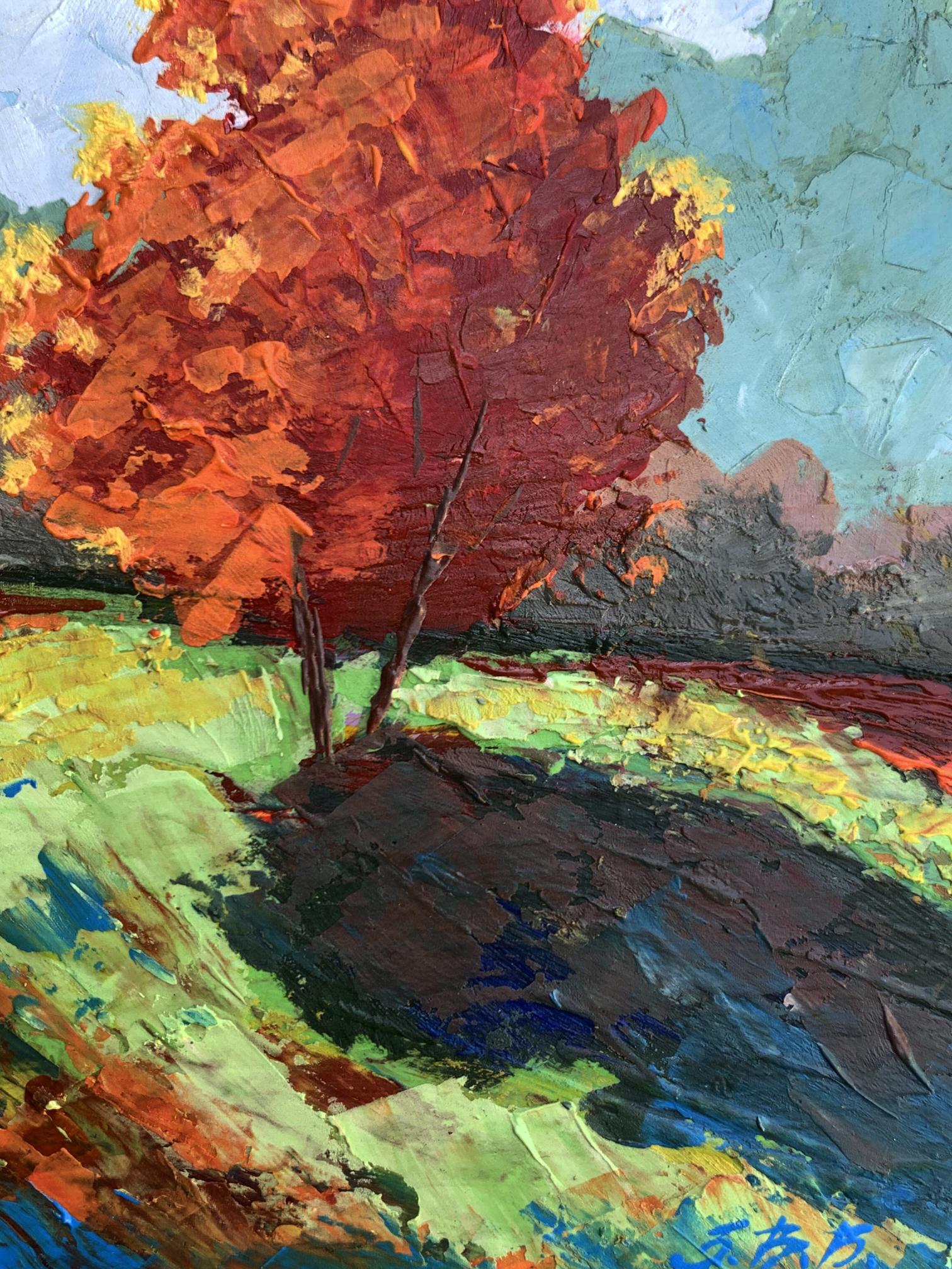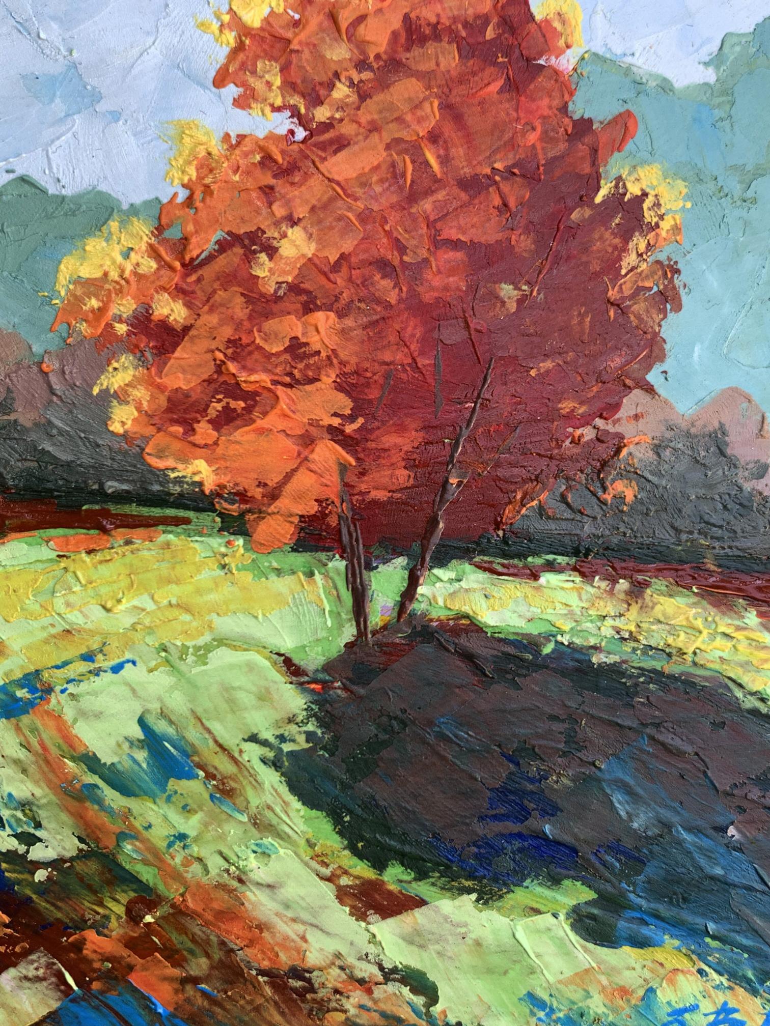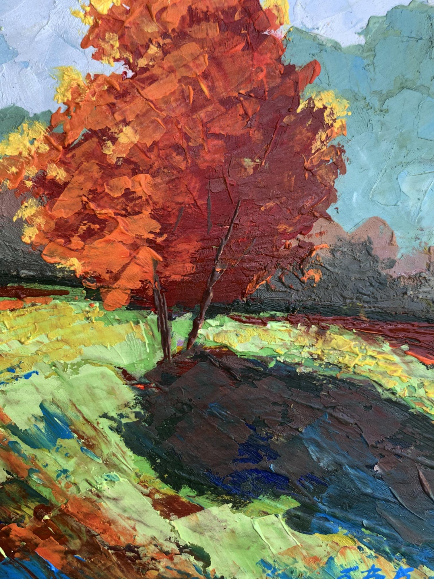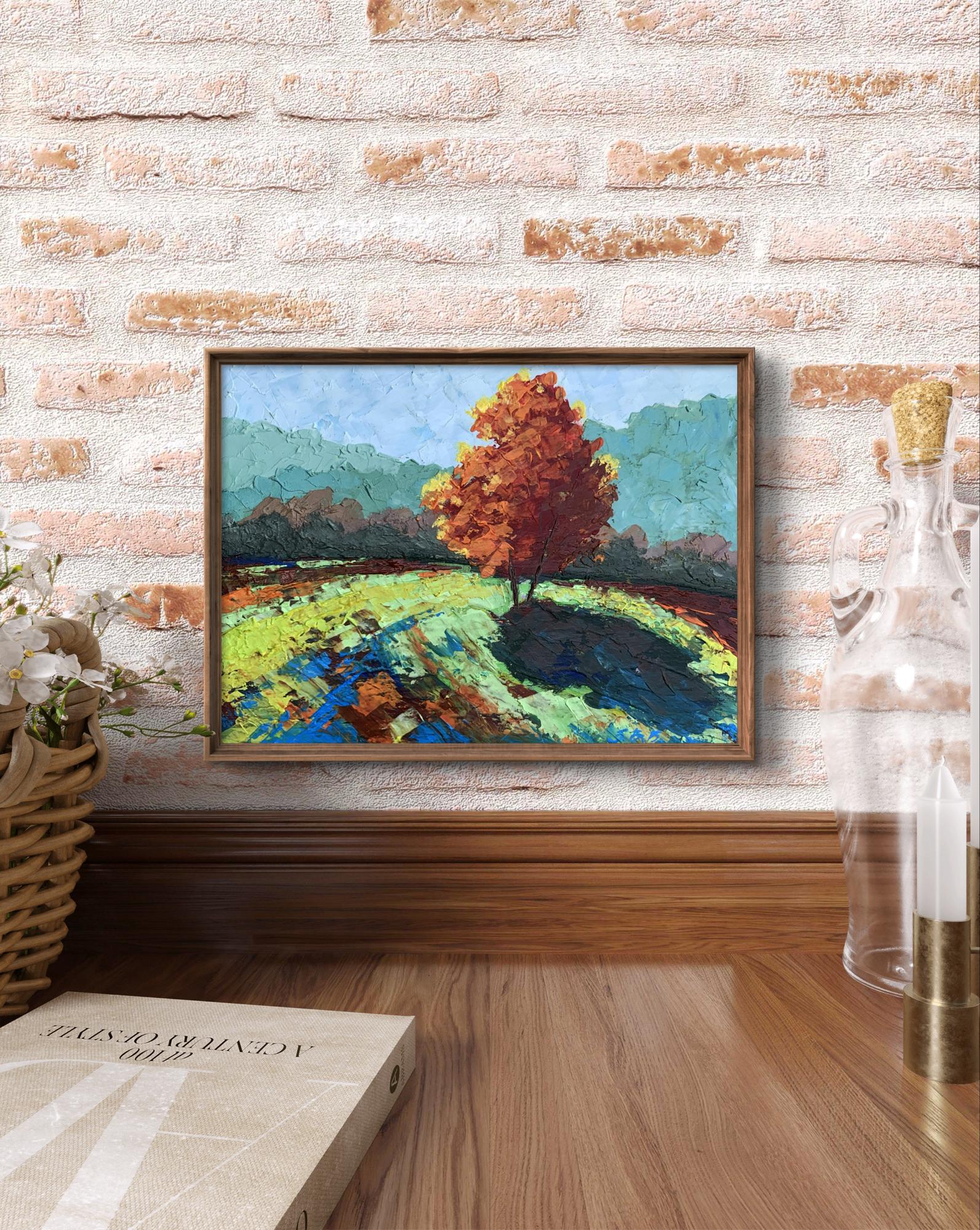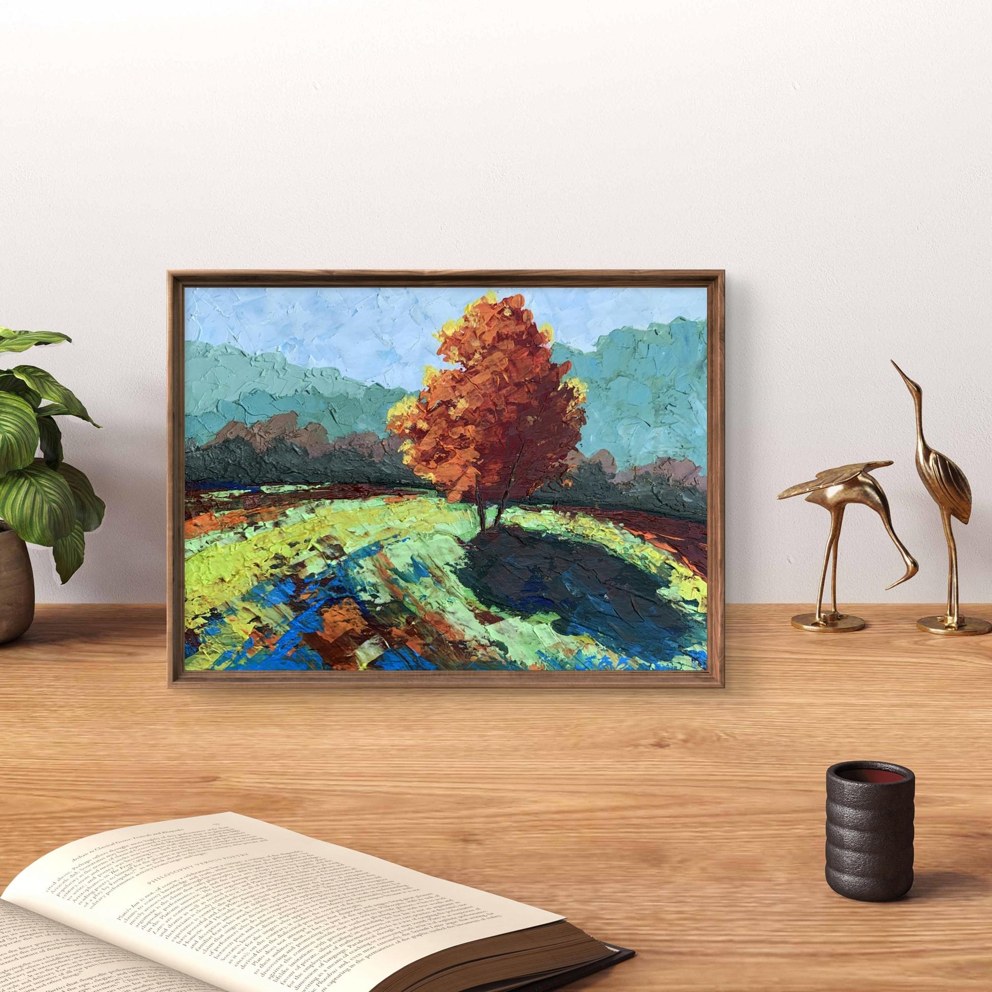 "Autumn Tree" is a captivating oil painting that beautifully encapsulates the essence of fall through its vibrant use of color and texture. The artwork is a celebration of the seasonal transition, capturing a moment of serene beauty in nature. The painting employs a rich and warm color palette, typical of the autumn season. Dominated by a single, striking autumn tree with leaves in shades of red, orange, and yellow. The artist uses thick, textured brushstrokes to create a sense of depth and realism, making the tree appear almost three-dimensional. The backdrop features a range of muted greens and browns, representing distant hills or forest. The softer hues of the background provide a contrast that makes the autumn tree stand out even more prominently. The field in the foreground is a mix of vibrant colors – yellows, greens, blues, and touches of orange. The brushstrokes are bold and dynamic, adding energy and movement to the scene. The composition of "Autumn Tree" is thoughtfully designed to draw the viewer's eye towards the central element of the tree. The tree is placed slightly off-center, creating a balanced yet dynamic composition. The eye is naturally drawn to the vivid colors of the leaves. The shadow of the tree, painted in dark blues and greens, adds depth to the painting, anchoring the tree firmly in the landscape. The field is painted with curved lines and swathes of color that guide the viewer's eye towards the background, creating a sense of depth and perspective. The tree, with its rich autumnal colors, is the focal point of the painting. The thick, textured leaves give it a lifelike quality, as if the leaves are rustling in a gentle breeze. The colorful and textured field in the foreground adds vibrancy and movement to the painting, contrasting with the stability and serenity of the tree. The background hills are painted in muted tones, providing a calm and serene backdrop that enhances the vividness of the tree and foreground. The mood of "Autumn Tree" is one of peaceful reflection and appreciation of nature's beauty. The warm, vibrant colors evoke a sense of comfort and tranquility, while the dynamic brushstrokes add a touch of energy and life to the scene. "Autumn Tree" can be interpreted as a celebration of the changing seasons and the beauty of nature. The solitary tree, standing tall and vibrant amidst the muted background, symbolizes resilience and the natural cycle of life. The painting invites viewers to pause and appreciate the fleeting beauty of autumn. Overall, "Autumn Tree" is a stunning representation of the autumn season. The artist's masterful use of color and texture creates a vivid and immersive scene that captures the viewer's imagination and evokes a sense of peace and wonder at the beauty of nature.