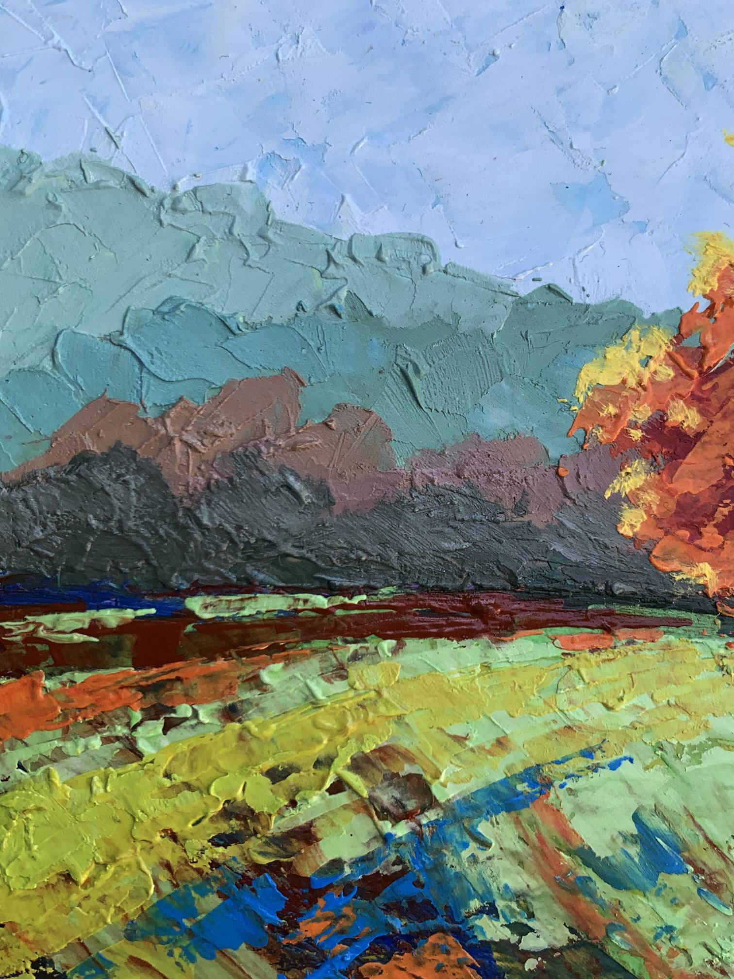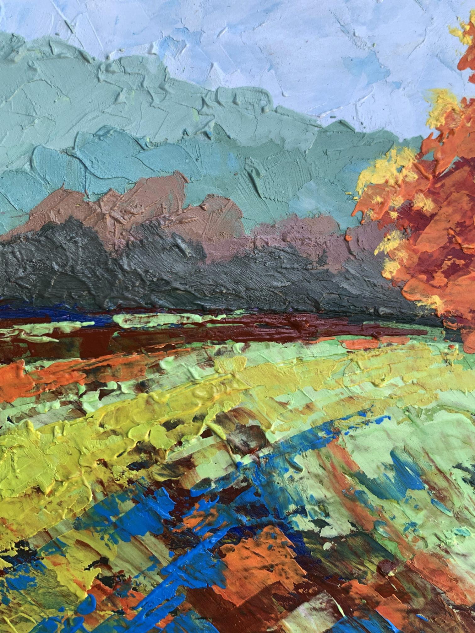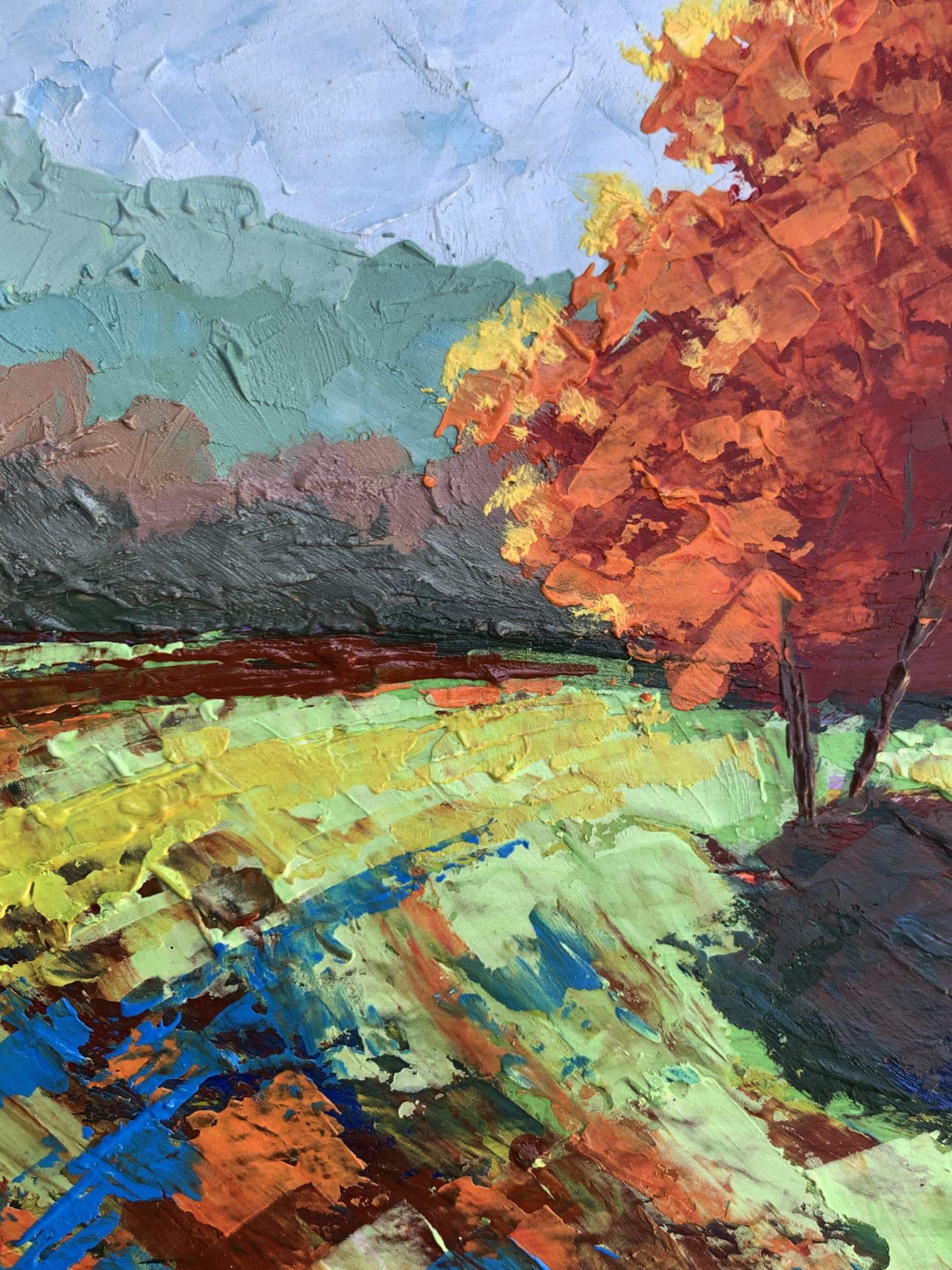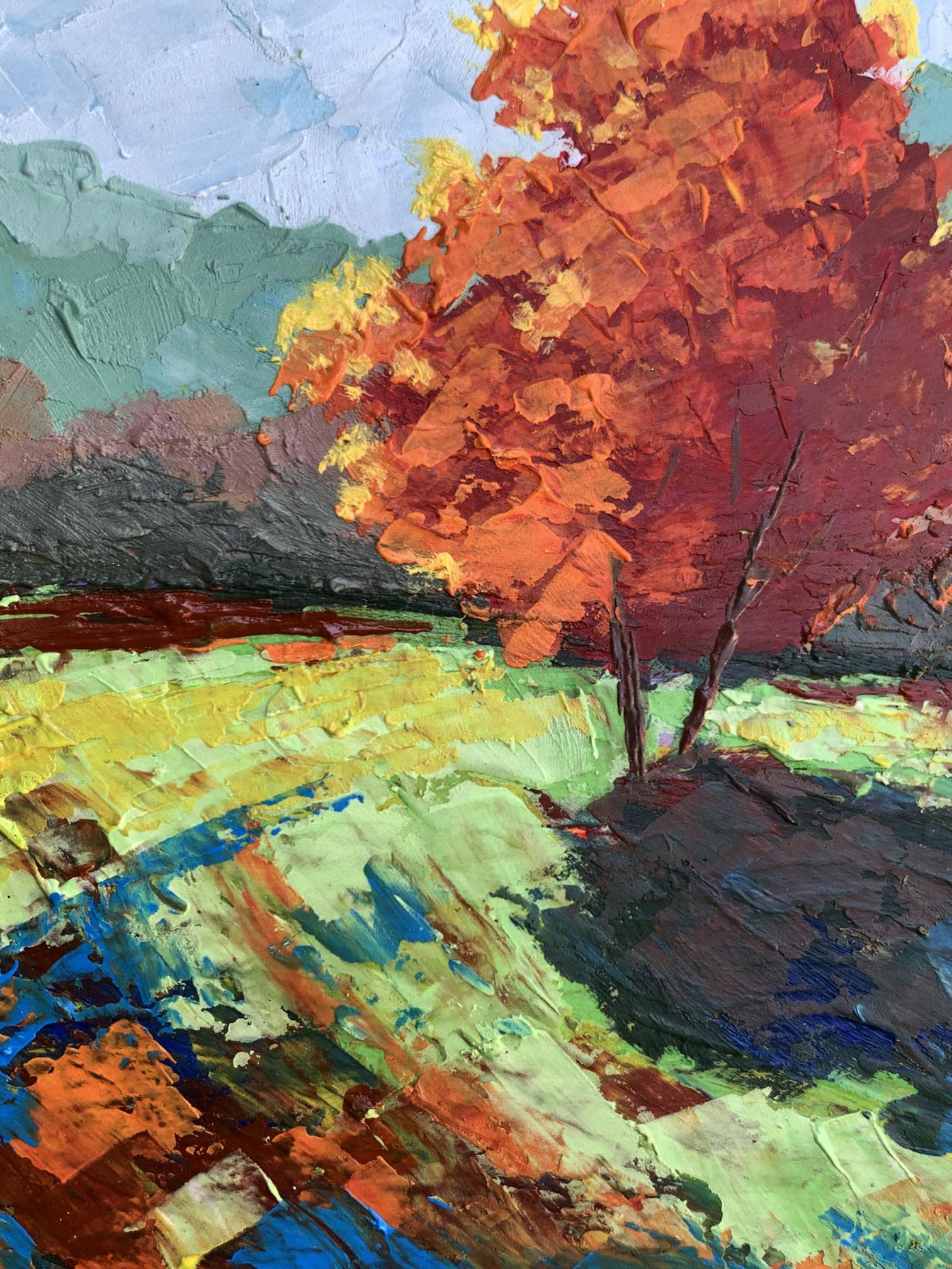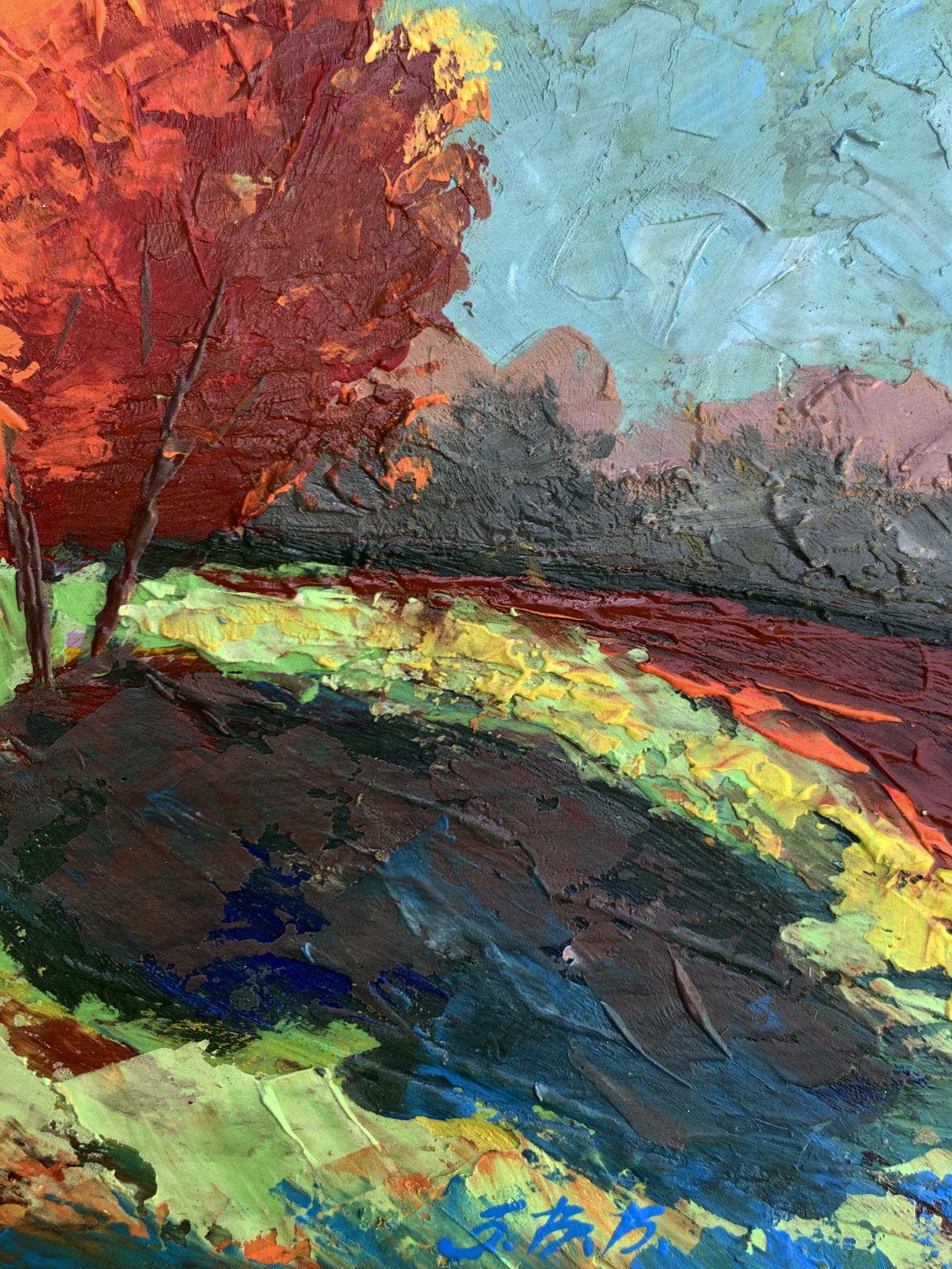 "Autumn Tree" is a captivating oil painting that beautifully encapsulates the essence of fall through its vibrant use of color and texture. The artwork is a celebration of the seasonal transition, capturing a moment of serene beauty in nature. The painting employs a rich and warm color palette, typical of the autumn season. Dominated by a single, striking autumn tree with leaves in shades of red, orange, and yellow. The artist uses thick, textured brushstrokes to create a sense of depth and realism, making the tree appear almost three-dimensional. The backdrop features a range of muted greens and browns, representing distant hills or forest. The softer hues of the background provide a contrast that makes the autumn tree stand out even more prominently. The field in the foreground is a mix of vibrant colors – yellows, greens, blues, and touches of orange. The brushstrokes are bold and dynamic, adding energy and movement to the scene. The composition of "Autumn Tree" is thoughtfully designed to draw the viewer's eye towards the central element of the tree. The tree is placed slightly off-center, creating a balanced yet dynamic composition. The eye is naturally drawn to the vivid colors of the leaves. The shadow of the tree, painted in dark blues and greens, adds depth to the painting, anchoring the tree firmly in the landscape. The field is painted with curved lines and swathes of color that guide the viewer's eye towards the background, creating a sense of depth and perspective. The tree, with its rich autumnal colors, is the focal point of the painting. The thick, textured leaves give it a lifelike quality, as if the leaves are rustling in a gentle breeze. The colorful and textured field in the foreground adds vibrancy and movement to the painting, contrasting with the stability and serenity of the tree. The background hills are painted in muted tones, providing a calm and serene backdrop that enhances the vividness of the tree and foreground. The mood of "Autumn Tree" is one of peaceful reflection and appreciation of nature's beauty. The warm, vibrant colors evoke a sense of comfort and tranquility, while the dynamic brushstrokes add a touch of energy and life to the scene. "Autumn Tree" can be interpreted as a celebration of the changing seasons and the beauty of nature. The solitary tree, standing tall and vibrant amidst the muted background, symbolizes resilience and the natural cycle of life. The painting invites viewers to pause and appreciate the fleeting beauty of autumn. Overall, "Autumn Tree" is a stunning representation of the autumn season. The artist's masterful use of color and texture creates a vivid and immersive scene that captures the viewer's imagination and evokes a sense of peace and wonder at the beauty of nature.