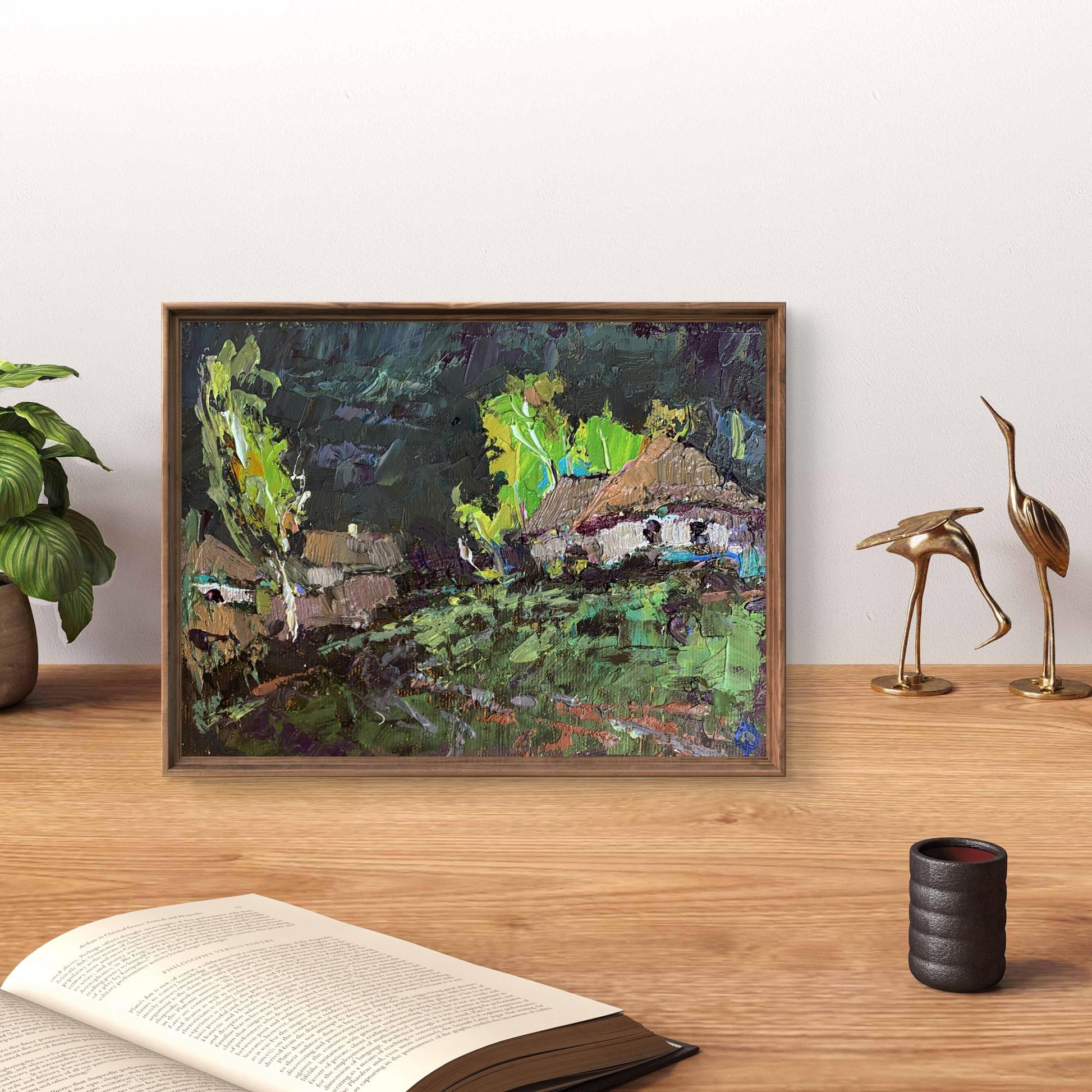 The painting "Before the Storm" is a dramatic oil on canvas piece that captures the tense and anticipatory atmosphere just before a storm, using vivid colors and expressive brushstrokes. The artist employs a dark and moody color palette dominated by deep greens, browns, and blacks, with bright accents of yellow, blue, and purple. The technique is characterized by thick, textured brushstrokes typical of the impasto style, which create a sense of depth and intensity. The layering of paint adds a tactile quality to the scene, emphasizing the roughness of the landscape and the turbulence of the impending storm. The composition centers on a rustic rural scene with houses nestled among dense vegetation. The houses, with their thatched roofs and simple structures, are surrounded by dark, swirling greenery, which seems to be alive with movement as the storm approaches. The houses are painted with earthy tones of brown and beige, with their thatched roofs rendered in thick, expressive strokes. The windows and doors are suggested with dark spots, adding to the rustic and somewhat ominous feel. The surrounding vegetation is depicted with a mix of dark and bright colors, reflecting the turbulent atmosphere. The trees and plants are rendered in various shades of green, with highlights of yellow and blue, capturing the flickering light as the storm gathers. The sky is a swirling mass of dark, stormy colors, primarily deep blues and blacks, adding to the sense of impending doom. The background is a blend of these dark tones, creating a stark contrast with the lighter, more vibrant colors of the vegetation and houses. The overall mood of the painting is one of tension and anticipation. The dark, swirling colors and thick, expressive brushstrokes convey the power and unpredictability of nature. The bright highlights amidst the dark tones suggest brief moments of light before the storm engulfs the scene. "Before the Storm" can be interpreted as a portrayal of nature's raw power and the fragile existence of human settlements in its path. The painting captures the moment of calm before the chaos, highlighting the contrast between the sturdy, enduring houses and the wild, untamed forces of nature. The vibrant colors amidst the darkness suggest resilience and hope, even in the face of impending disaster. This painting masterfully uses color and texture to create a vivid and emotionally charged depiction of a rural scene on the brink of a storm, inviting viewers to feel the tension and beauty of this dramatic moment in nature.