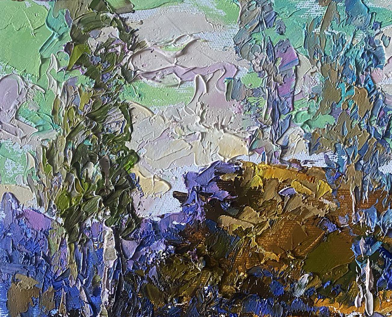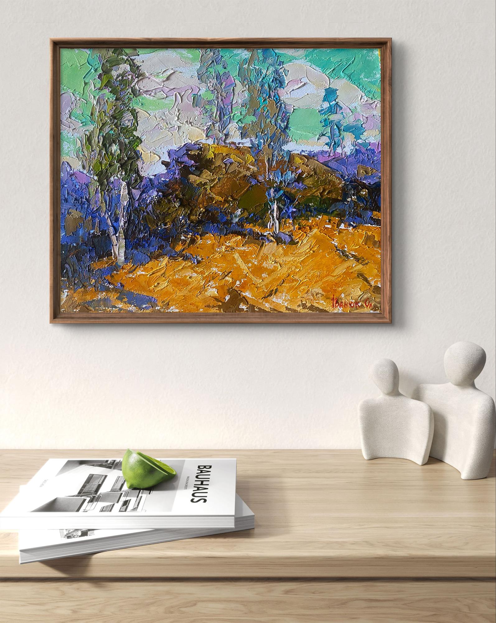 The painting "Between the Trees" captures a serene natural scene, where the viewer is invited to look through the gaps between tall, graceful trees and observe the rolling landscape beyond. The artist's expressive brushstrokes and bold use of earthy tones and vibrant pastels convey both movement and tranquility within the natural environment. The foreground features a golden field, illuminated by warm sunlight, suggesting late summer or early autumn. The rich amber and ochre hues contrast beautifully with the cooler shades of blue, violet, and green in the middle and background. The trees are painted with a mixture of green and silvery tones, their leaves gently swaying in the breeze, creating a sense of life and vitality within the scene. In the background, a rocky hill emerges, covered in lush vegetation and shadowed by the surrounding trees. The soft pastel sky, painted in pale greens, pinks, and blues, suggests a peaceful, slightly overcast day, with diffused light creating a calming atmosphere. The sky's gentle hues blend harmoniously with the landscape, enhancing the painting's overall feeling of balance and unity. The mood of "Between the Trees" is one of quiet contemplation and natural beauty. The viewer is encouraged to pause and appreciate the simplicity of the scene, where nature's colors and textures create a peaceful retreat from daily life. The play of light and shadow adds depth to the composition, suggesting a subtle movement of time and the ever-changing nature of the landscape. "Between the Trees" is a captivating depiction of a rural landscape, inviting viewers to experience the quiet beauty of nature. The thick, textured brushstrokes and rich color palette give the painting a tactile, almost three-dimensional quality, making it feel alive and dynamic. The artwork evokes a sense of solitude and harmony, celebrating the subtle wonders of the natural world that often go unnoticed.
