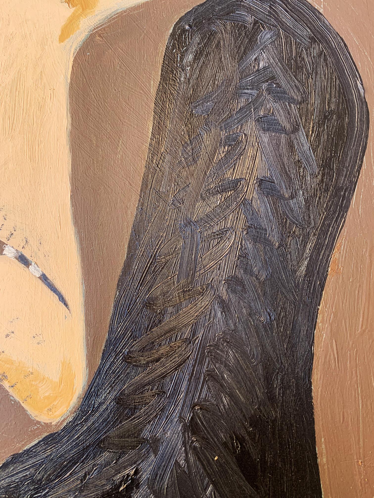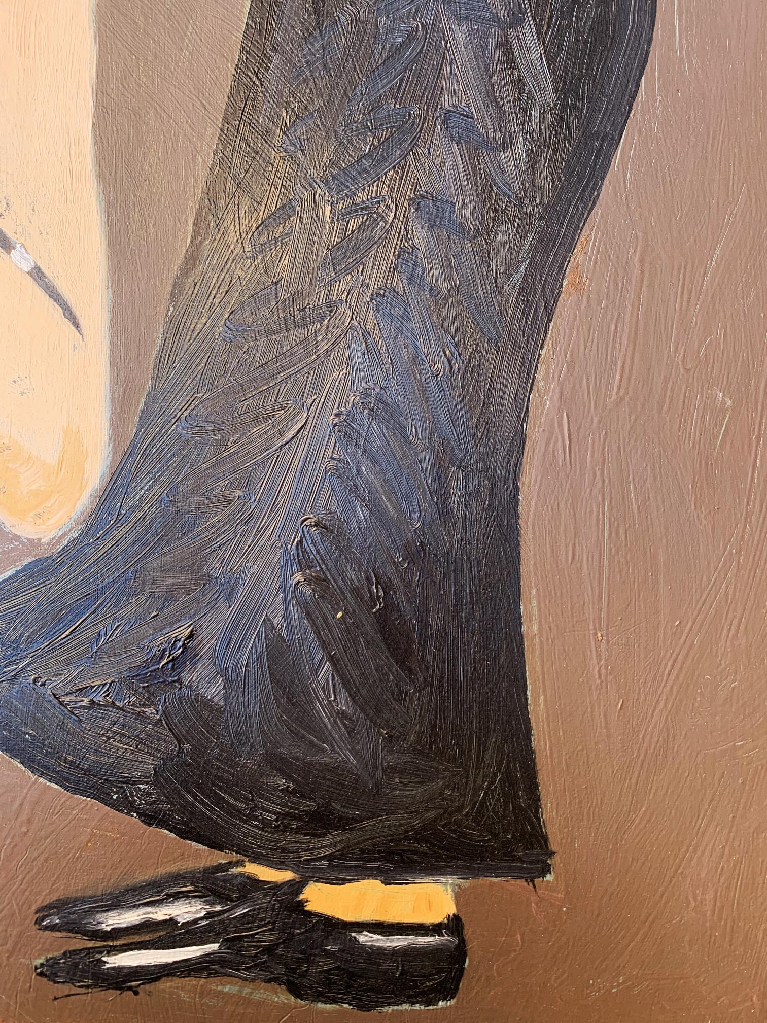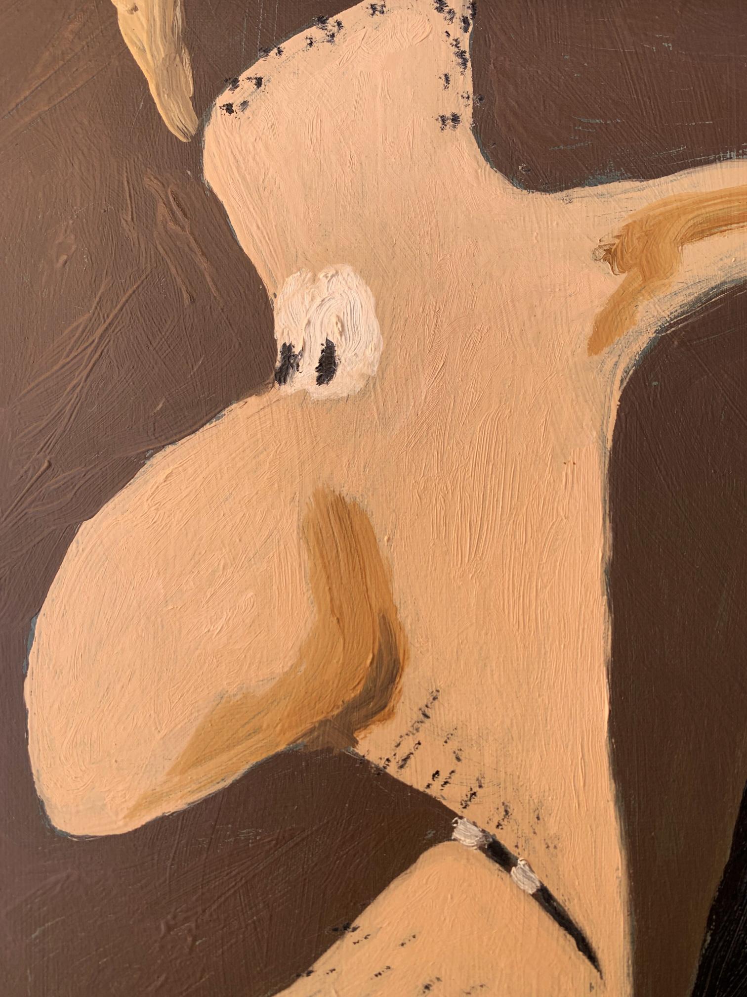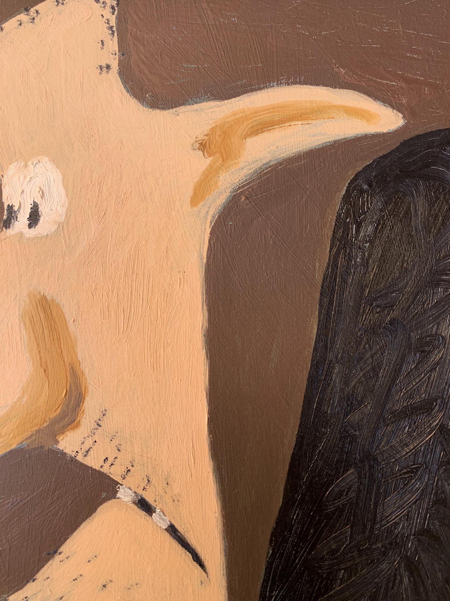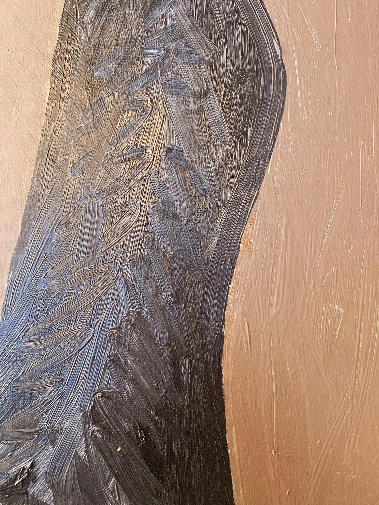 "Black suits you" is an intriguing oil painting that combines elements of abstraction and minimalism to create a thought-provoking image. The artwork features a stylized human figure, portrayed with exaggerated features and simple lines. The figure is dressed in a long black garment that covers much of the body, creating a stark contrast against the muted brown background. The painting's central figure has an elongated nose, large eyes, and a subtle mouth, which are all rendered with minimal brushstrokes yet convey a significant amount of expression. The exaggerated nose and facial features give the figure a caricature-like appearance, adding a touch of humor and whimsy to the piece. The eyes are wide and staring, creating a sense of curiosity or contemplation. The black garment worn by the figure is depicted with rich, textured brushstrokes, adding depth and movement to the otherwise simple composition. The garment's texture contrasts with the smoothness of the background and the figure's skin, highlighting the clothing as a focal point. The choice of black as the garment's color emphasizes the title of the painting, suggesting that the color black complements the figure in some significant way. The background is painted in a flat, monochromatic brown, which serves to bring the figure into sharp focus. The simplicity of the background ensures that viewers' attention remains on the central figure and the details of the garment and facial features. The use of minimal color and detail throughout the painting reinforces the abstract and stylized nature of the work. "Black suits you" can be interpreted in various ways. It may be seen as a commentary on identity and self-expression, with the black garment symbolizing sophistication, elegance, or perhaps a somber mood. The exaggerated features of the figure might suggest a playful take on human appearance and the ways in which we present ourselves to the world. The title implies that black is a fitting color for the figure, possibly hinting at a deeper narrative about the character's personality or state of mind. This oil painting is a unique blend of abstraction and minimalism, using simple yet effective brushstrokes to convey a rich narrative. "Black suits you" stands out for its use of exaggerated features and stark contrasts, creating a memorable and engaging piece of art. The painting invites viewers to ponder the significance of the color black and the identity of the figure, making it a compelling addition to any art collection.