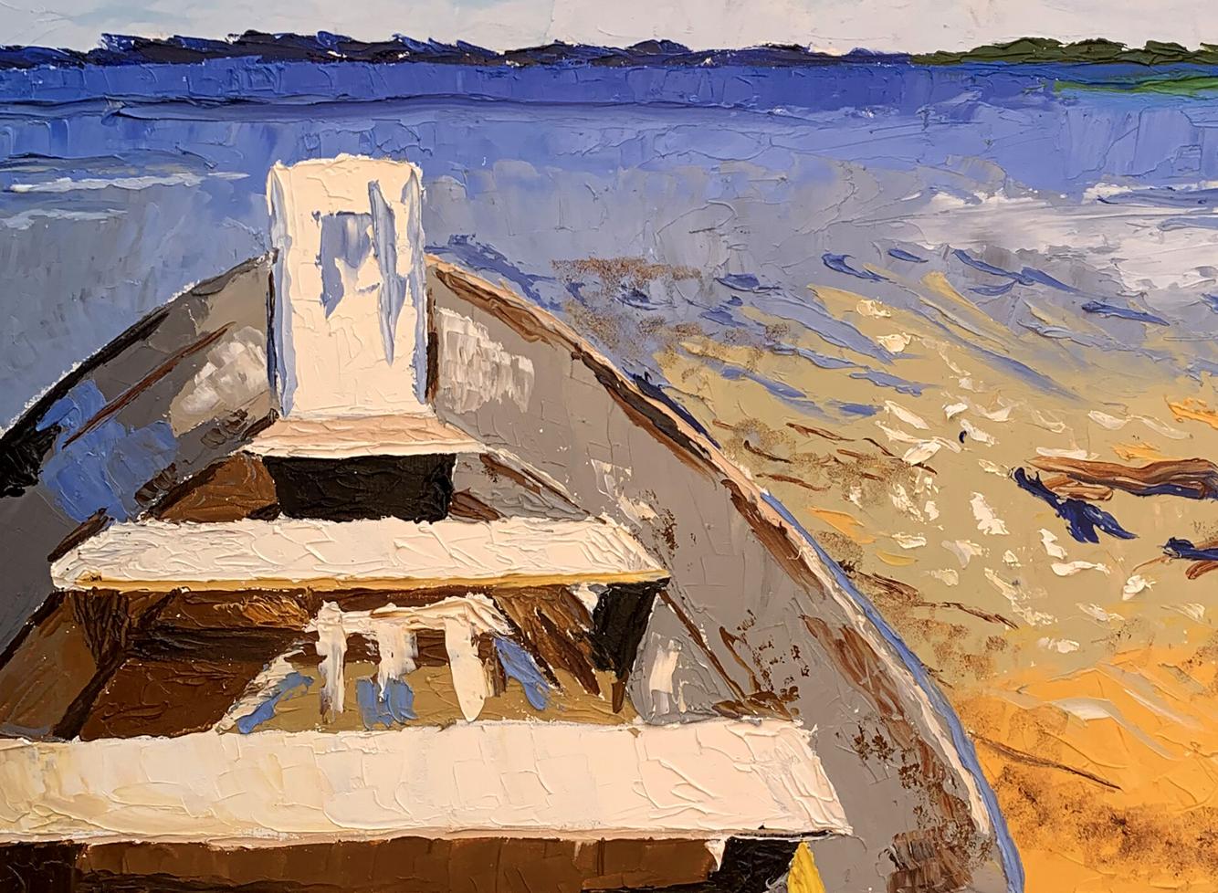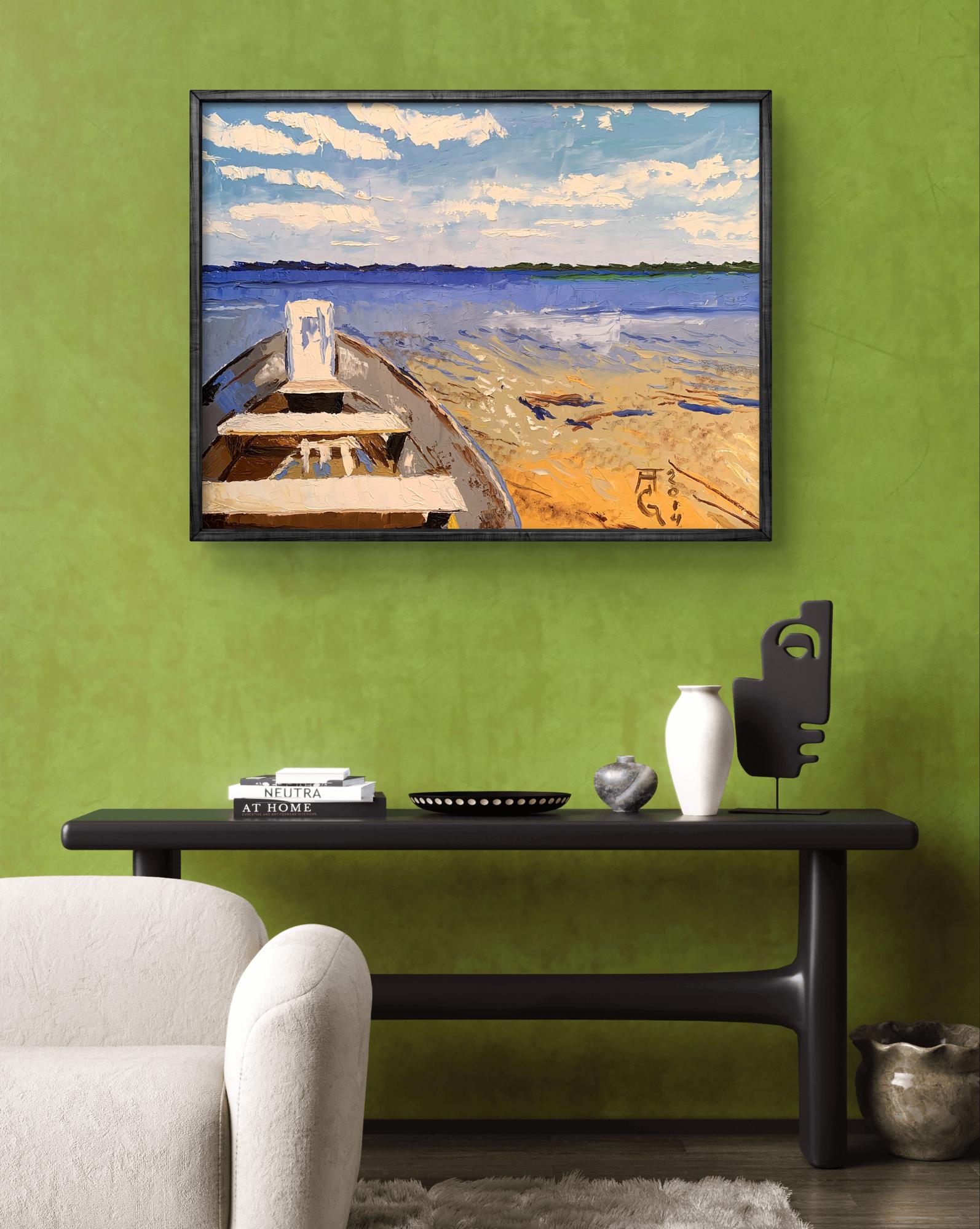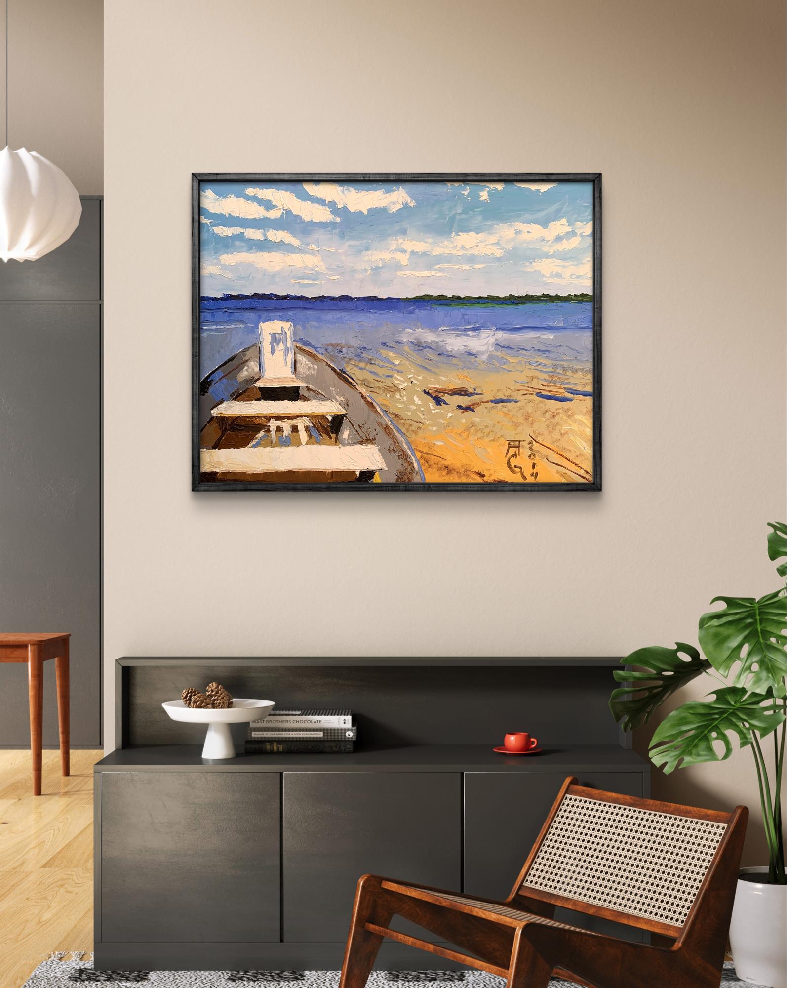 The painting "Boat on the River" is an evocative oil on canvas piece that beautifully captures the tranquility and simplicity of a riverside scene. The artist employs a serene and harmonious color palette, featuring shades of blue, white, and beige. The technique used is impasto, where paint is applied thickly to create texture and depth. This method adds a tactile quality to the painting, making the water, sky, and boat appear almost three-dimensional. The composition centers around a boat resting on the sandy shore of a river, leading the viewer’s eye into the distance where the calm water meets the horizon. The boat is depicted in the foreground, occupying a significant portion of the canvas, with its bow pointing towards the open water. The boat is painted in neutral tones of brown and white, with visible brushstrokes that give it a rustic, well-used appearance. The interior of the boat shows simple wooden seats and a small, upright structure at the bow, possibly for storage or support. The perspective from within the boat invites the viewer to imagine themselves preparing to embark on a serene journey across the water. The water is depicted in various shades of blue, from light to dark, capturing the reflective qualities of the river under the sky. Gentle ripples are suggested with the use of lighter and darker blues, indicating a calm, steady flow. The sky above is a bright, clear blue, dotted with fluffy white clouds. The clouds are rendered with thick, textured strokes, adding to the overall sense of depth and realism. The sandy shore in the foreground is painted in warm tones of beige and light brown, with accents of blue and white suggesting small waves lapping at the sand. The texture of the sand is achieved through varied brushstrokes, giving it a granular appearance that contrasts with the smoothness of the water. The overall mood of the painting is peaceful and reflective, evoking a sense of calm and relaxation. The simplicity of the scene, combined with the rich textures and harmonious colors, creates an atmosphere of quiet contemplation and connection with nature. "Boat on the River" can be interpreted as a moment of pause and tranquility in a busy world. The empty boat on the shore suggests potential and readiness for adventure, while also embodying a sense of stillness and waiting. The calm water and expansive sky highlight the beauty of nature and the serenity it offers. This painting beautifully captures the essence of a quiet riverside scene, inviting viewers to immerse themselves in its tranquility and reflect on the simple pleasures of life.