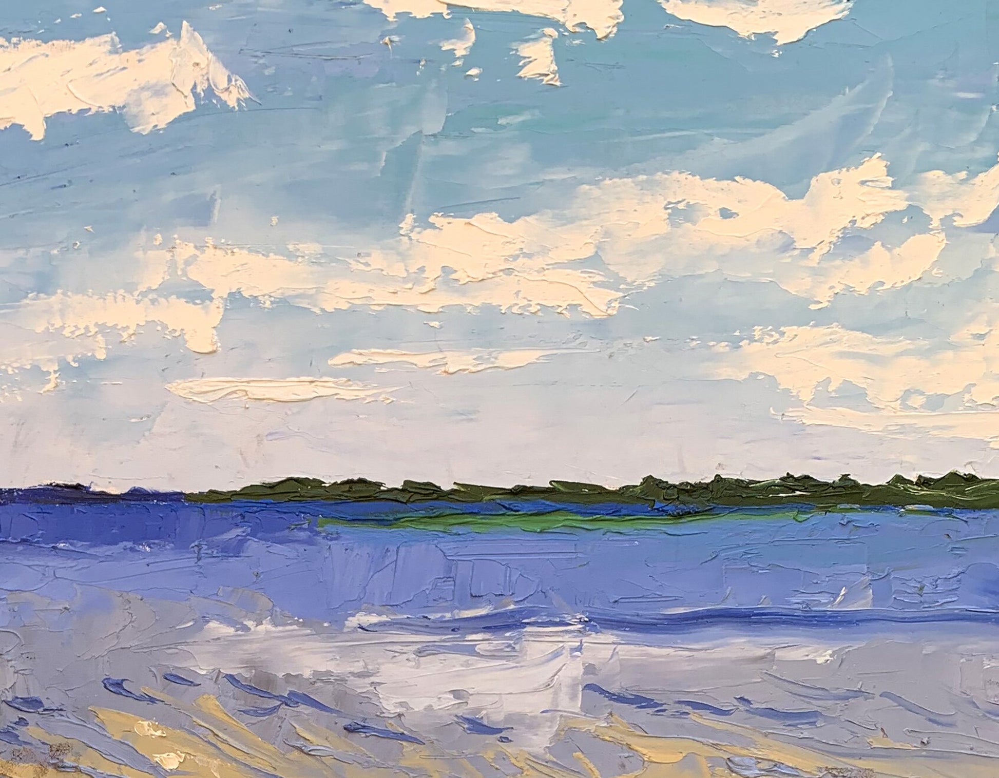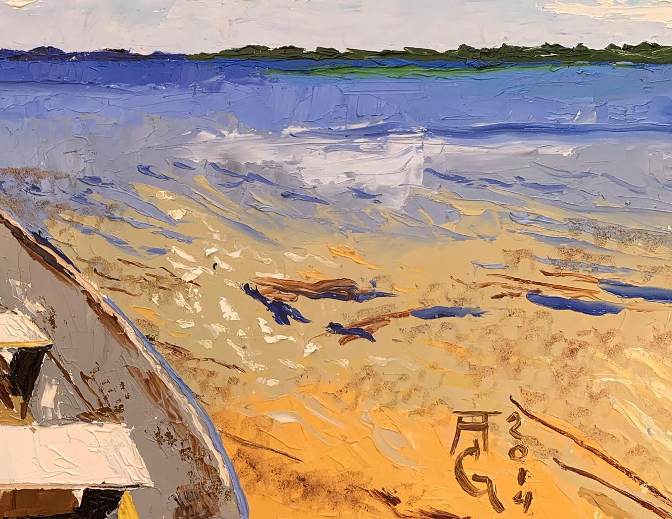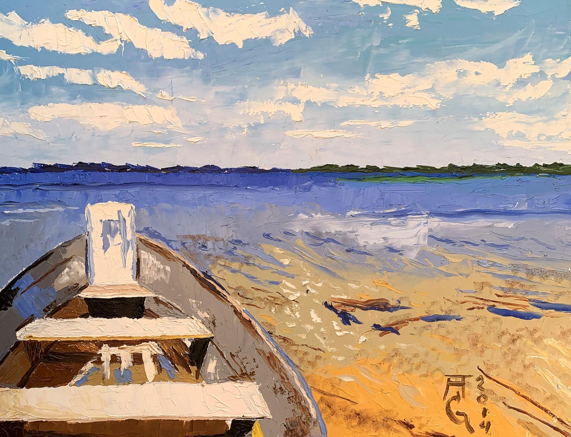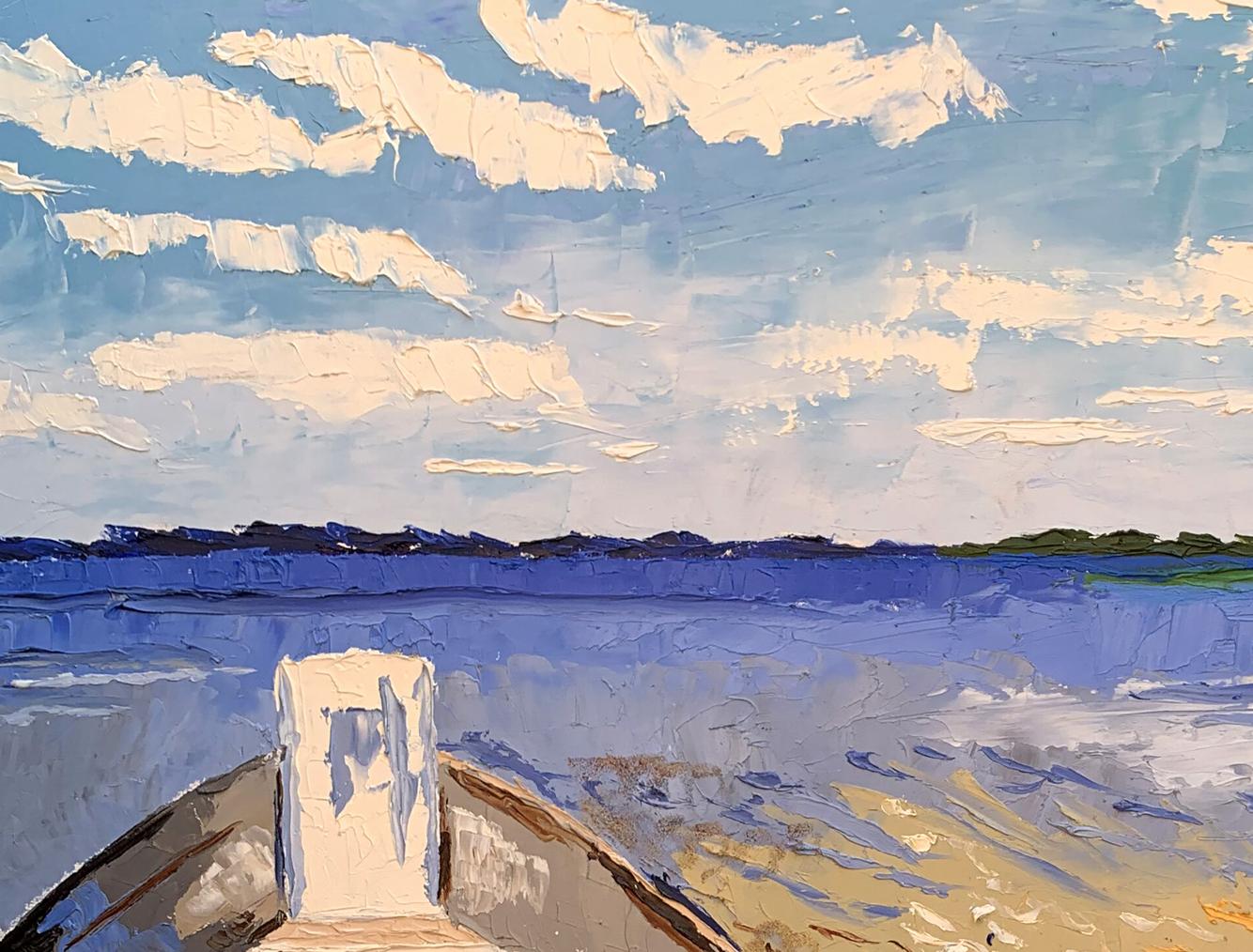 The painting "Boat on the River" is an evocative oil on canvas piece that beautifully captures the tranquility and simplicity of a riverside scene. The artist employs a serene and harmonious color palette, featuring shades of blue, white, and beige. The technique used is impasto, where paint is applied thickly to create texture and depth. This method adds a tactile quality to the painting, making the water, sky, and boat appear almost three-dimensional. The composition centers around a boat resting on the sandy shore of a river, leading the viewer’s eye into the distance where the calm water meets the horizon. The boat is depicted in the foreground, occupying a significant portion of the canvas, with its bow pointing towards the open water. The boat is painted in neutral tones of brown and white, with visible brushstrokes that give it a rustic, well-used appearance. The interior of the boat shows simple wooden seats and a small, upright structure at the bow, possibly for storage or support. The perspective from within the boat invites the viewer to imagine themselves preparing to embark on a serene journey across the water. The water is depicted in various shades of blue, from light to dark, capturing the reflective qualities of the river under the sky. Gentle ripples are suggested with the use of lighter and darker blues, indicating a calm, steady flow. The sky above is a bright, clear blue, dotted with fluffy white clouds. The clouds are rendered with thick, textured strokes, adding to the overall sense of depth and realism. The sandy shore in the foreground is painted in warm tones of beige and light brown, with accents of blue and white suggesting small waves lapping at the sand. The texture of the sand is achieved through varied brushstrokes, giving it a granular appearance that contrasts with the smoothness of the water. The overall mood of the painting is peaceful and reflective, evoking a sense of calm and relaxation. The simplicity of the scene, combined with the rich textures and harmonious colors, creates an atmosphere of quiet contemplation and connection with nature. "Boat on the River" can be interpreted as a moment of pause and tranquility in a busy world. The empty boat on the shore suggests potential and readiness for adventure, while also embodying a sense of stillness and waiting. The calm water and expansive sky highlight the beauty of nature and the serenity it offers. This painting beautifully captures the essence of a quiet riverside scene, inviting viewers to immerse themselves in its tranquility and reflect on the simple pleasures of life.