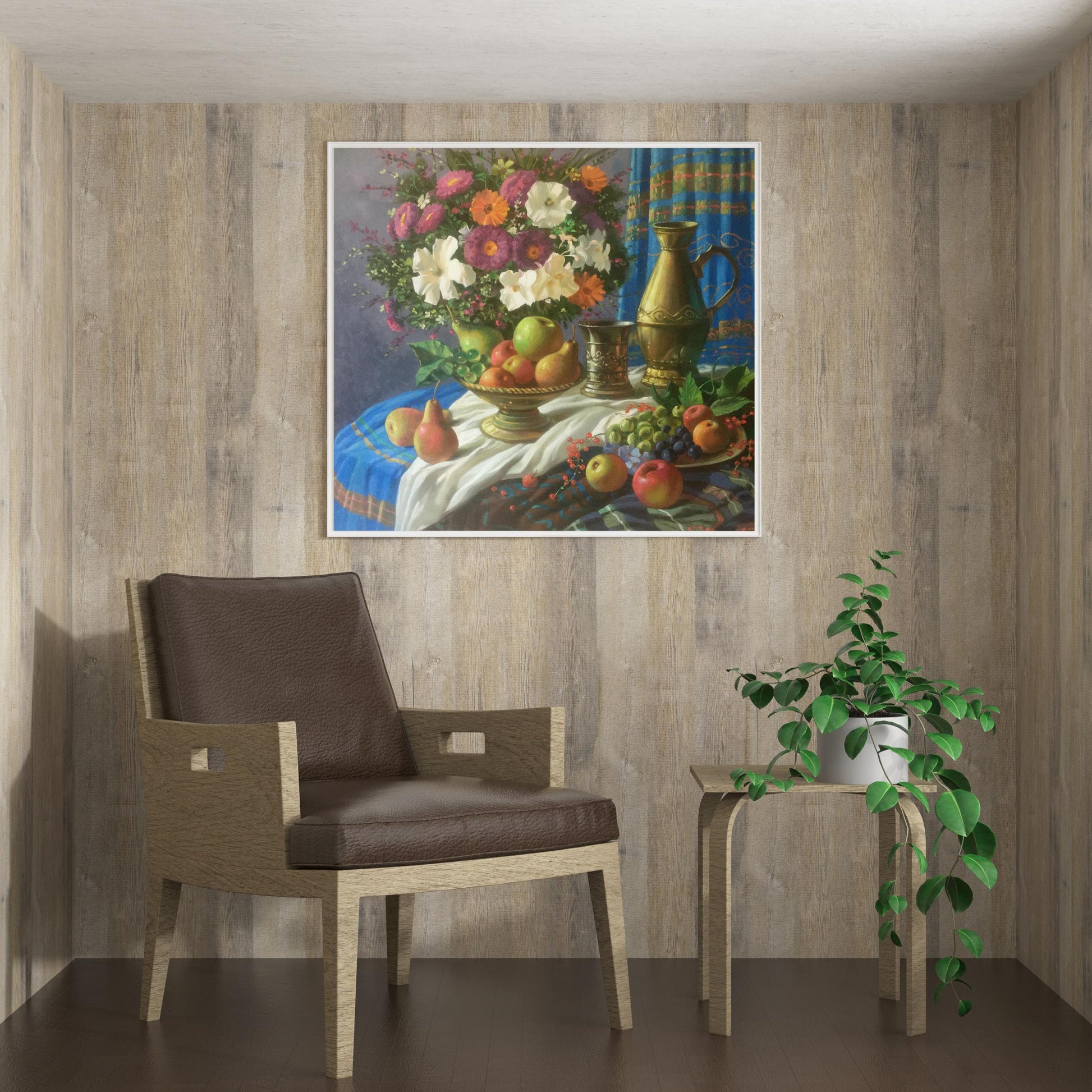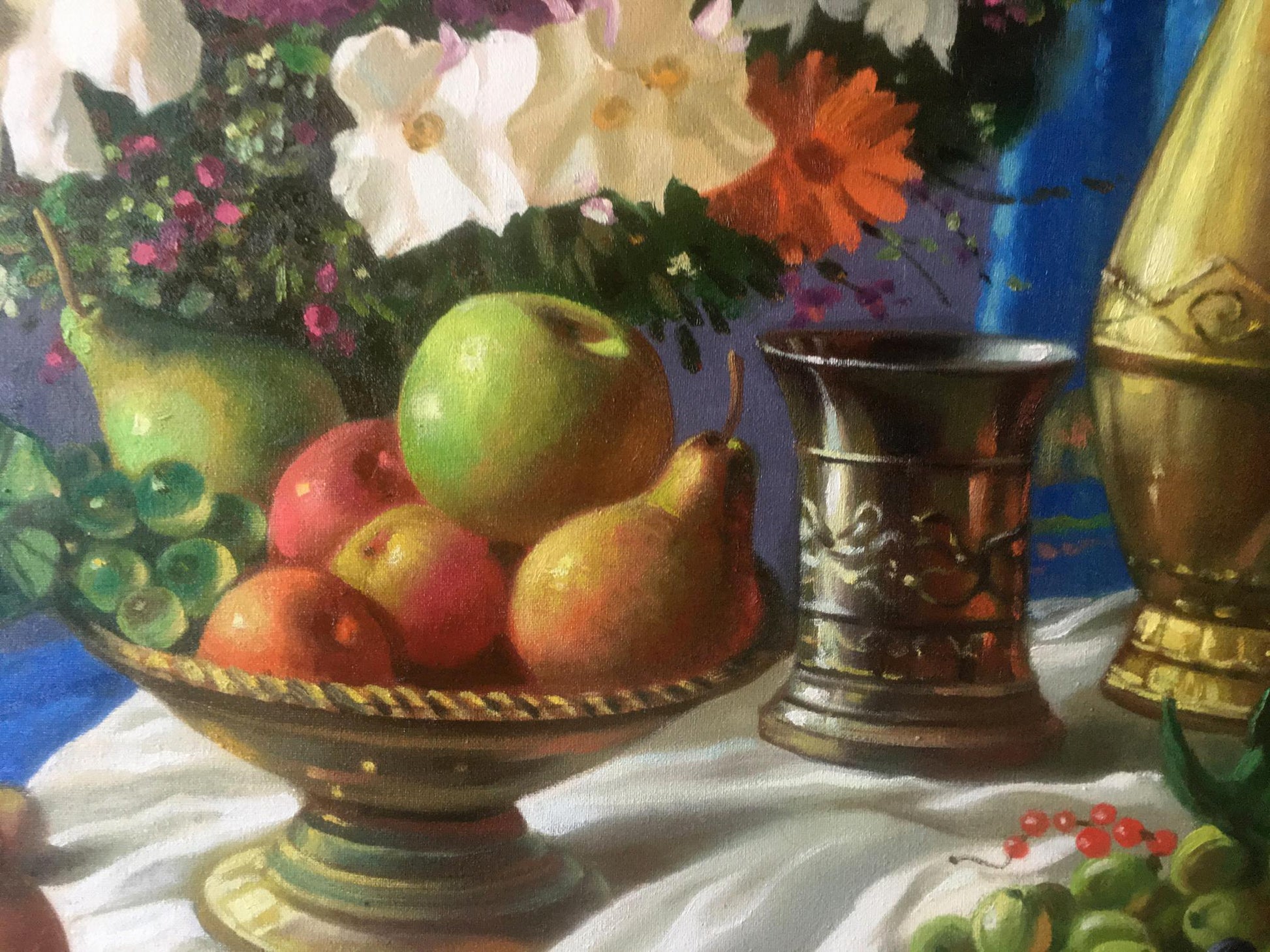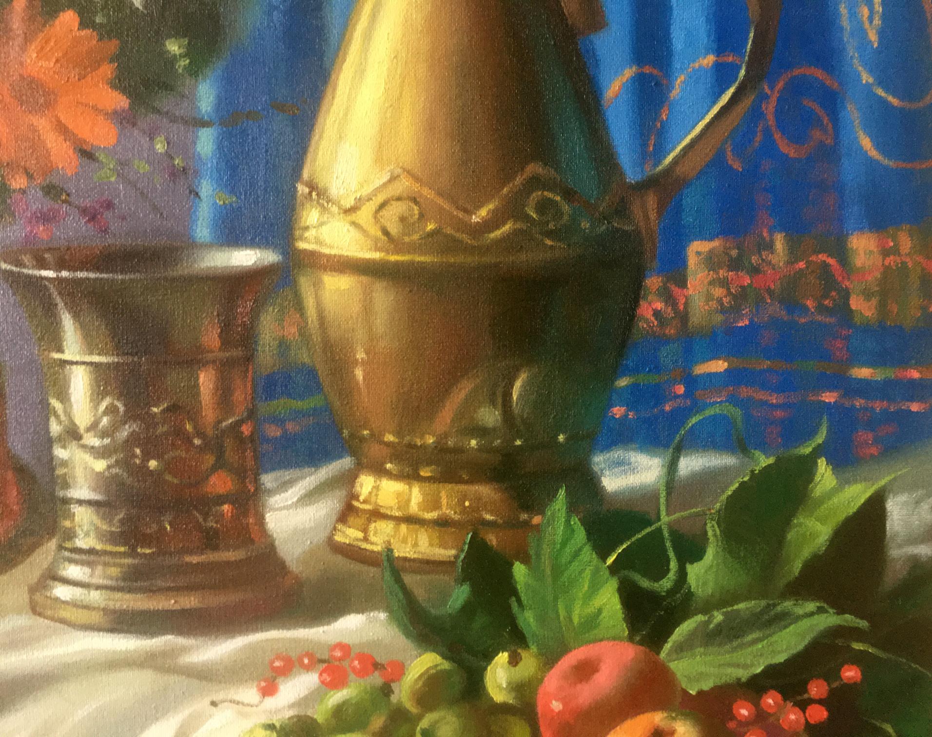 "Bouquet of flowers and grapes" is a beautiful oil painting that features a bouquet of flowers, fruits, and copper utensils. The vibrant colors and intricate details of the painting are sure to catch anyone's eye, and the painting would make a great addition to any home. The artist has perfectly captured the beauty of still life objects, and the painting is sure to bring a touch of elegance to any room.