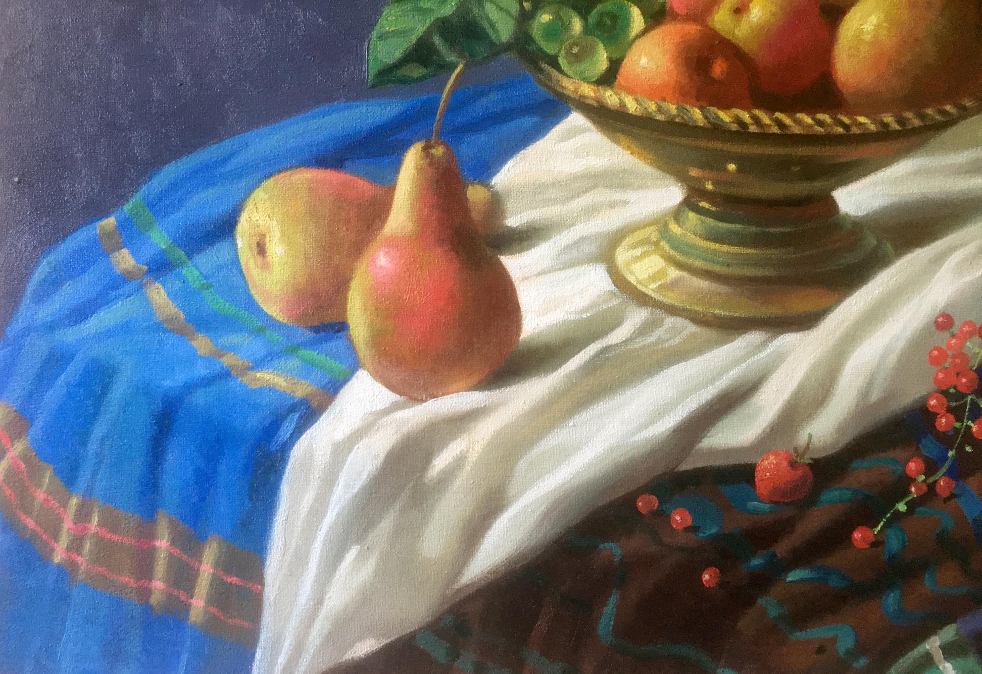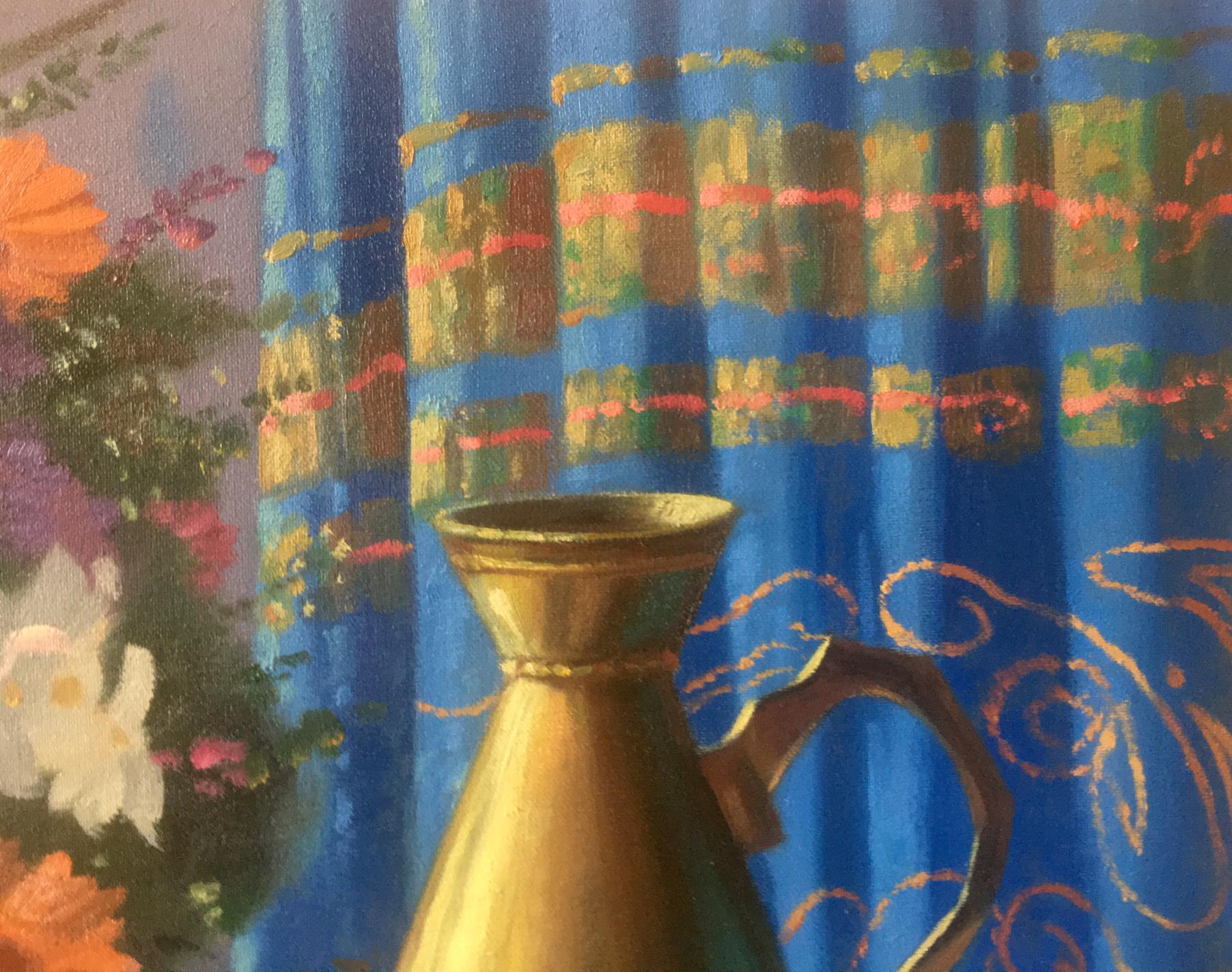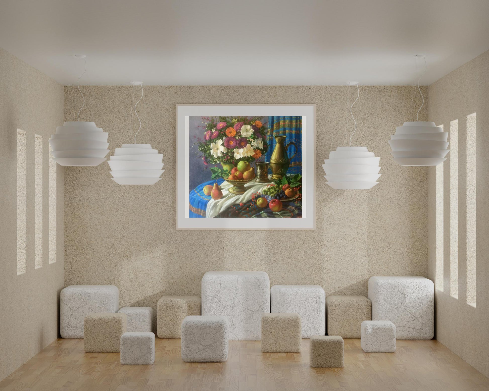 "Bouquet of flowers and grapes" is a beautiful oil painting that features a bouquet of flowers, fruits, and copper utensils. The vibrant colors and intricate details of the painting are sure to catch anyone's eye, and the painting would make a great addition to any home. The artist has perfectly captured the beauty of still life objects, and the painting is sure to bring a touch of elegance to any room.