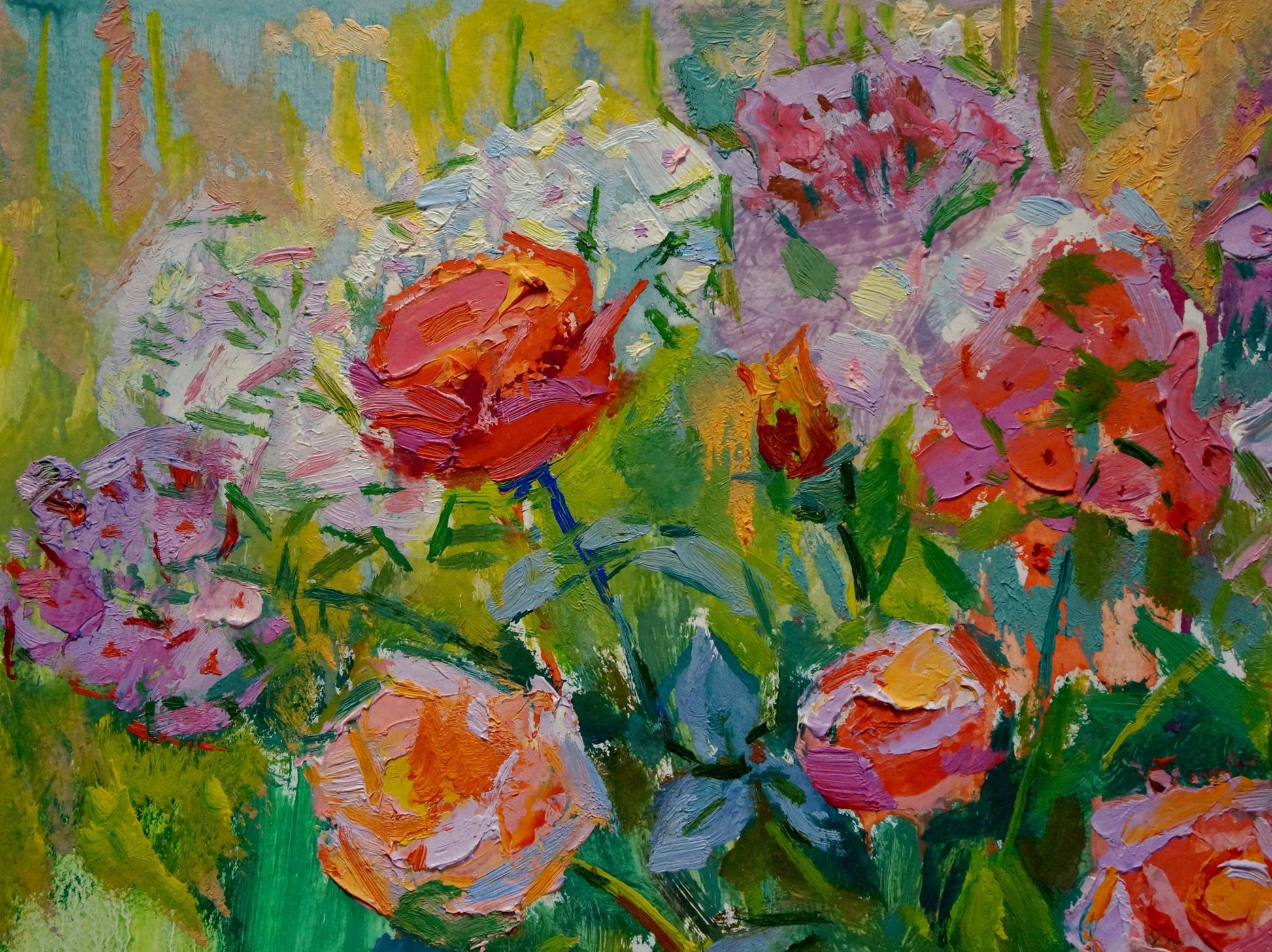 Oil painting Bouquet of red roses and lilacs Vasily Chegodar