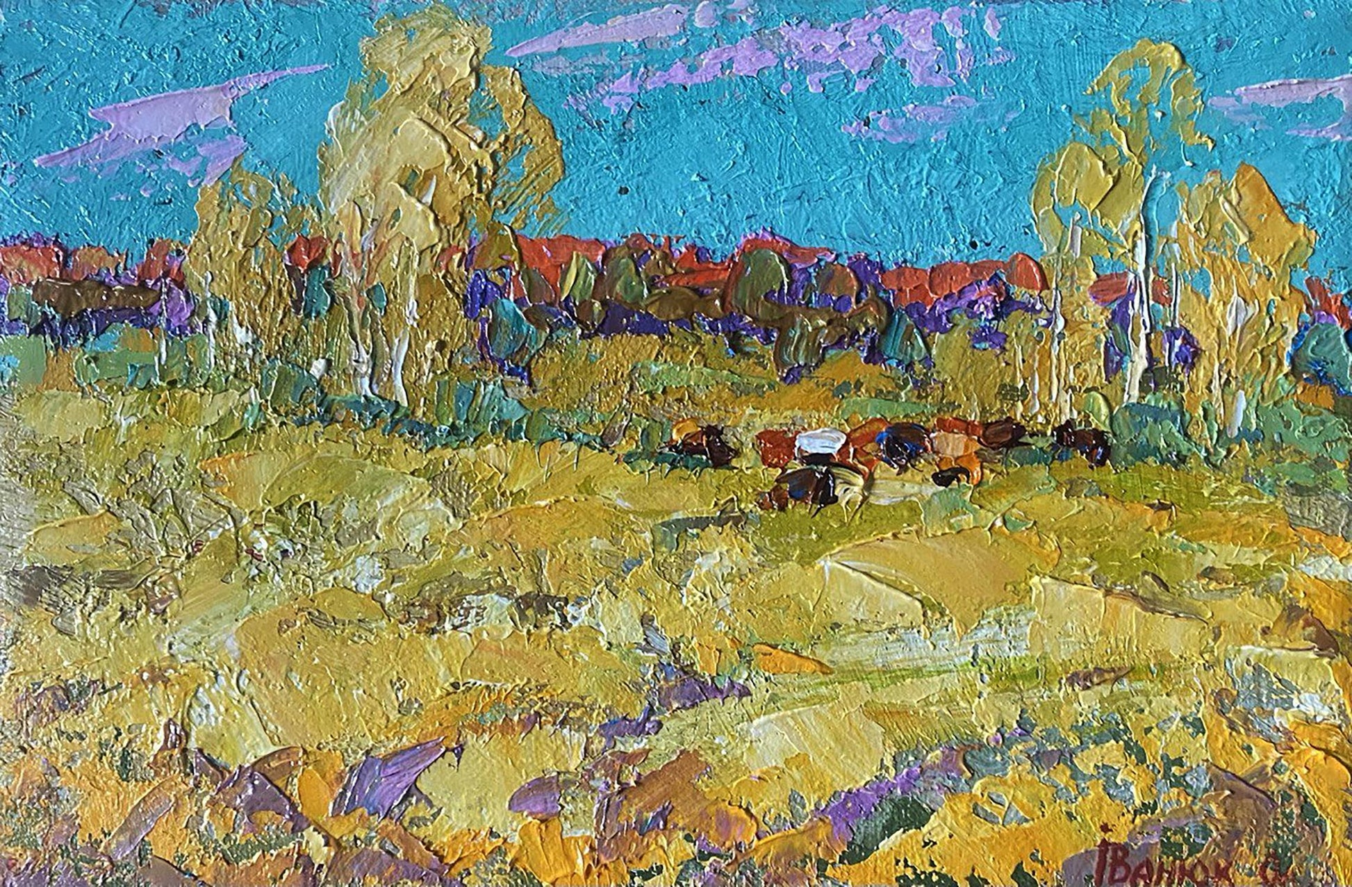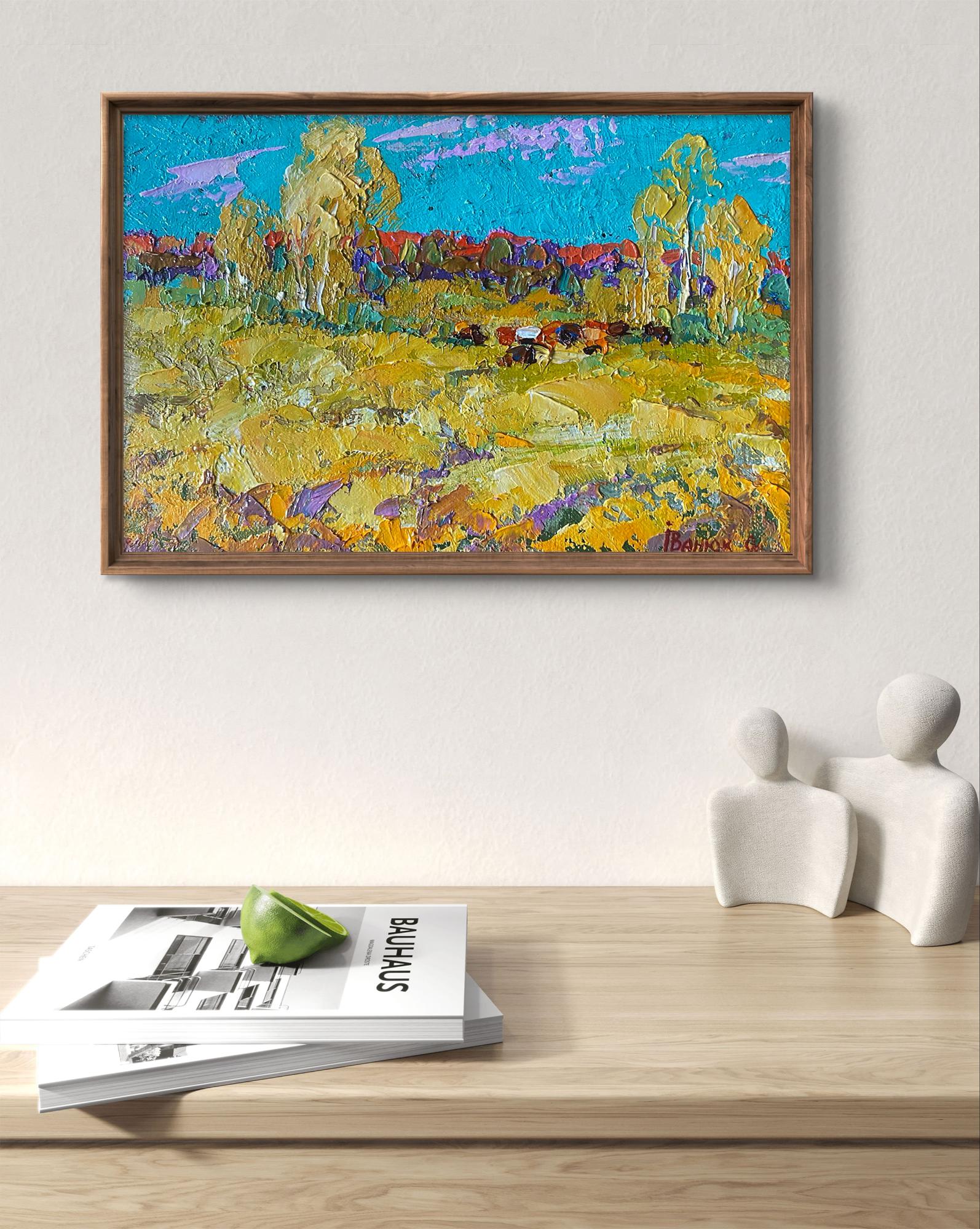 The painting "Bows in Autumn" is a vivid portrayal of nature transitioning into the golden hues of autumn. The canvas features a picturesque rural scene, with gentle hills and clusters of trees set against a bright turquoise sky. The composition is lively and dynamic, capturing the essence of a calm autumn day with its rich textures and harmonious colors. In the foreground, soft earthy tones of yellow, gold, and ochre create a sense of open fields, reflecting the changing landscape of the season. The middle ground is filled with a group of cattle grazing peacefully, adding a touch of pastoral life to the scene. These small, detailed figures bring movement and vitality to the painting, emphasizing the bond between nature and rural life. The trees are depicted in warm autumnal shades, with yellow and orange foliage standing out against the deep greens and purples of the background. The contrast between the cool sky and the warm ground creates a balance of color and atmosphere, giving the painting a sense of depth and tranquility. The sky is a striking shade of turquoise, with soft purple clouds drifting across it, adding a touch of whimsy and dreamlike quality to the landscape. The light brushstrokes used for the sky contrast with the thicker, textured strokes of the trees and ground, creating a tactile and immersive experience for the viewer. "Bows in Autumn" is a celebration of nature's seasonal beauty, brought to life through vibrant colors and rich textures. The painting captures a peaceful moment in rural life, inviting viewers to appreciate the simple pleasures of the changing landscape. It is a testament to the timeless charm of the countryside, offering a glimpse into the harmony between nature and rural life.