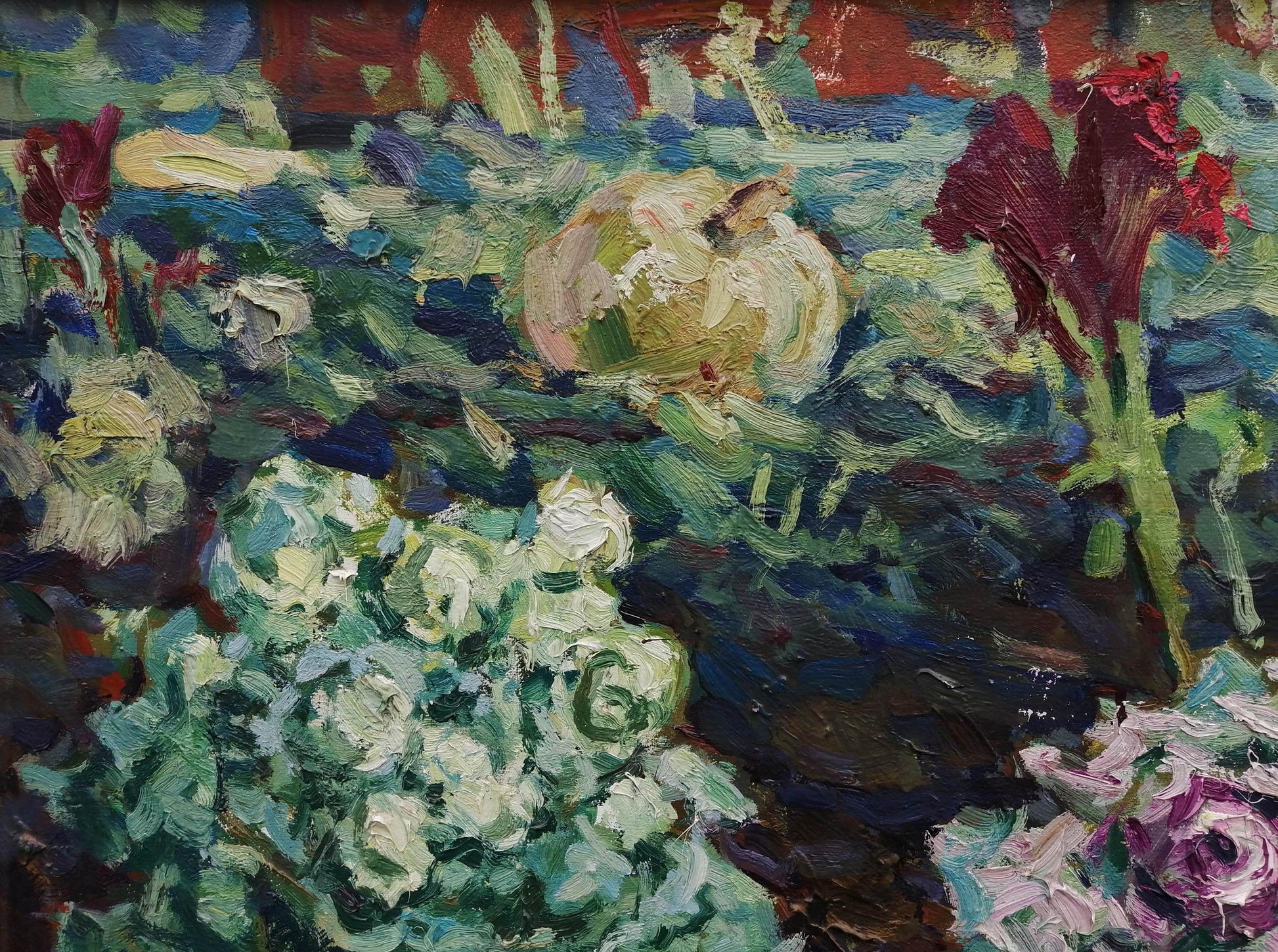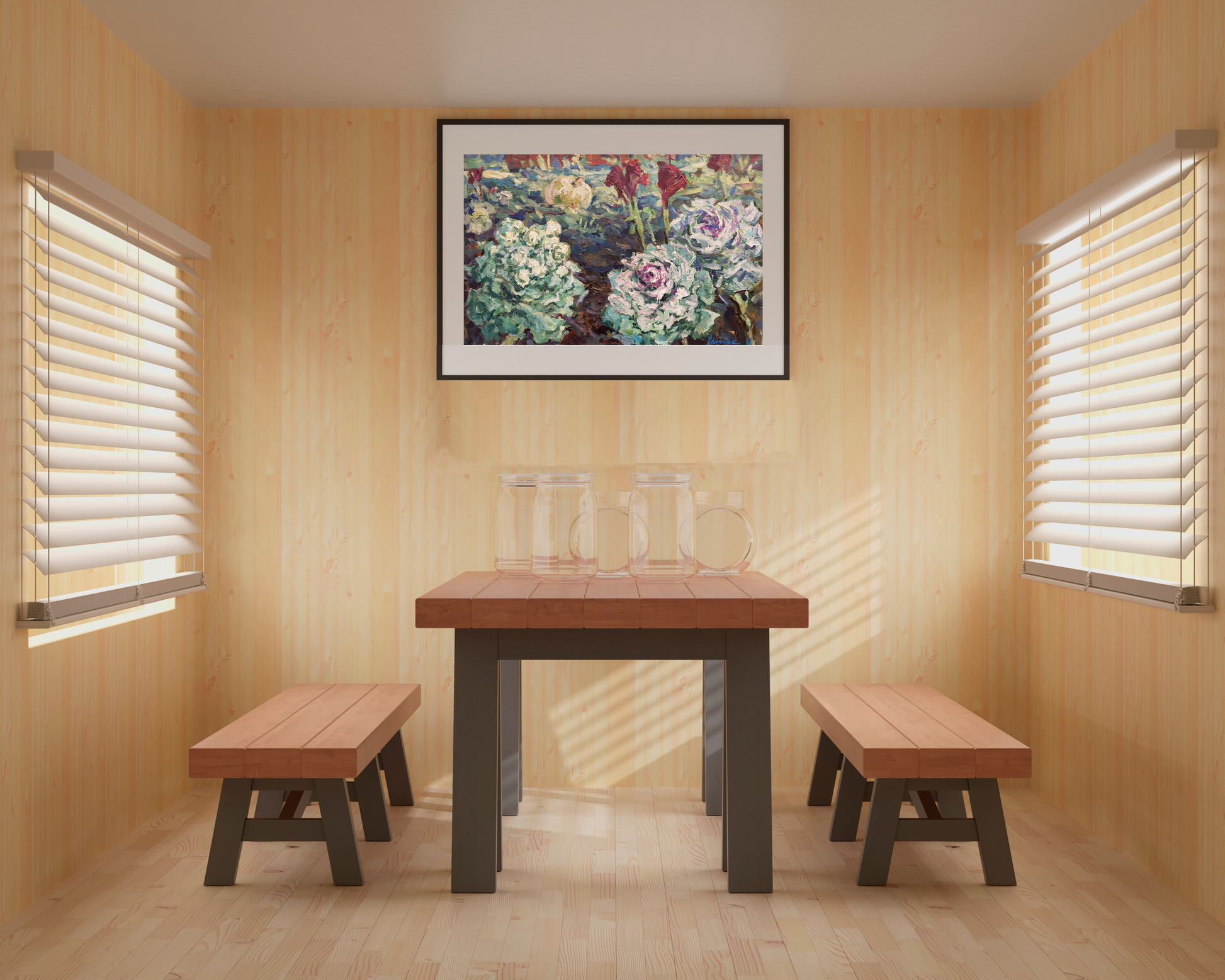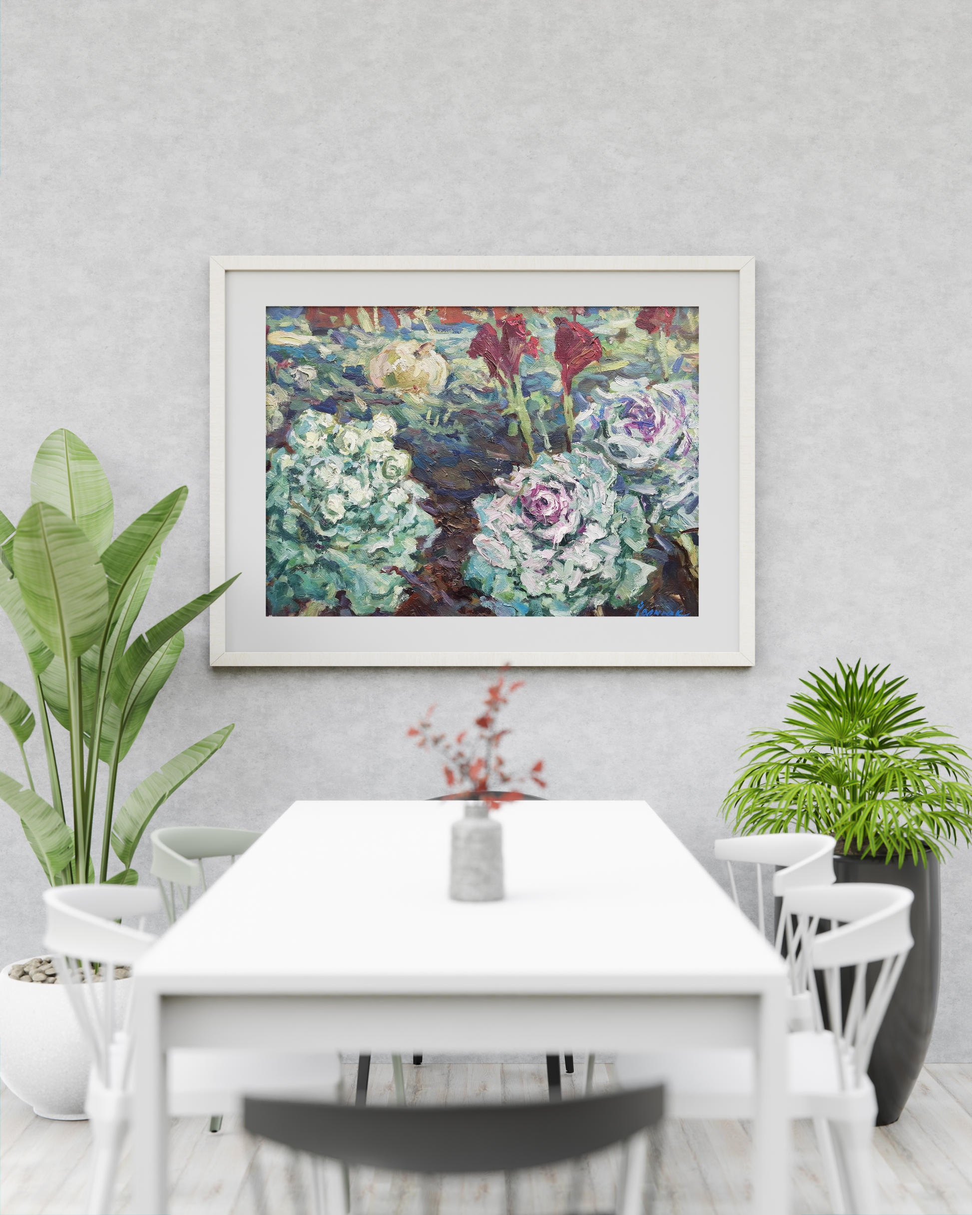 This oil painting "Cabbage in the garden" is a beautiful depiction of fresh cabbages in a garden. They are depicted as large flowers, which makes for an interesting and unique painting. The forks of cabbage are right in the garden, making it a great addition to any kitchen or dining room.