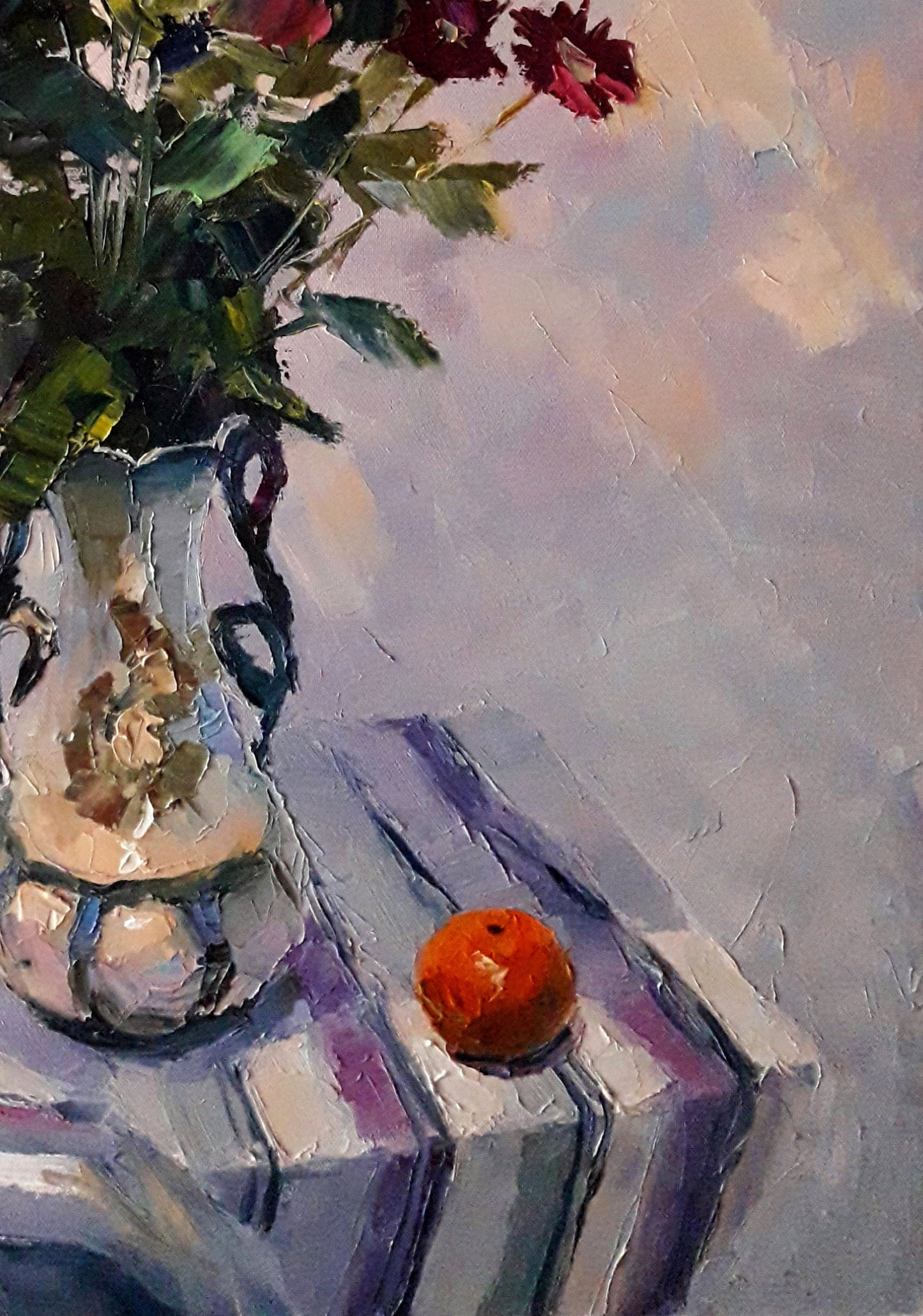 Immerse yourself in the elegance of "Chrysanthemum Bouquet," a mesmerizing oil painting by Serdyuk Boris Petrovich. This artwork, a highlight in our Collection of Still Lifes and Collection of Flowers, showcases a breathtaking bouquet of chrysanthemums poised gracefully on a table within an exquisite apartment setting. The artist's mastery in capturing the intricate beauty and vibrant colors of the chrysanthemums brings a luxurious and serene atmosphere to any space. Designed for those who cherish the subtle elegance of nature and wish to infuse their home with its timeless beauty, this painting stands as a testament to the artist's skill and the enchanting allure of chrysanthemums.