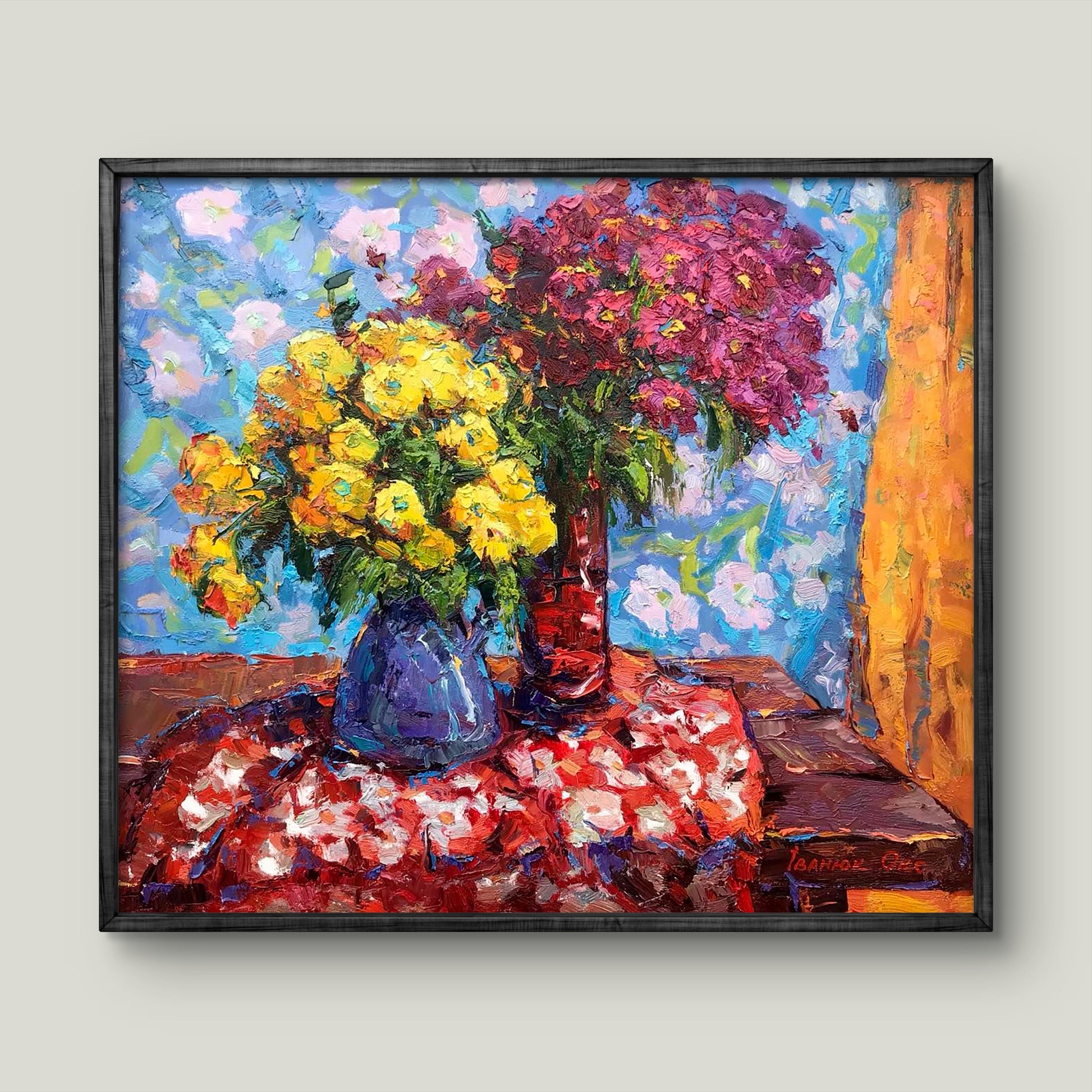This painting showcases two vibrant bouquets of chrysanthemums, one red and one yellow, each in a multi-colored vase. The lively colors and dynamic composition make it a focal point in any room.