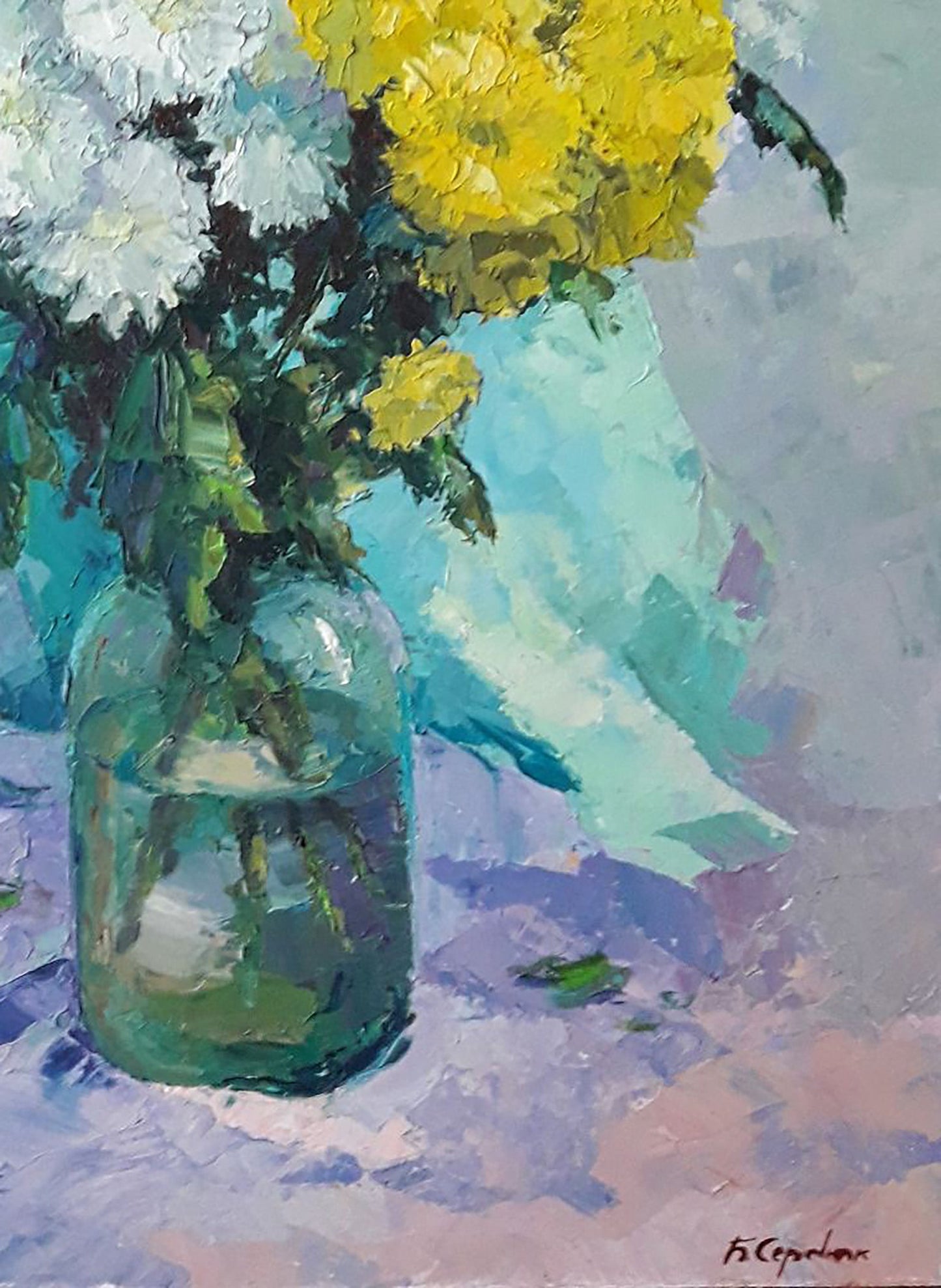 Elevate the ambiance of your space with "Chrysanthemums," a stunning oil painting by the renowned artist Serdyuk Boris Petrovich. This artwork, a standout piece in our Collection of Still Lifes and Collection of Flowers, showcases the ethereal beauty of chrysanthemums. The bouquet, with its delicate white and yellow flowers, is beautifully presented in a glass jar, creating a captivating contrast that enhances their natural elegance. Perfect for any setting, this painting is a testament to the timeless beauty of flowers and the skill of the artist.